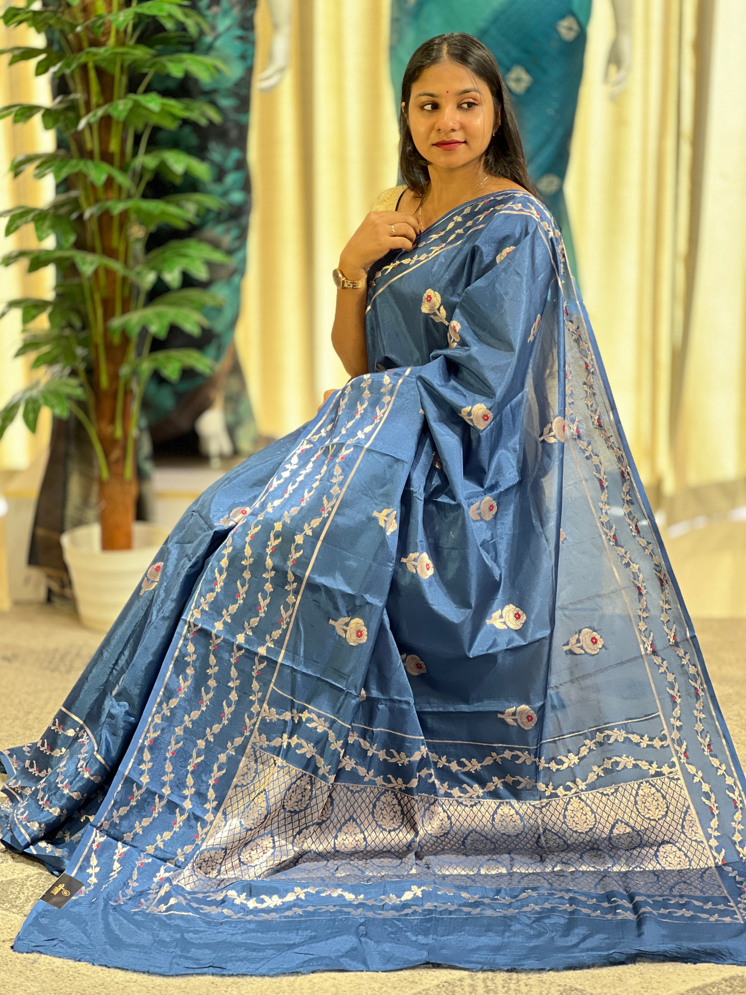 - Style: Scattered Zari Floral Pattern, Left Pattern Boreder Detailing, Brocade Pattern With Short Pallu