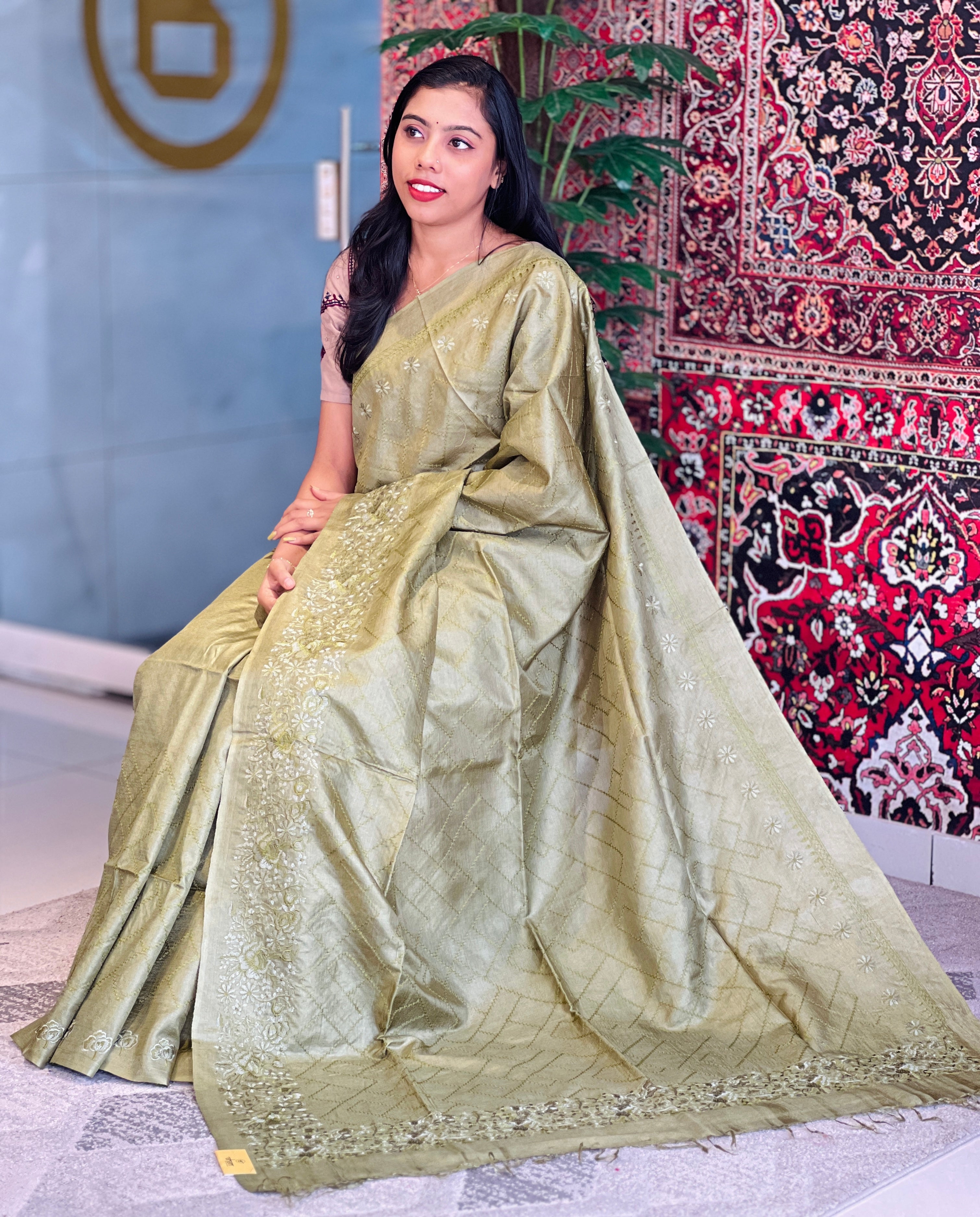 • Geometric & Floral Embroidery Detailed Tussar Saree | MNH504