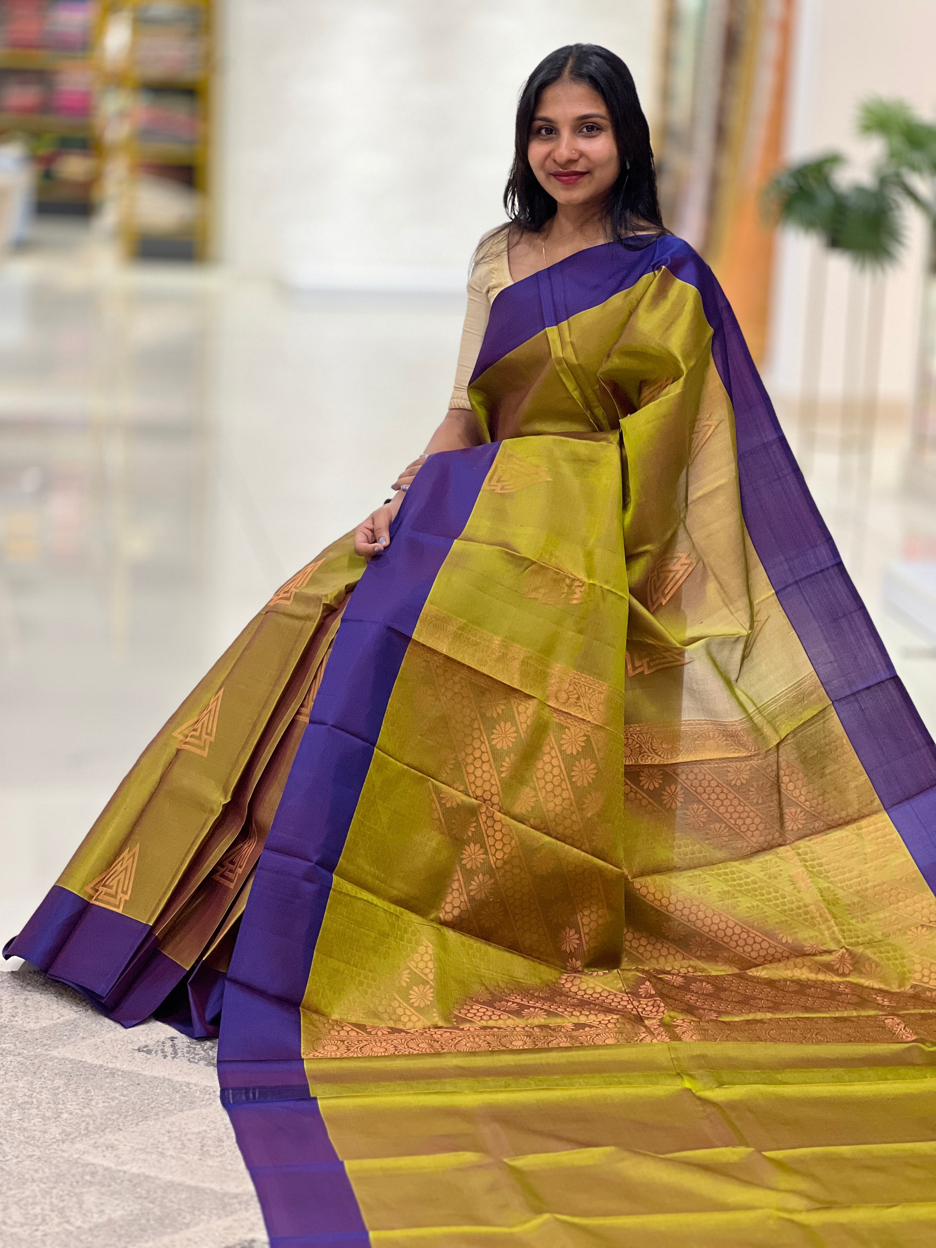 - Style: Copper Zari Weaved Geometric Patterned Butas, Floral & Diagonal Patterned Pallu, Contrast Solid Borders