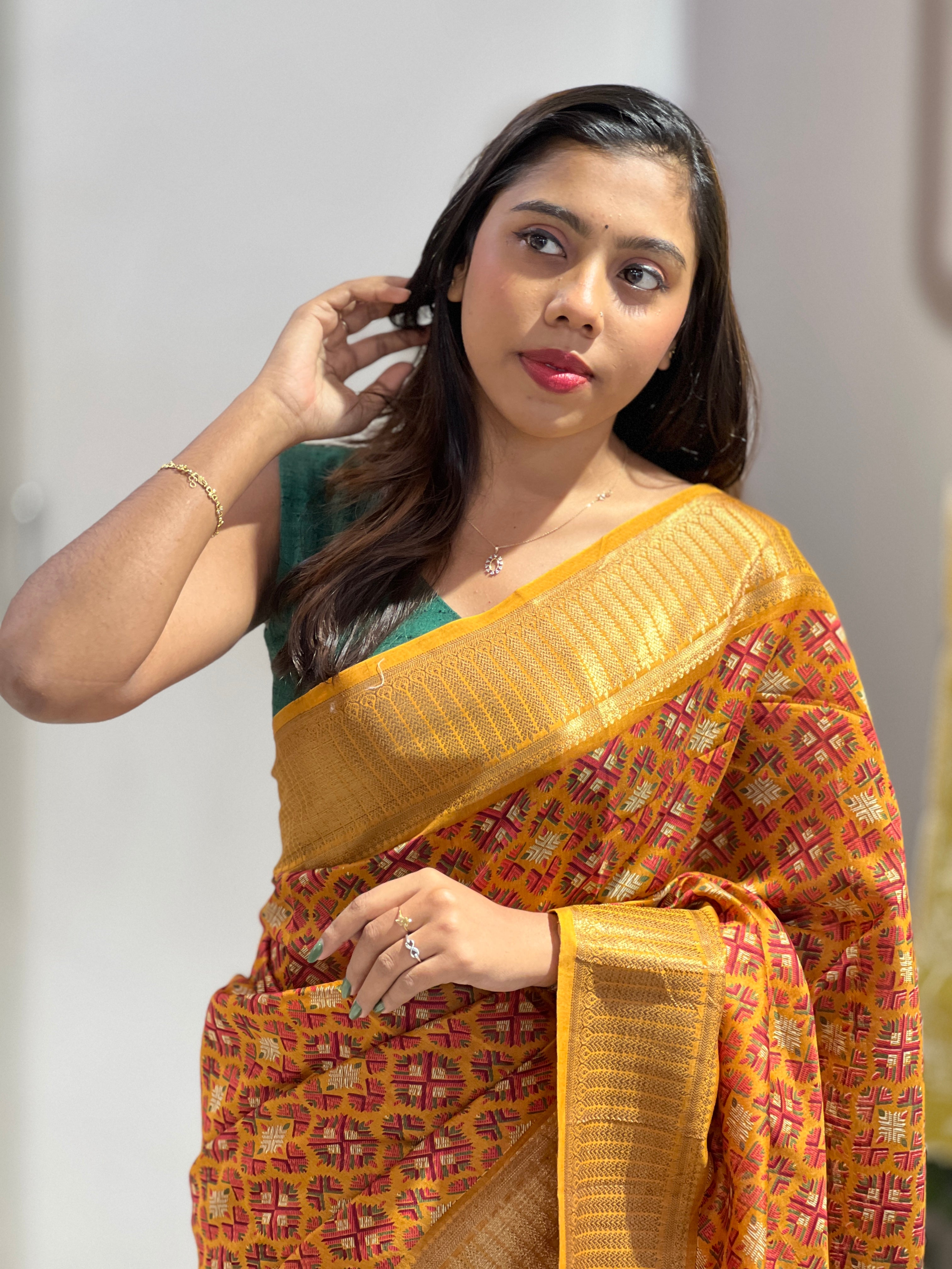 - Style: Geometric Printed, Banarasi Borders, Contrast Pallu, Zari Stripe Patterned Pallu