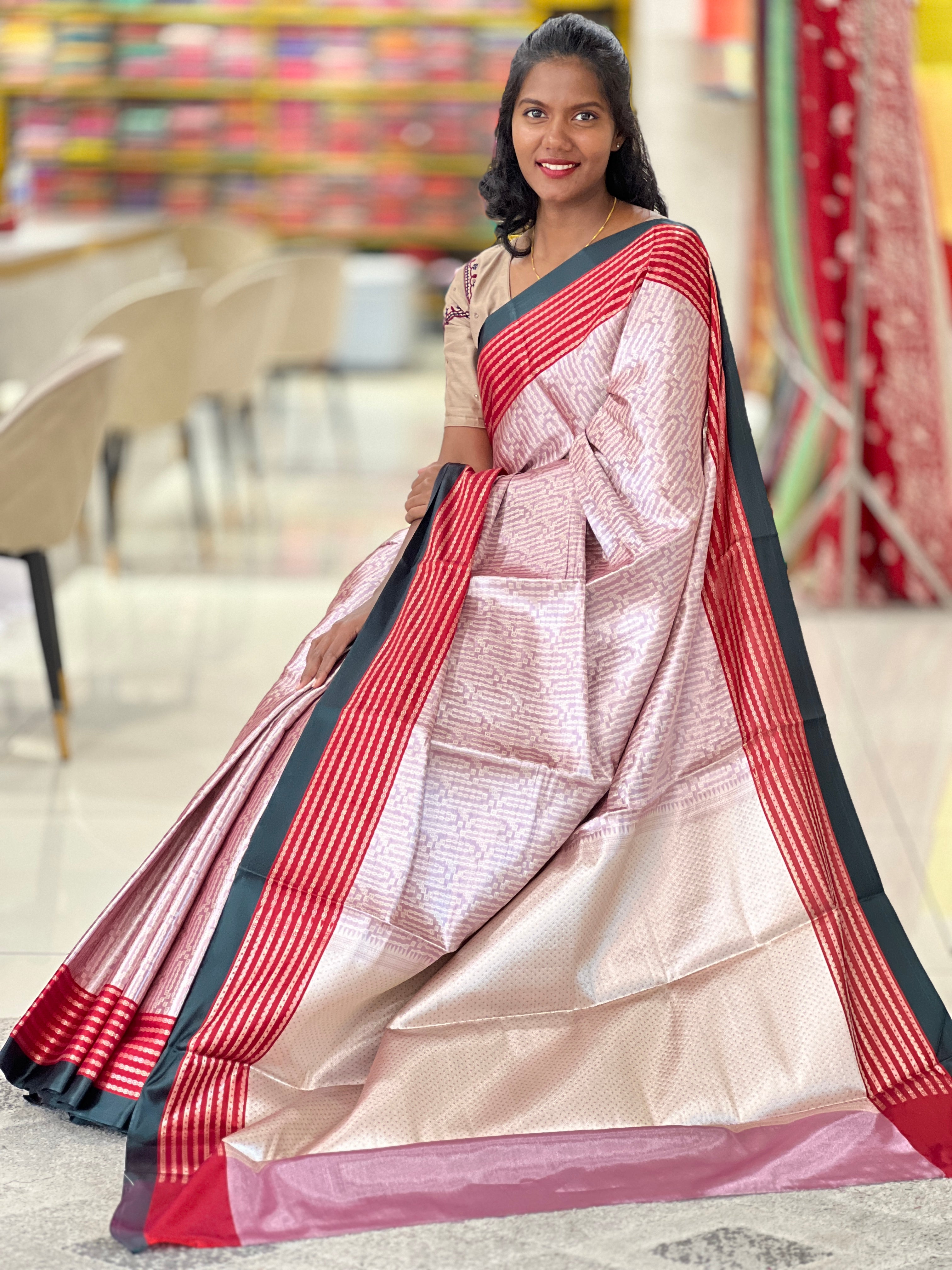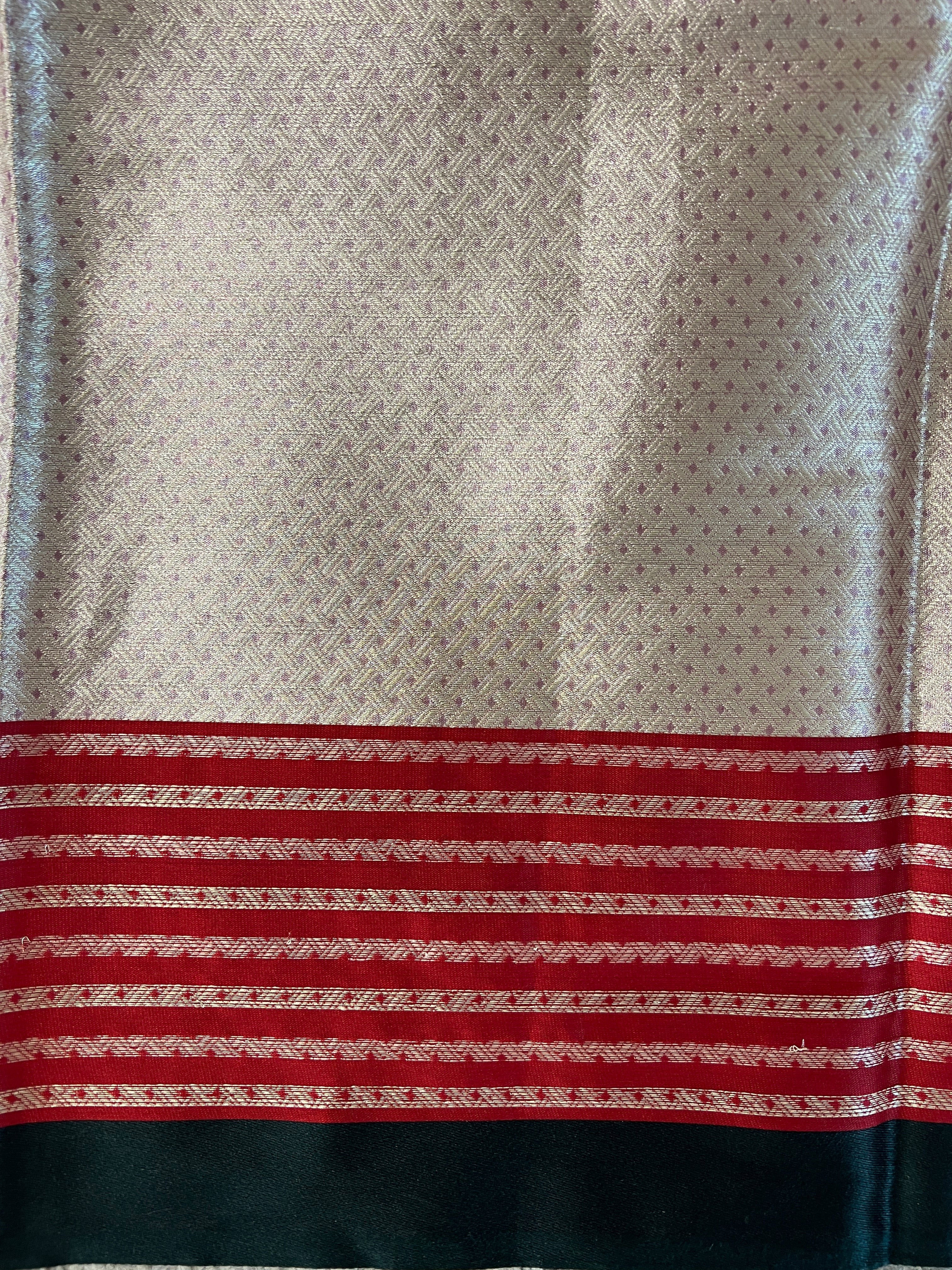 - Style: Geometrical Pattern Satin Finished Borders ,Power Loom,Chain Patterned Contrast,Sliver Zari Woven, Border,Shorts Banarasi Pallu