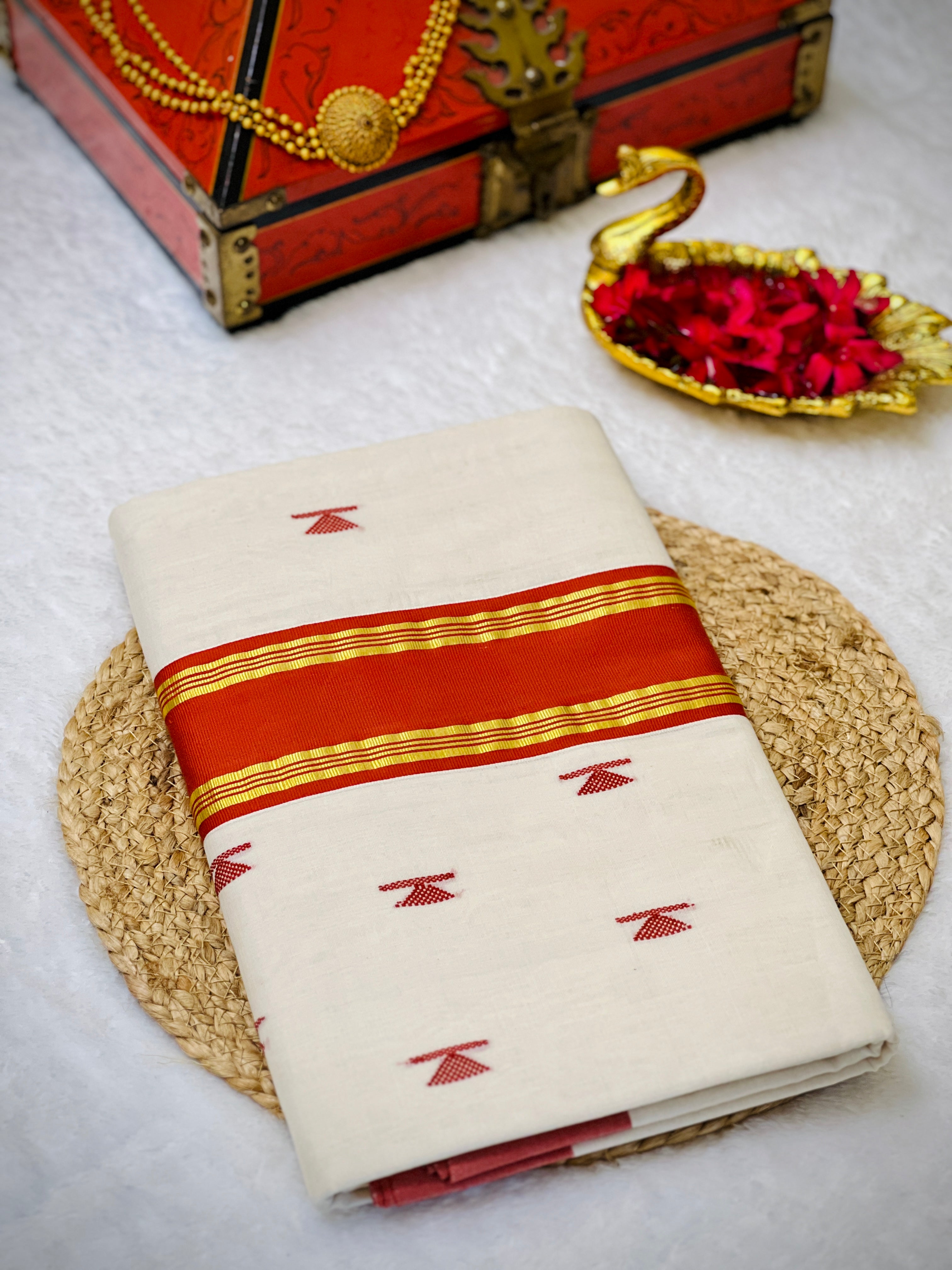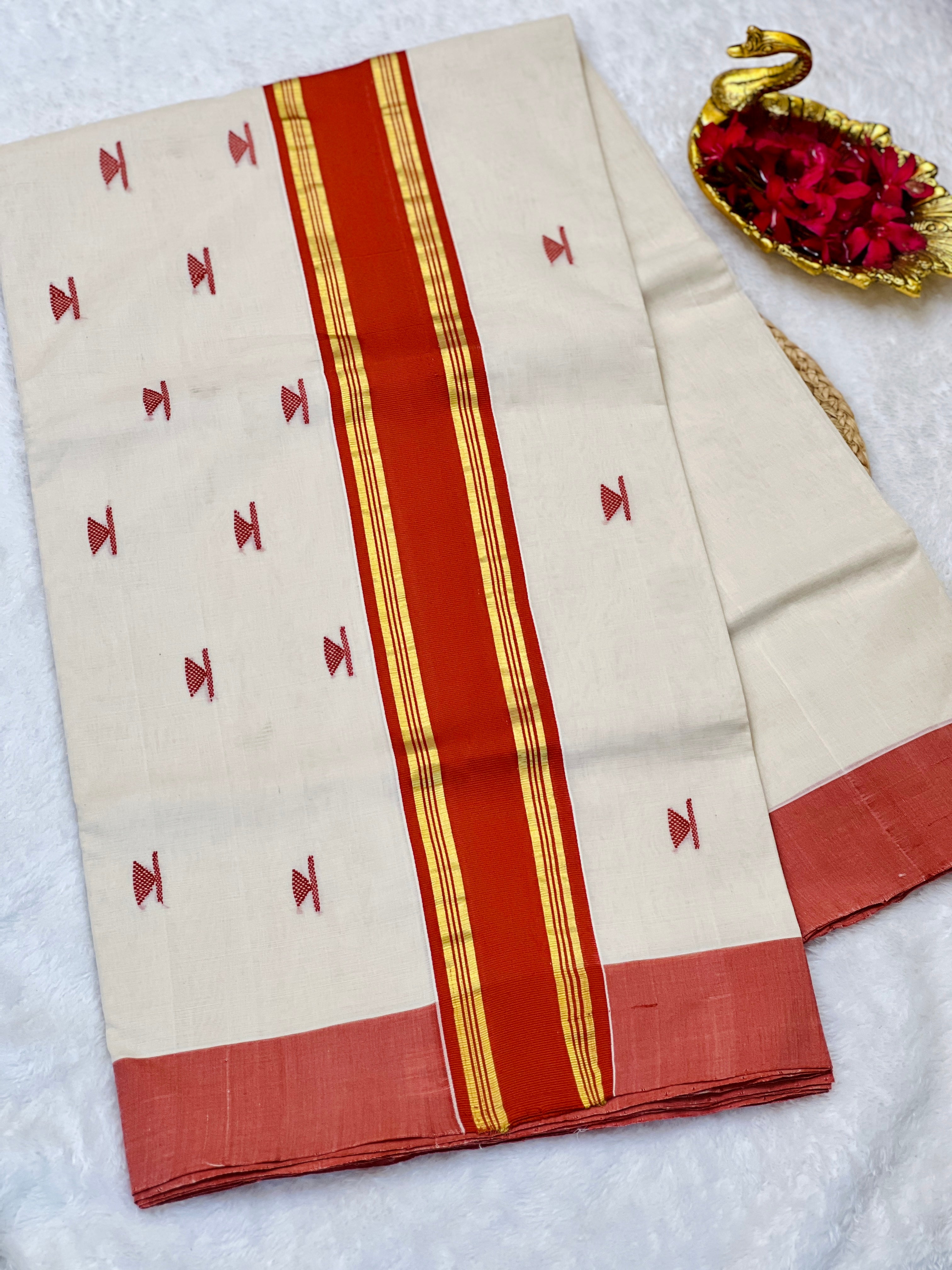 - Style: Golden Kasavu & Kara Detailing, Geometric Weaving Pattern