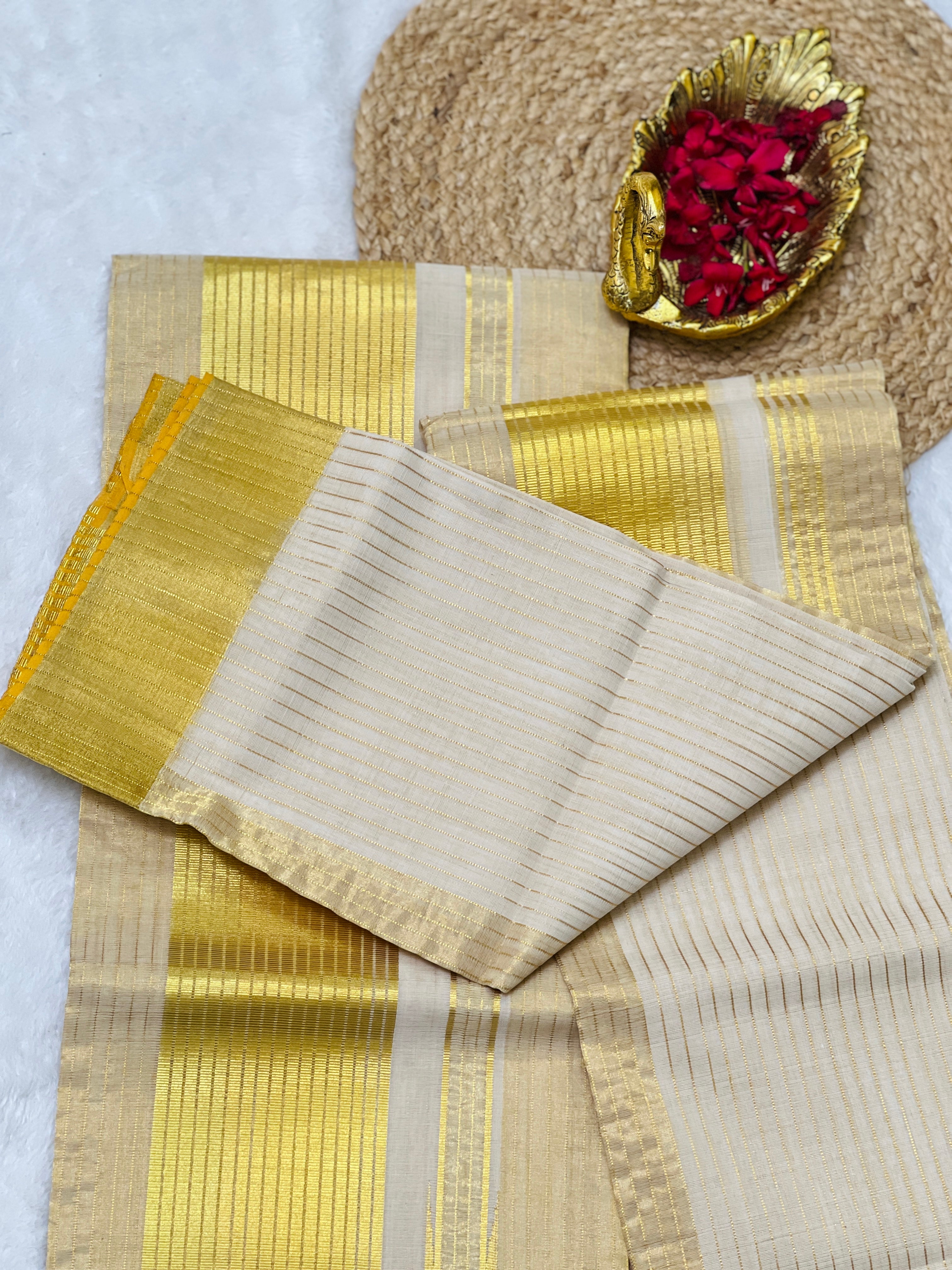 - Style: Tissue Weaved, Handloom, Golden Kasavu With Line Weaving Pattern