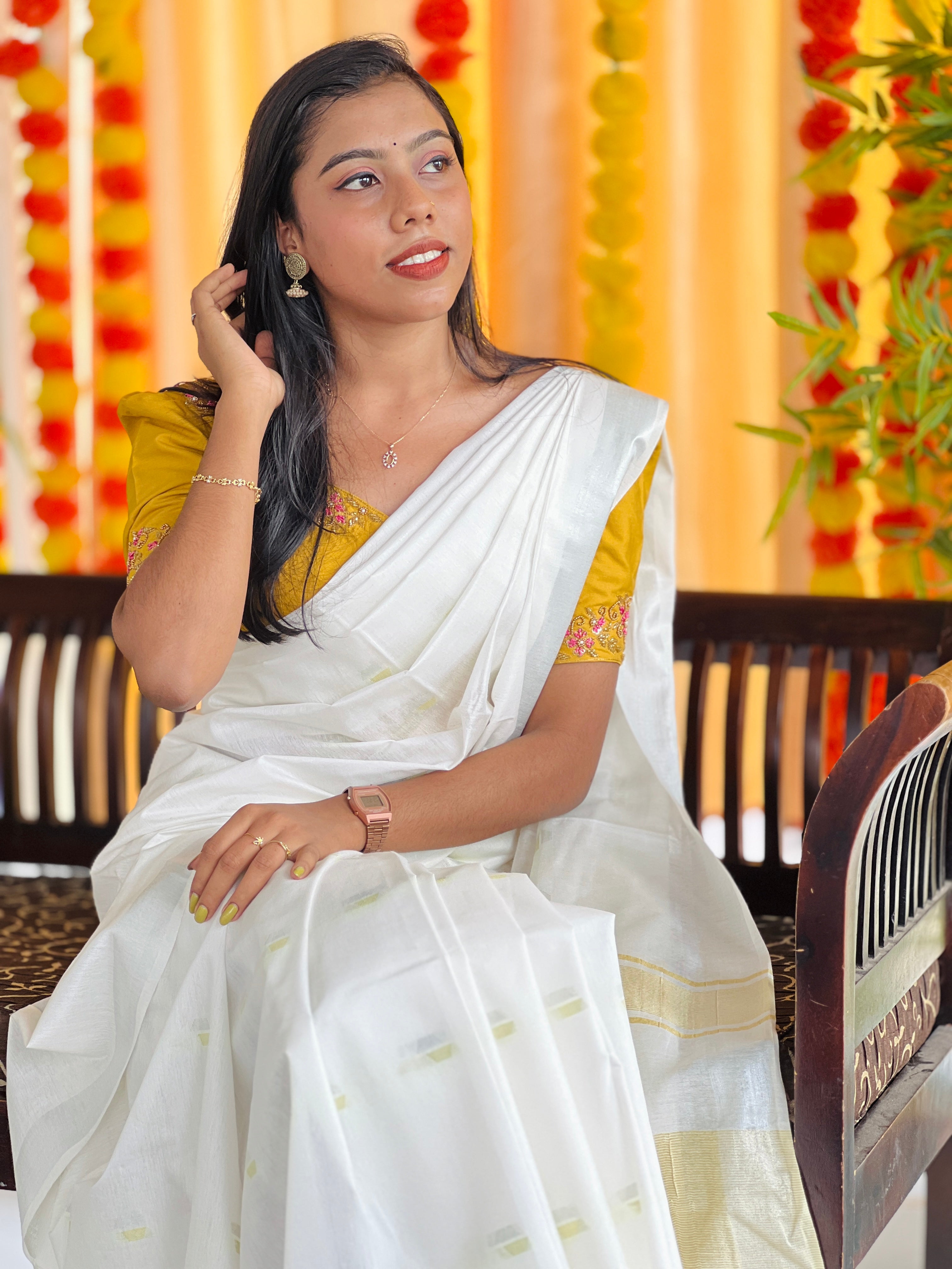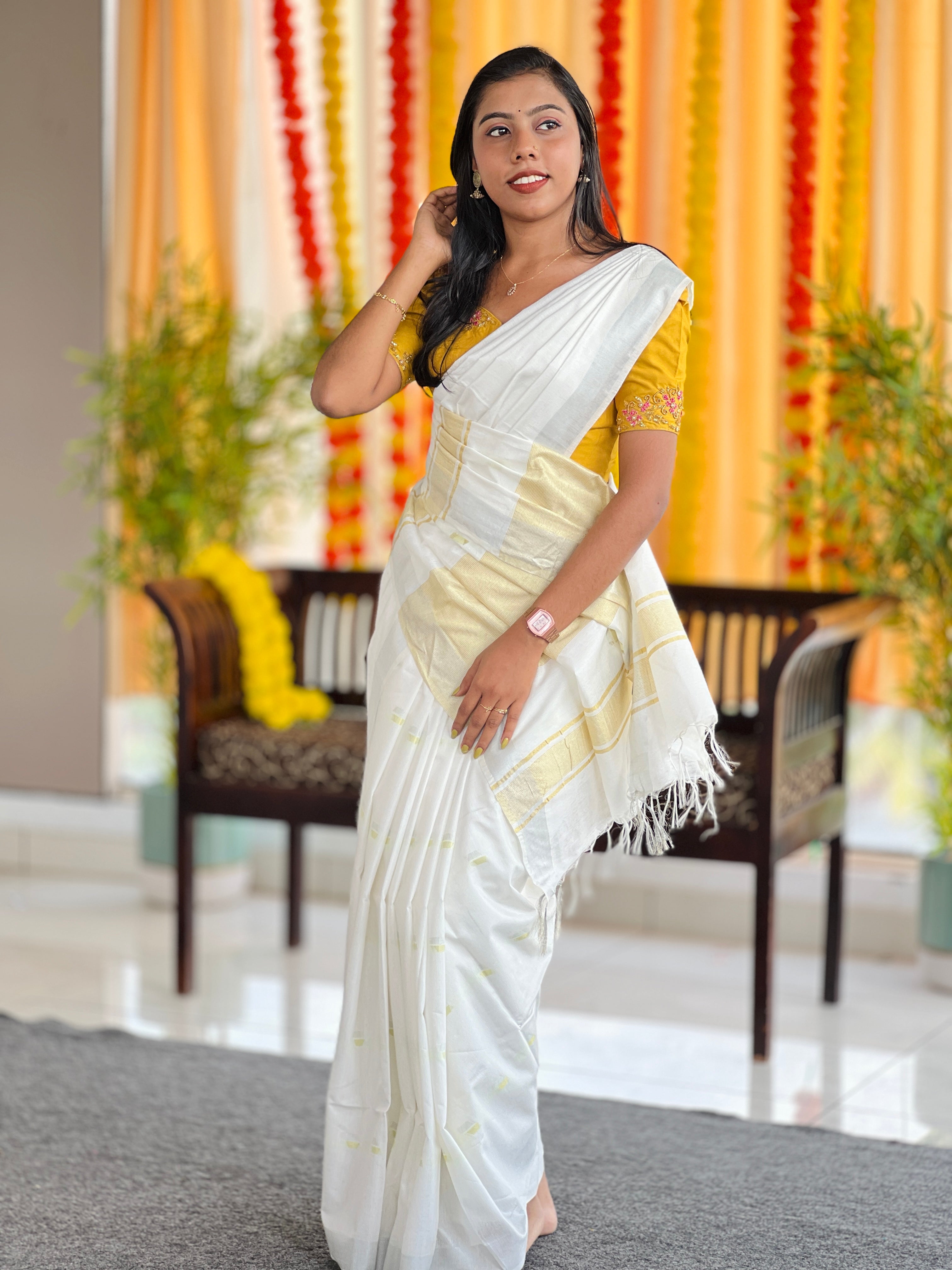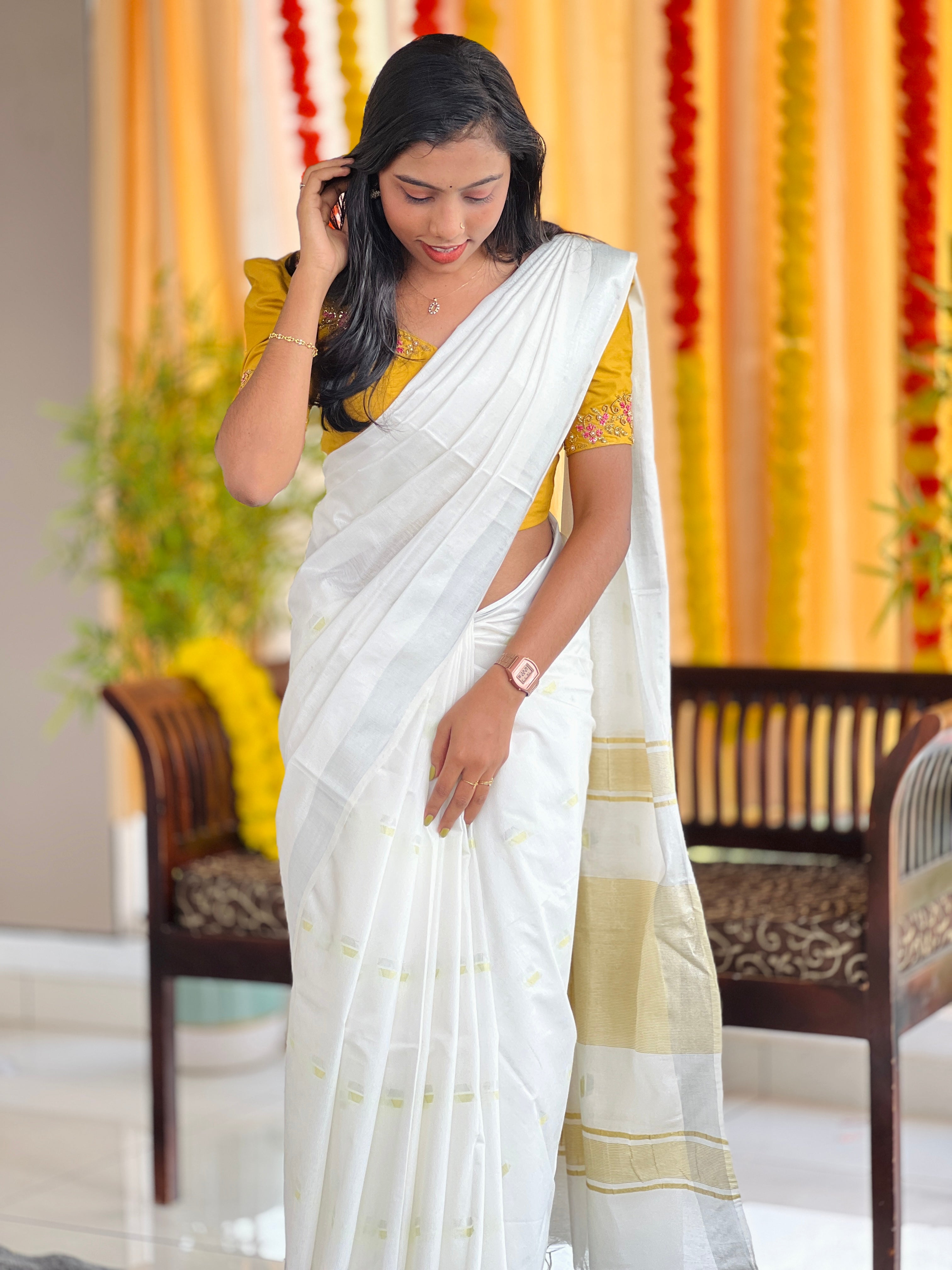 - Style: Golden & Silver Zari Weaving, Geometrical Pattern, Stripes Patterned Pallu, Silver Zari Border Detailing, Tassels Attached