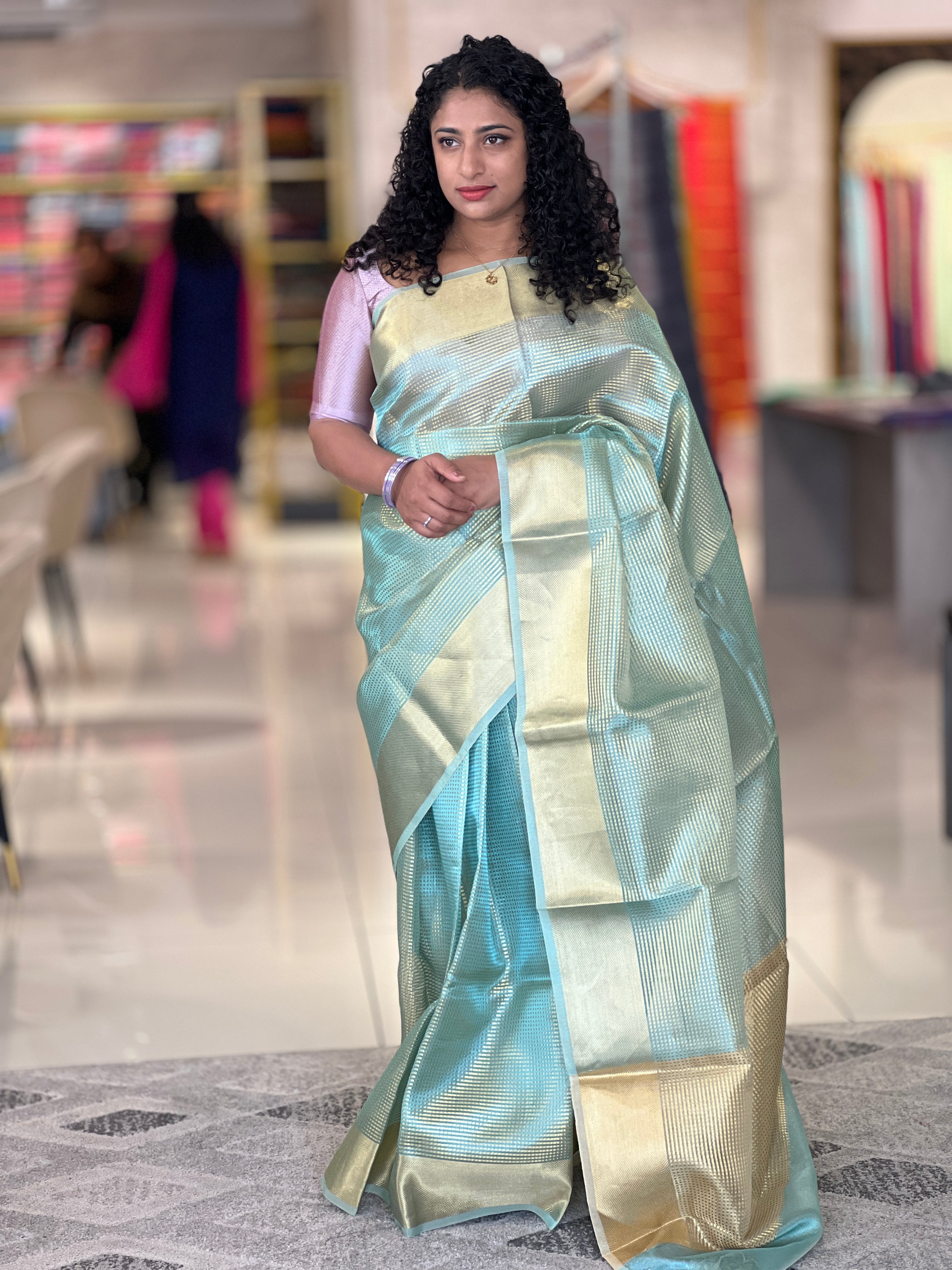 • Golden Zari Check Pattern Tissue Organza Saree | NN235