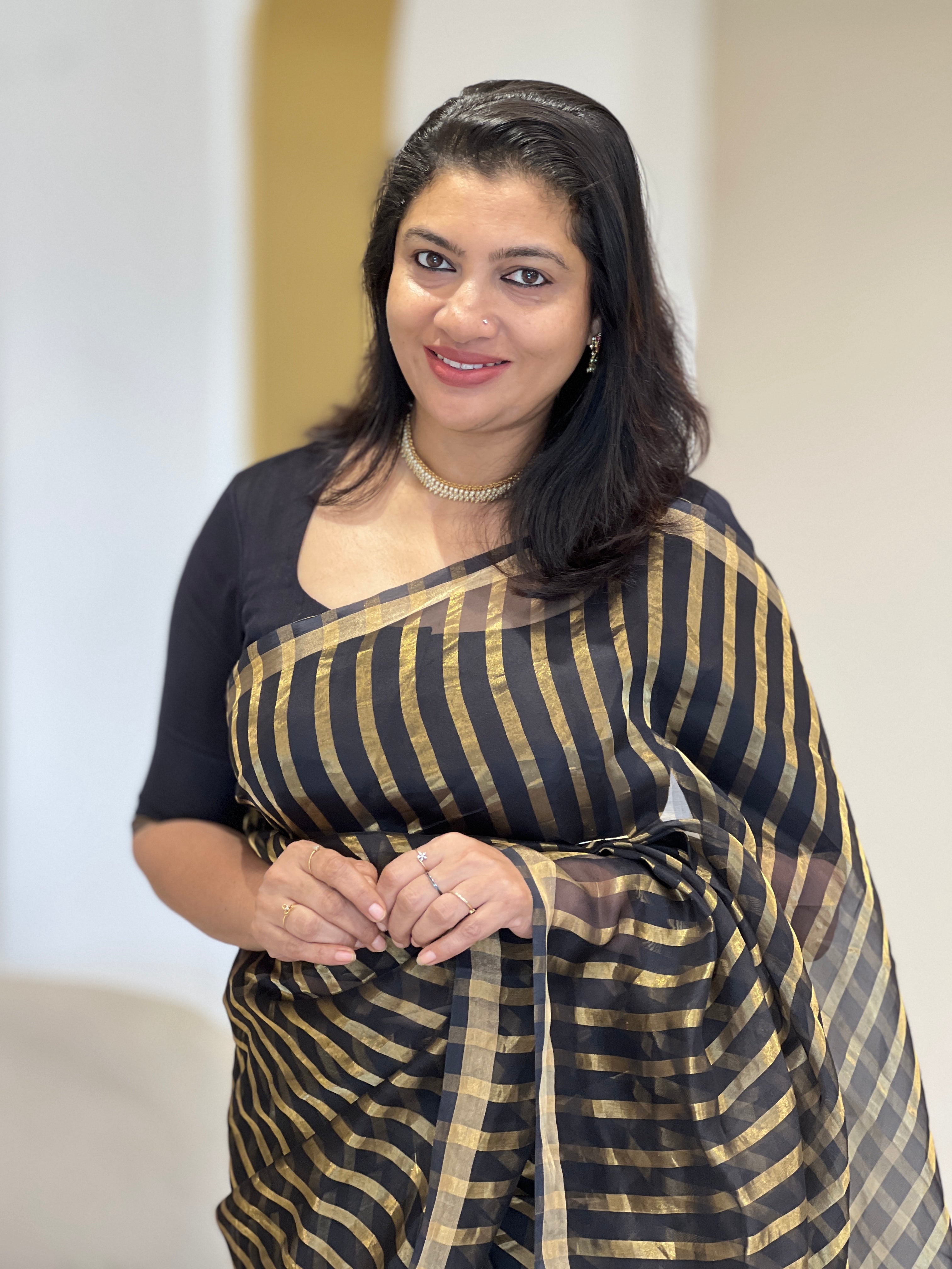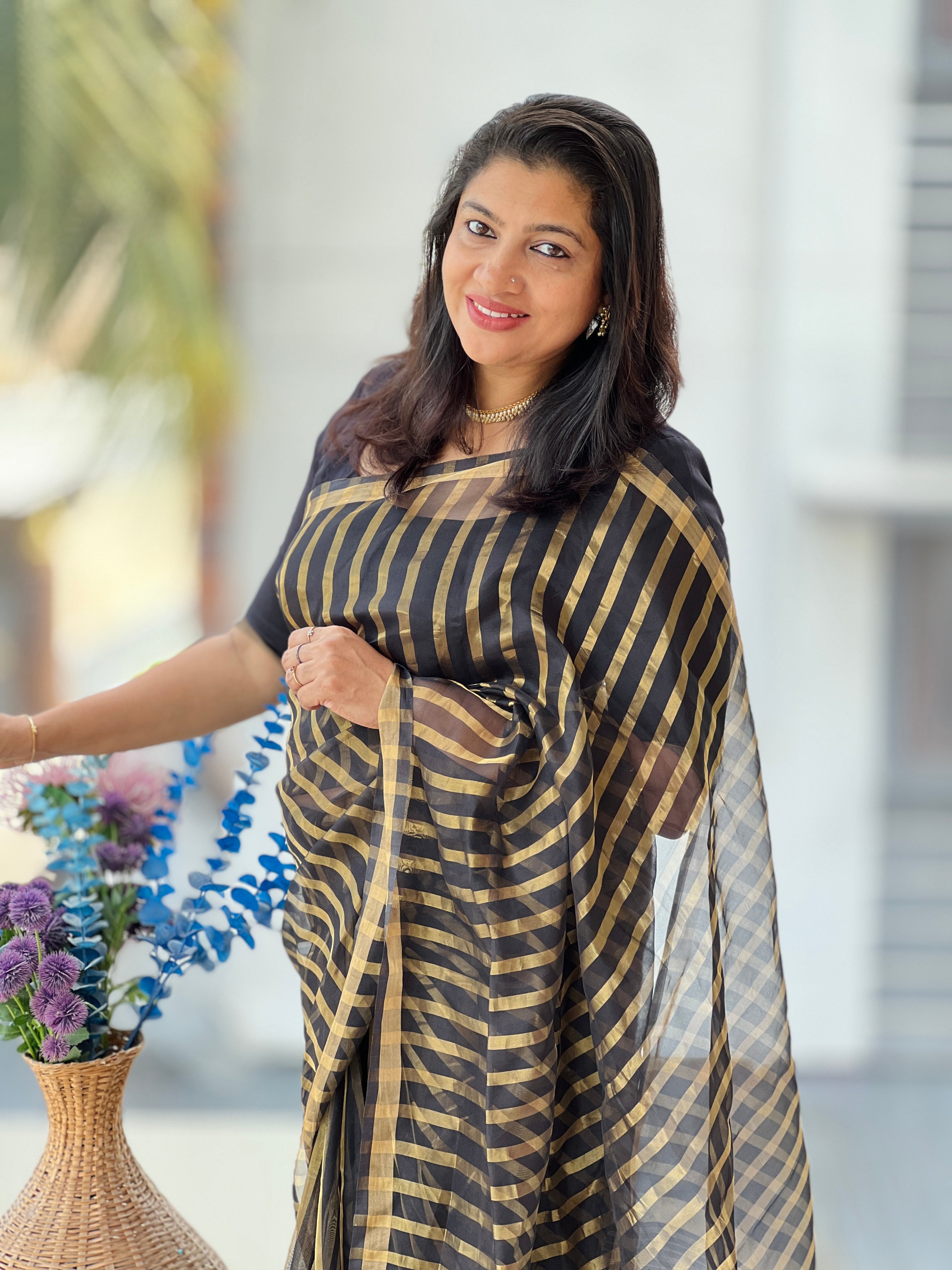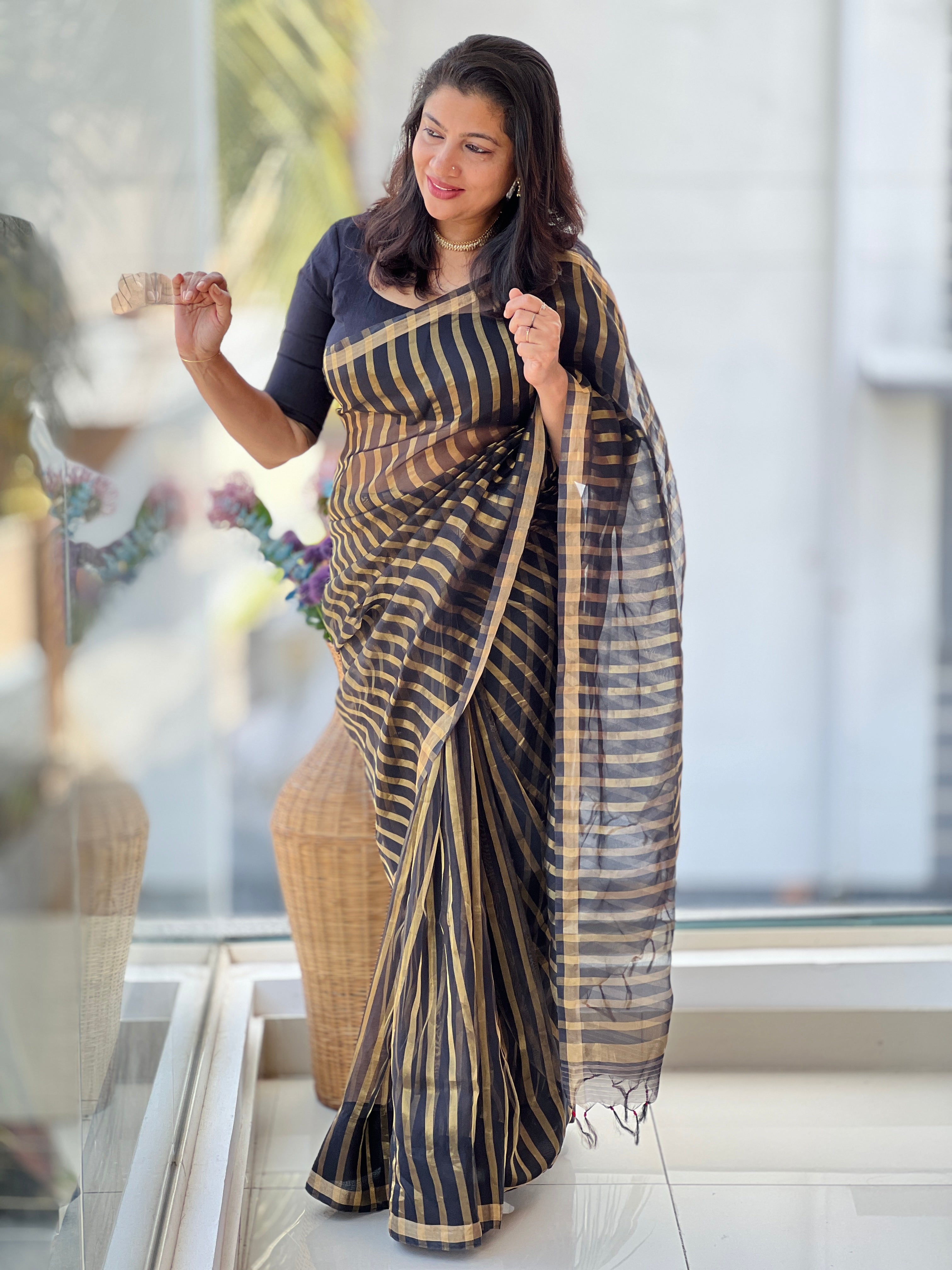 - Style: Golden Zari Stripe Pattern, Zari Thin Borders, Short Pallu