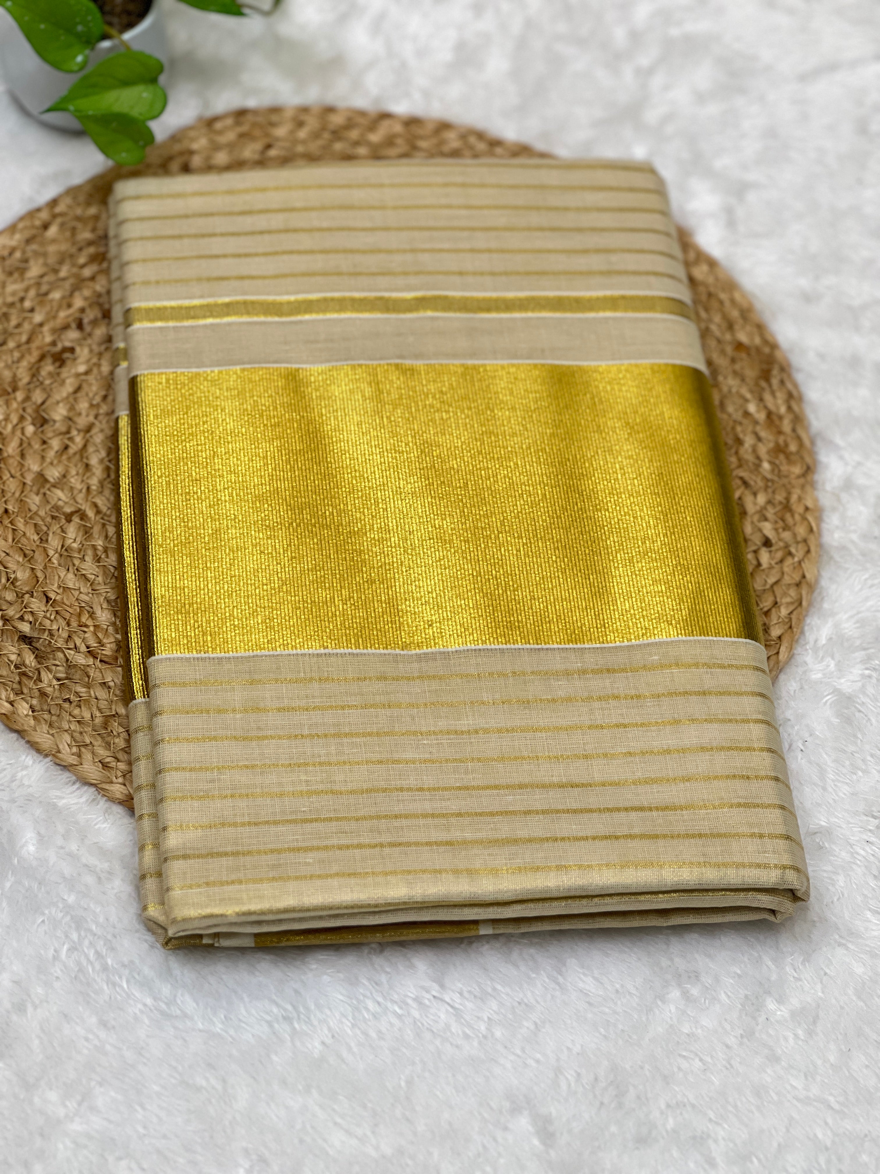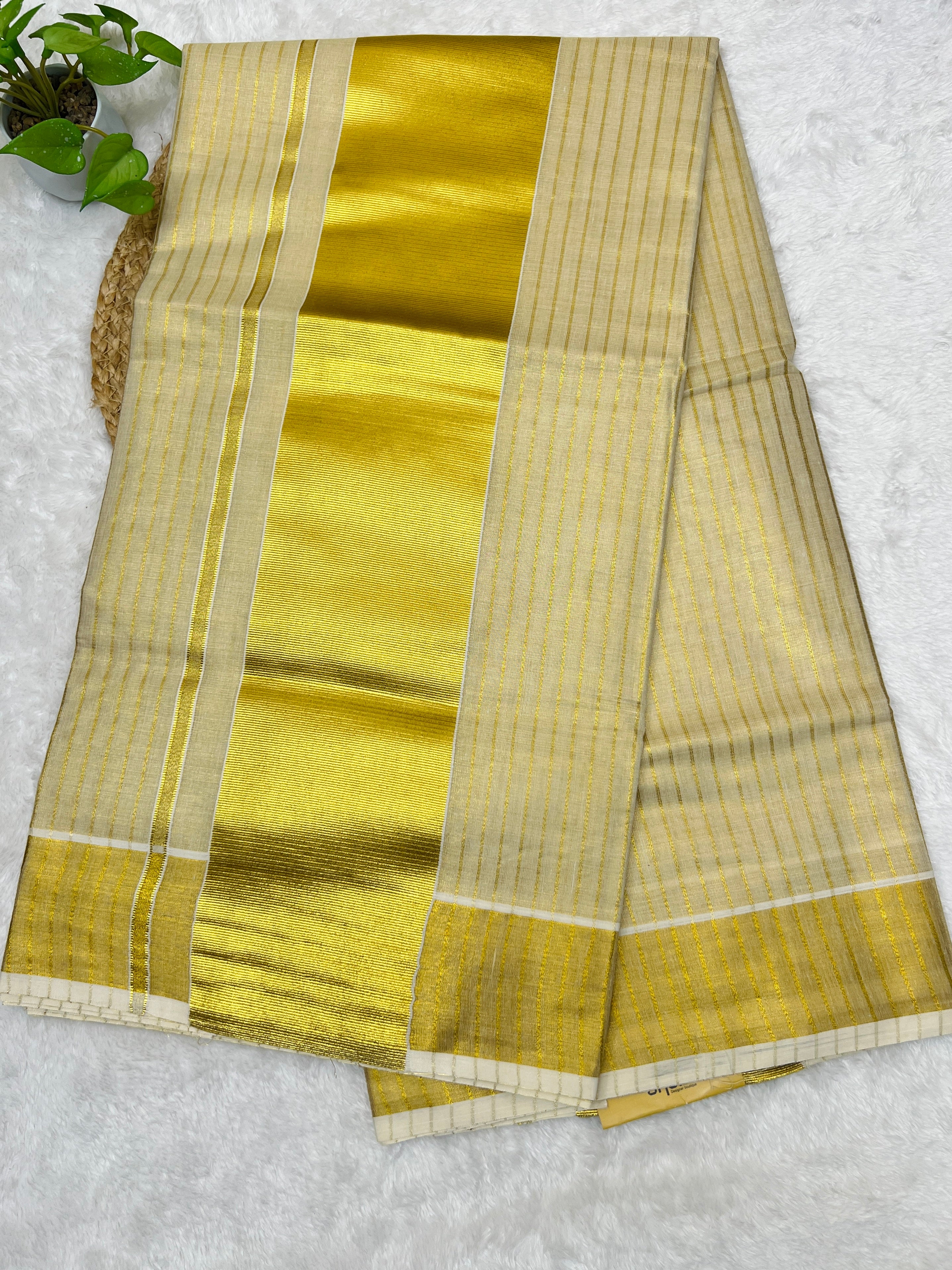 - Style: Golden Zari Stripe Weaving Pattern, Golden Kasavu Borders