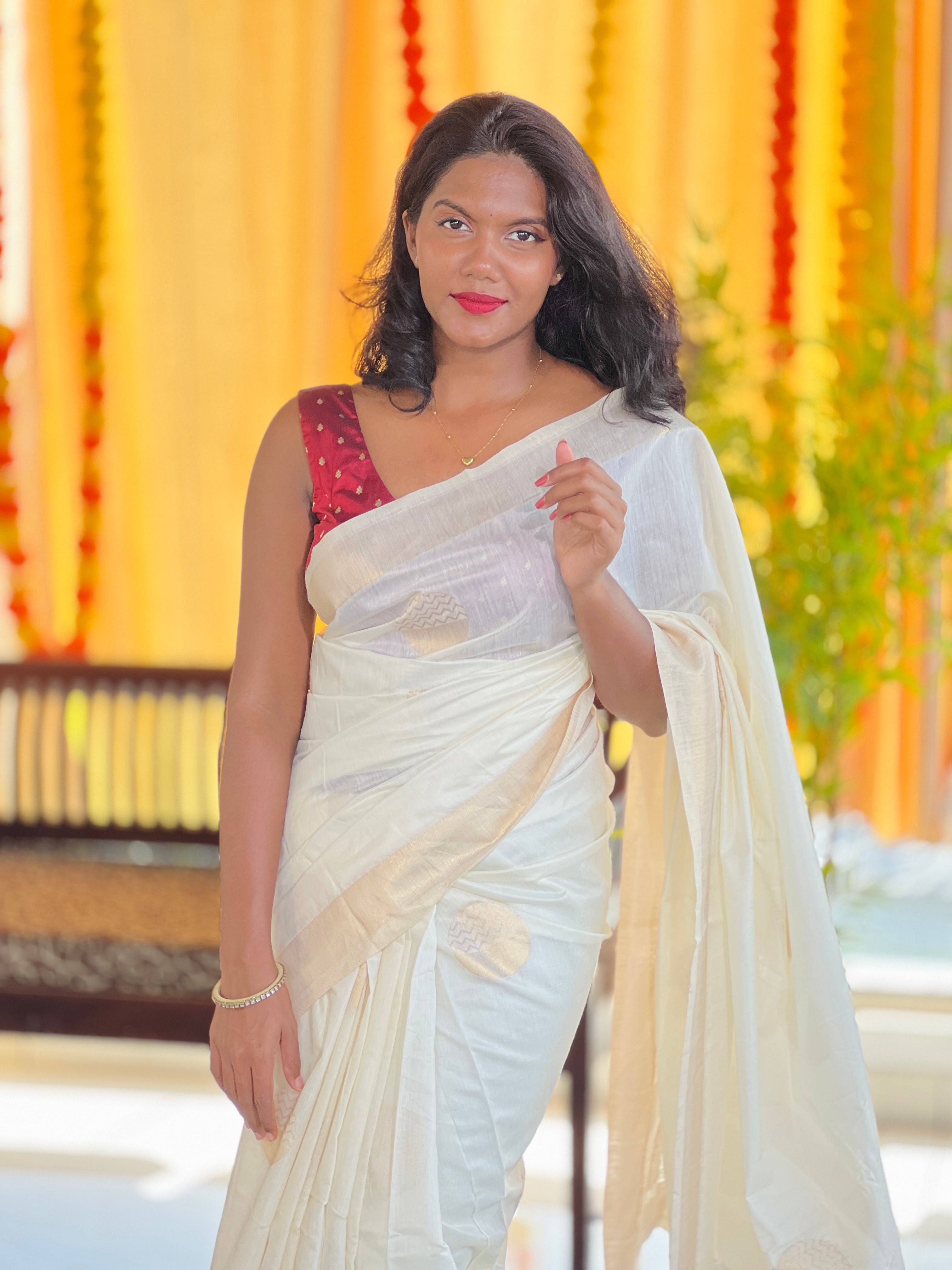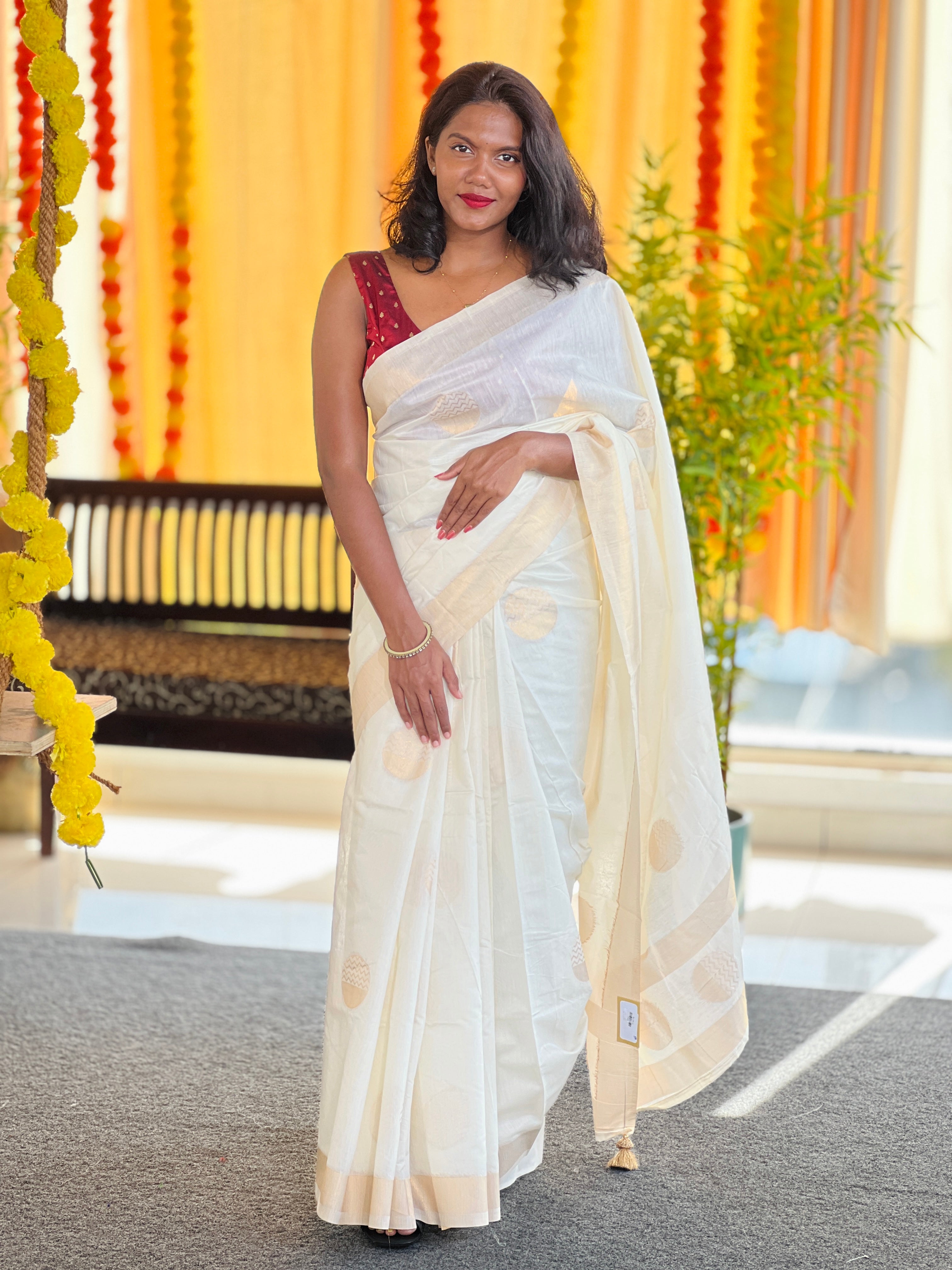 - Style: Golden Zari Weaved, Scattered Polka Dot With Zig Zag Pattern, Border Detailing