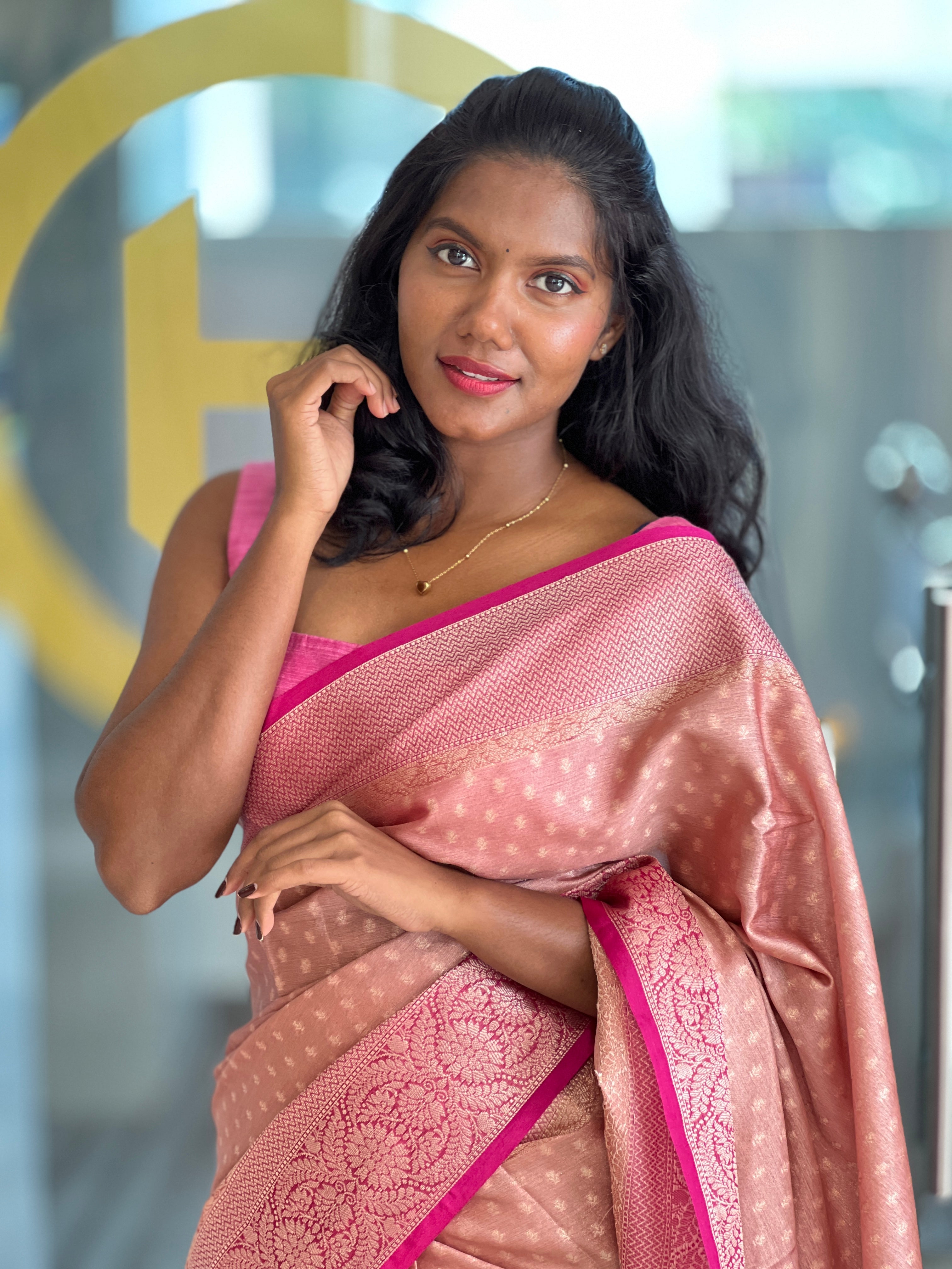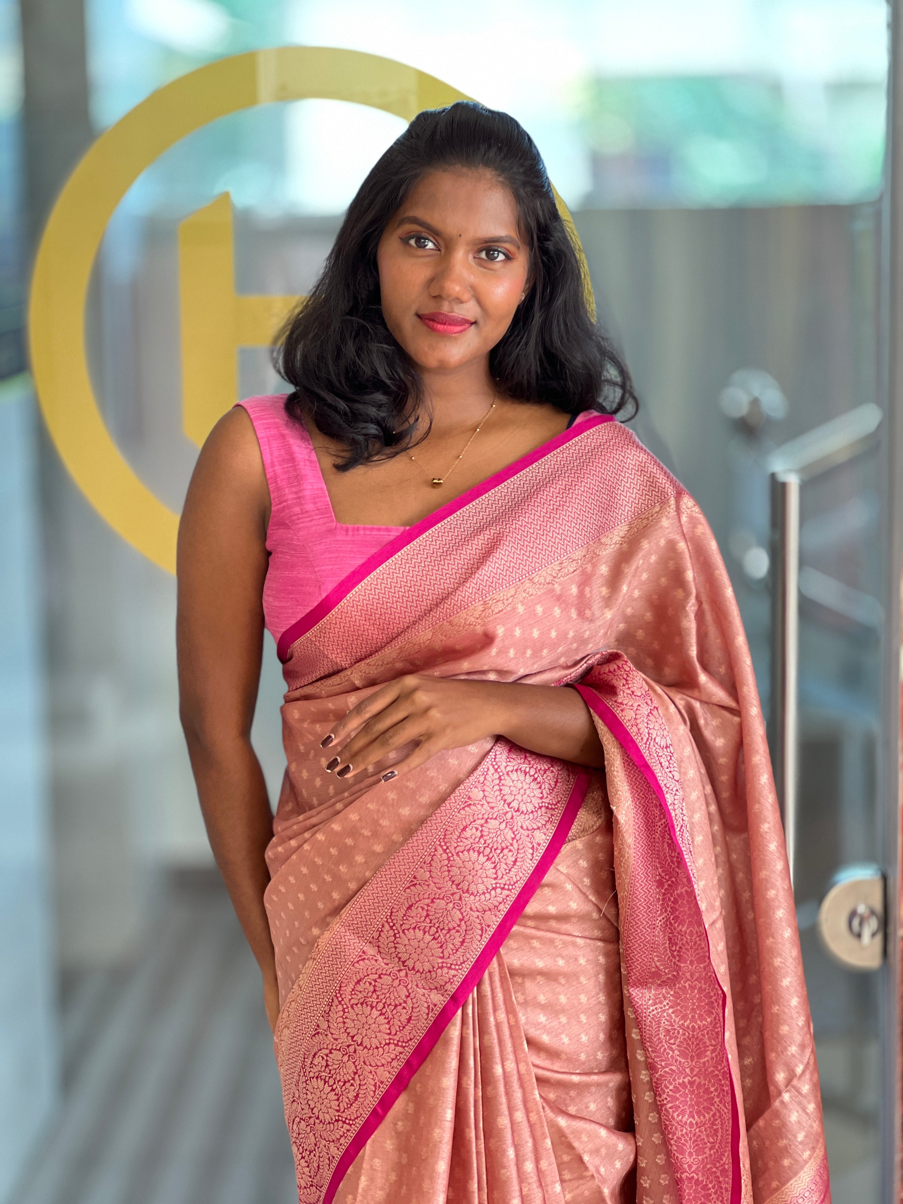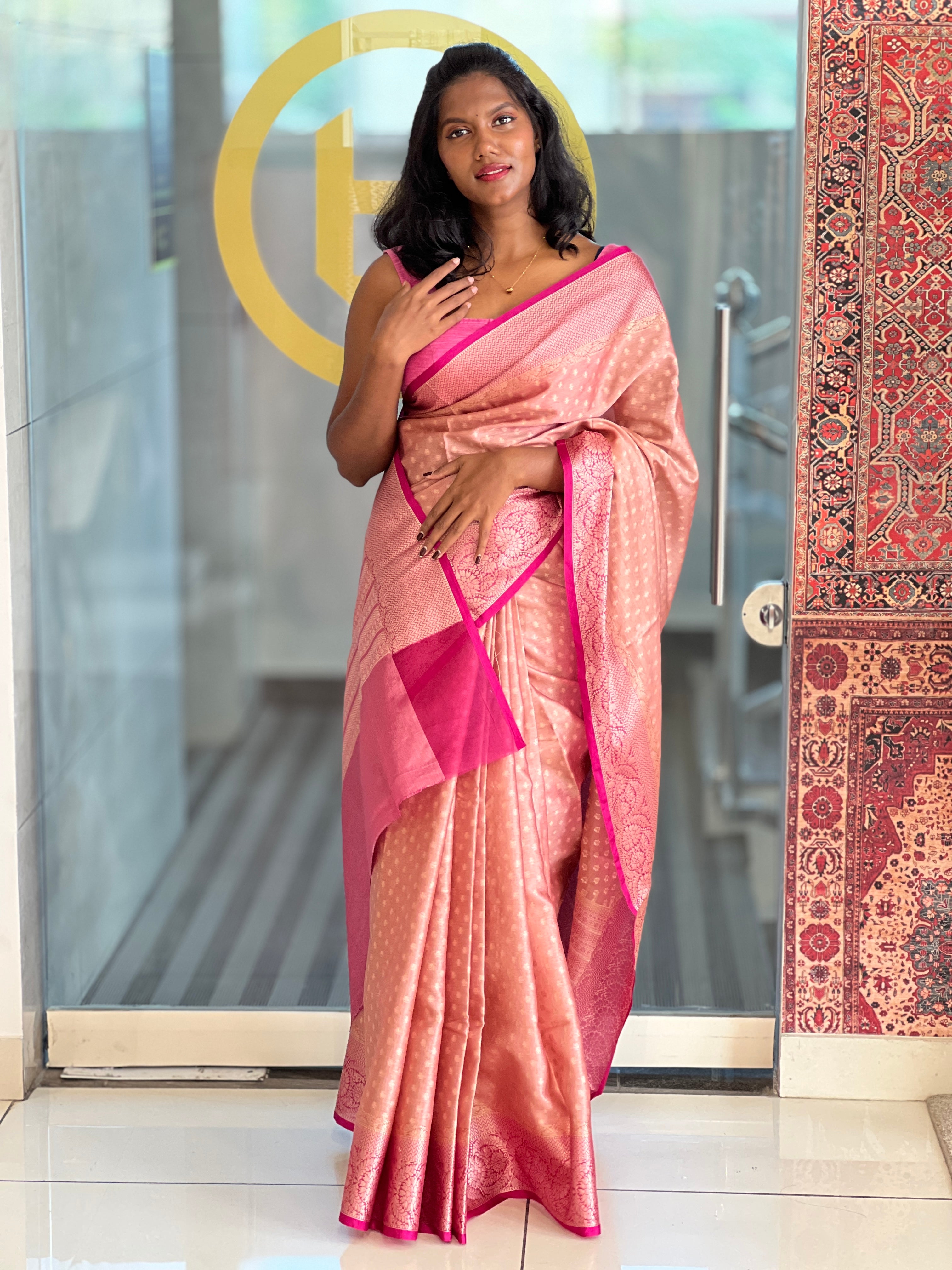 - Style: Golden Zari Weaving Style, Buta Weaving Pattern, Contrast Zigzag and Floral Border Detailing, Zari Weaved Pallu