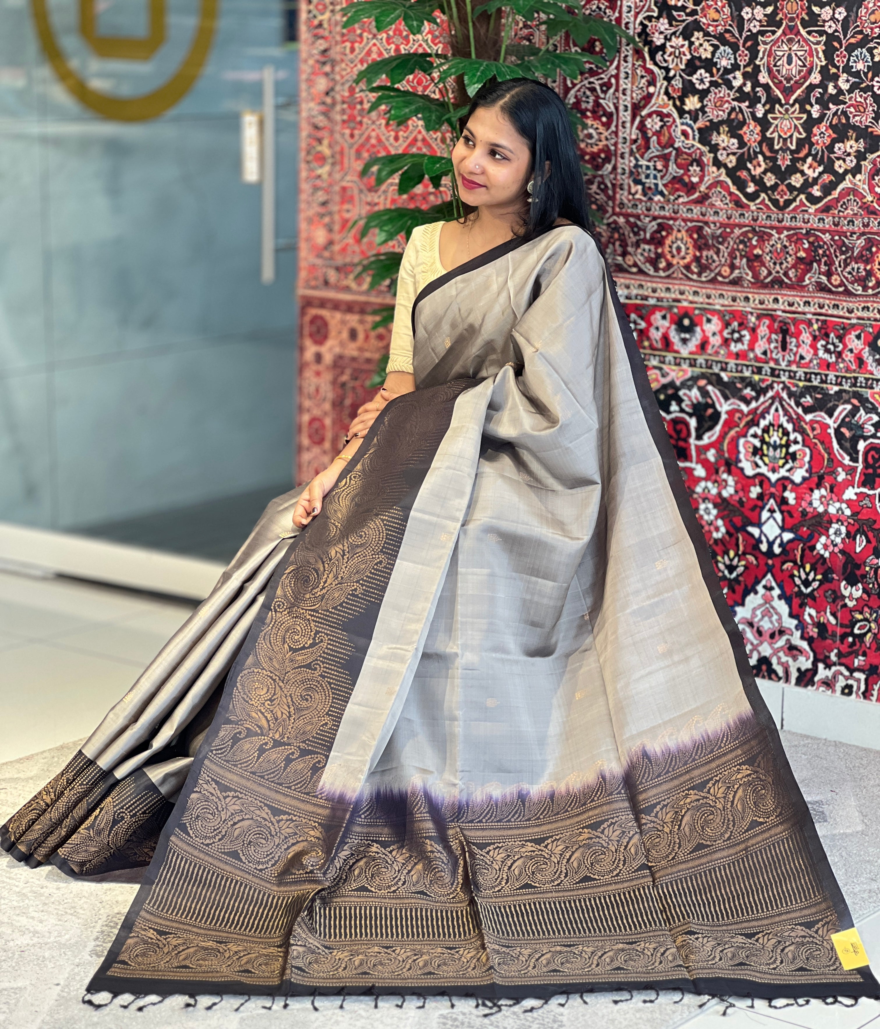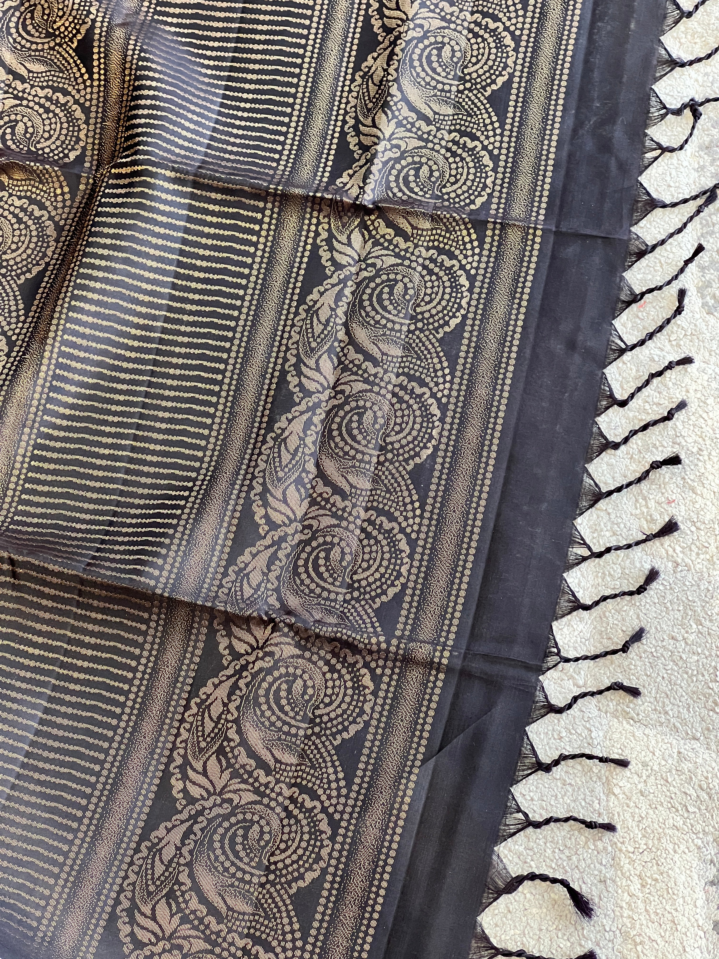 - Style: Golden Zari Weaving, Scattered Butta Detailing, Brocade Pallu and Border, Tassels Attached