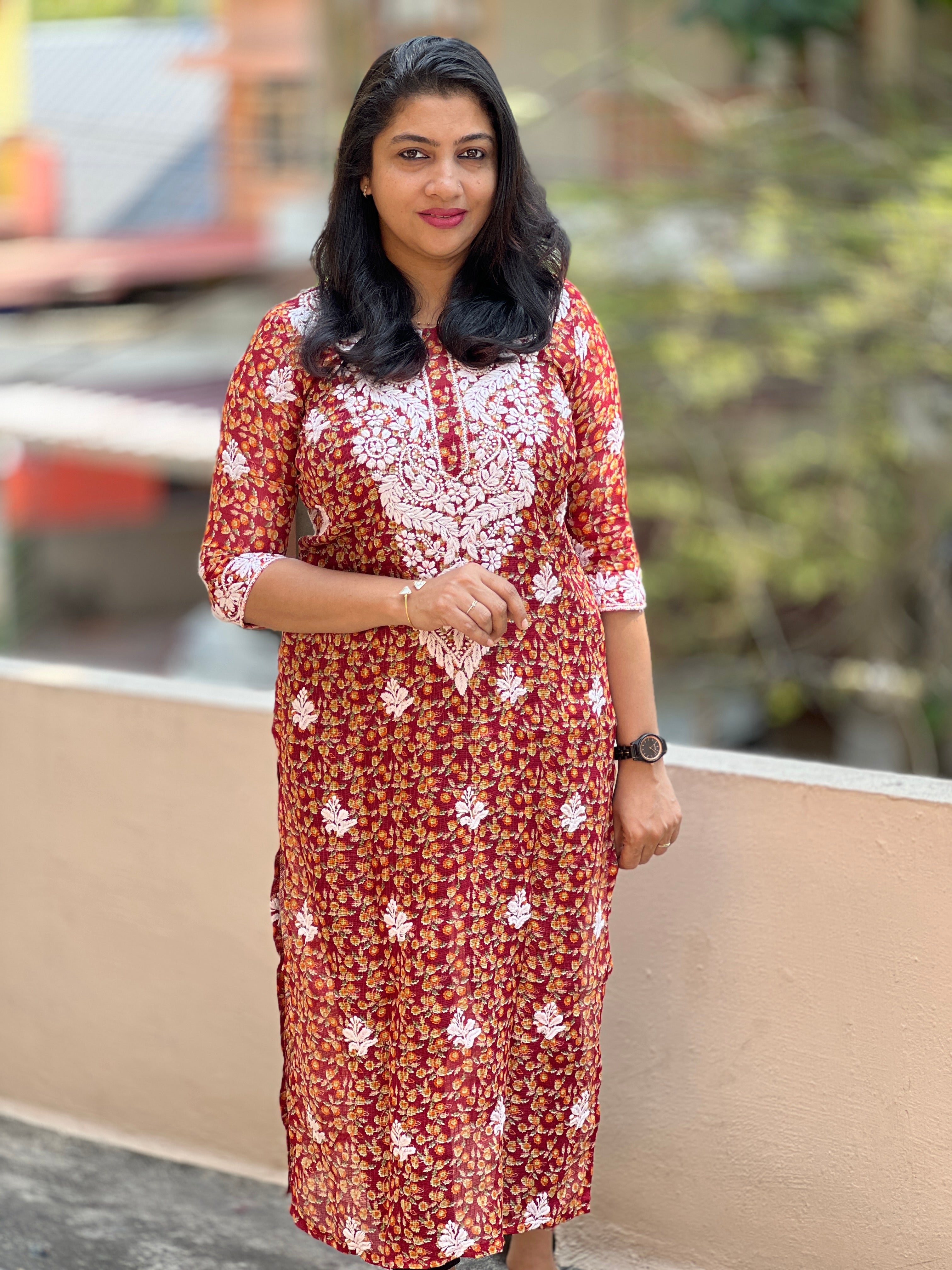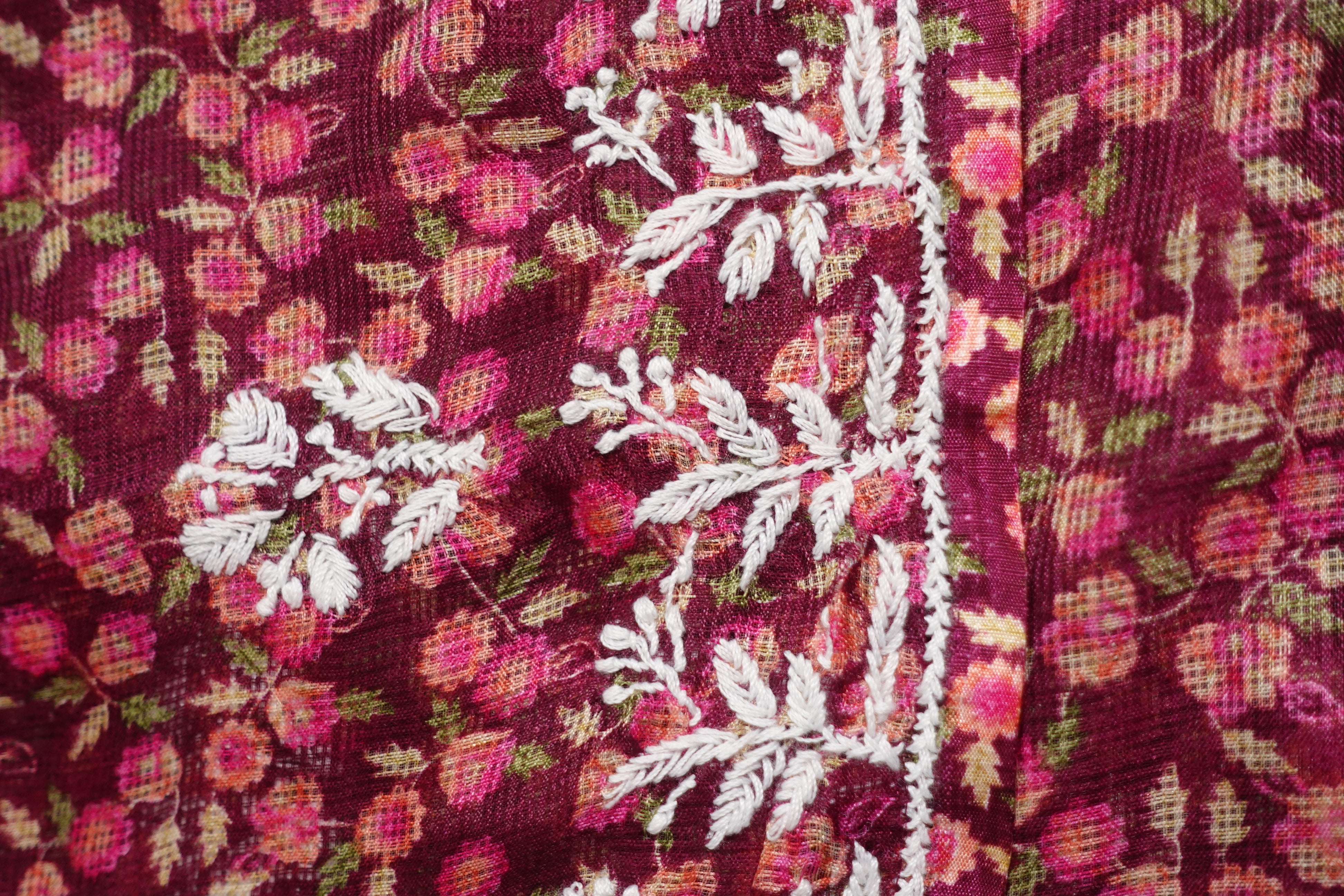A unique collection of hand-embroidered chikankari kurta materials with a Kota fabric top carrying highlighted chikankari embroidery work on the york portion and screen-print designs along with scattered small buttas placed all over the body.