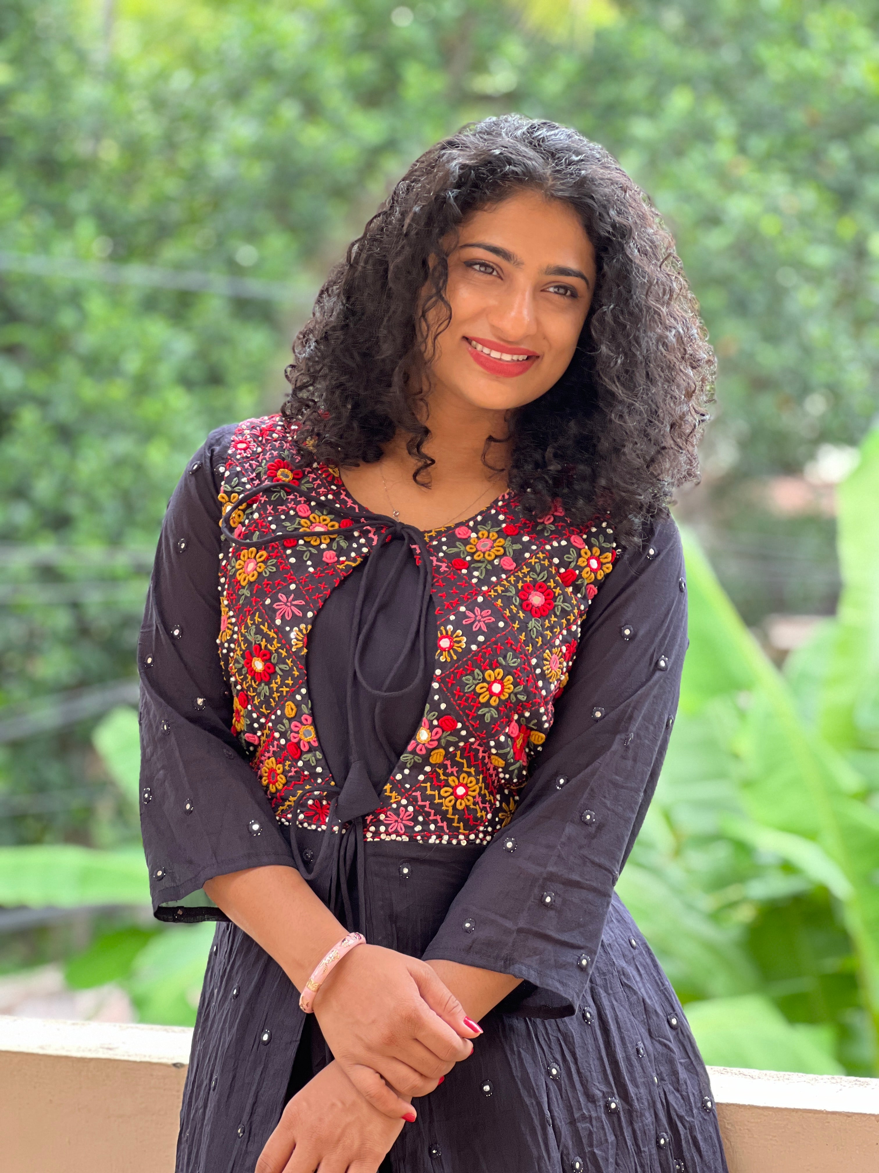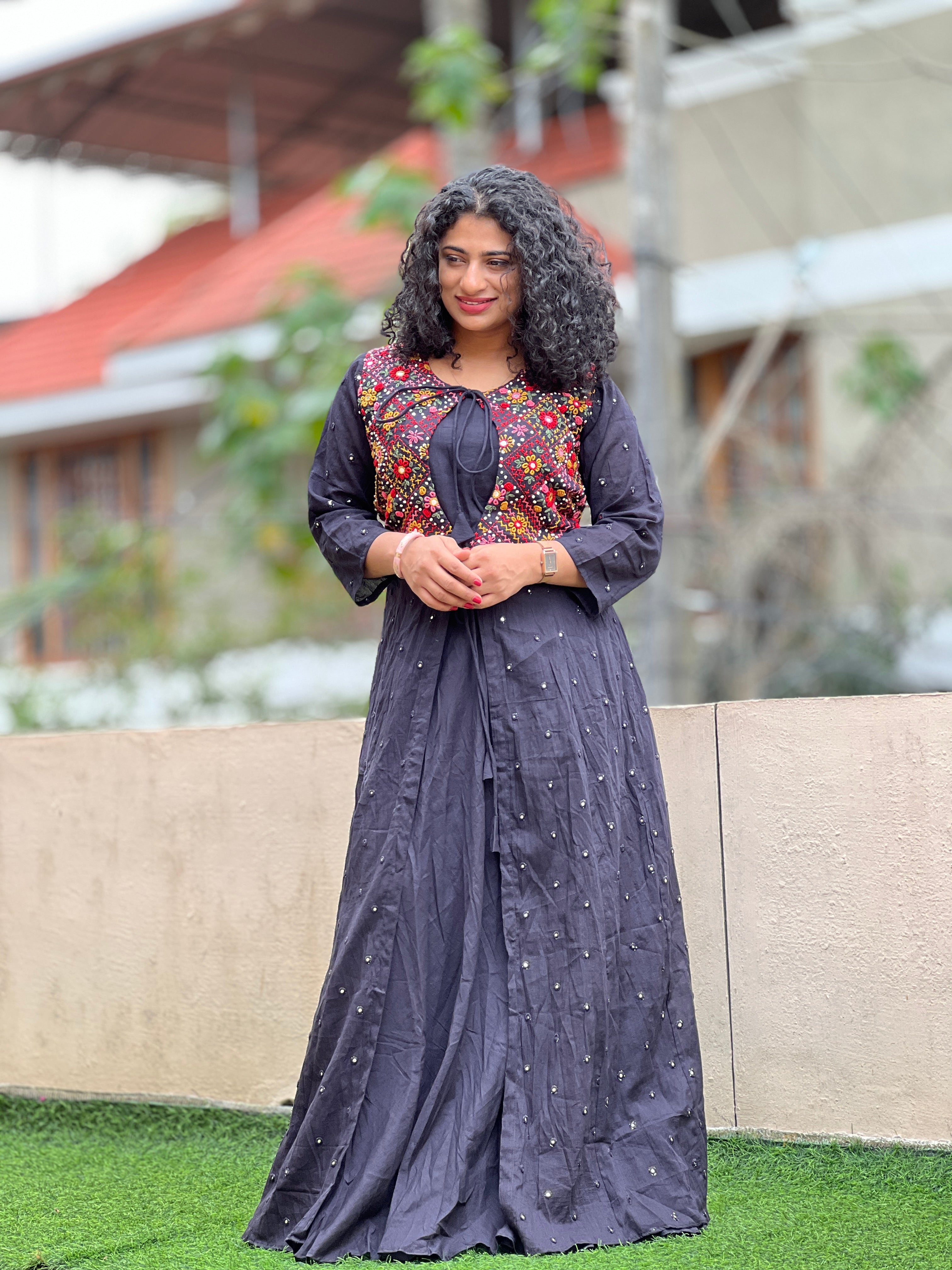 - Style- Floral Hand Embroidery Detailing, Scattered Plastic Mirror Work Pattern, Cotton Flared Inner Slip, Tie Up Detailing
