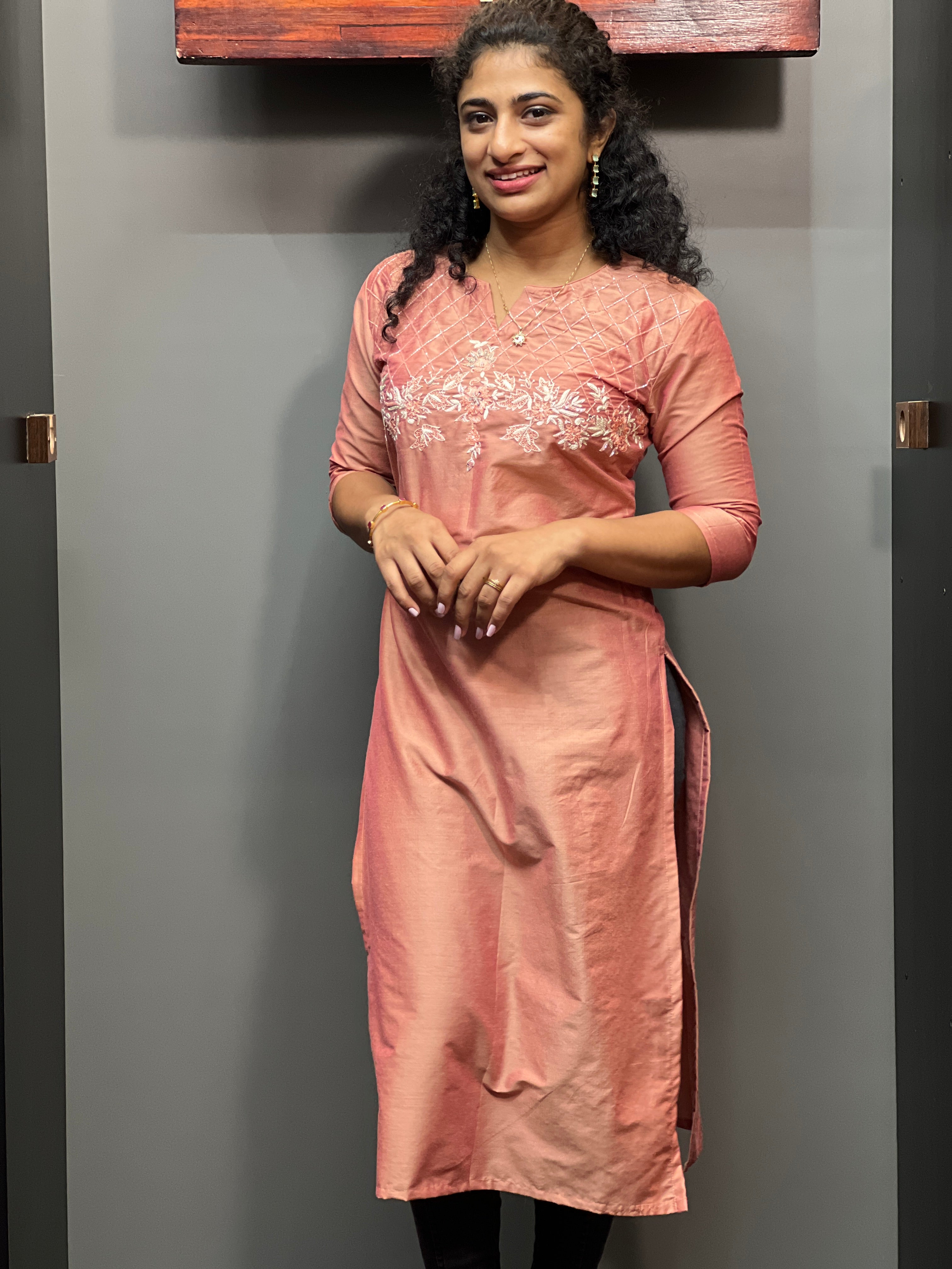 Hand embroidered cotton silk kurthi with floral design pattern on the yoke portion with cut beads.