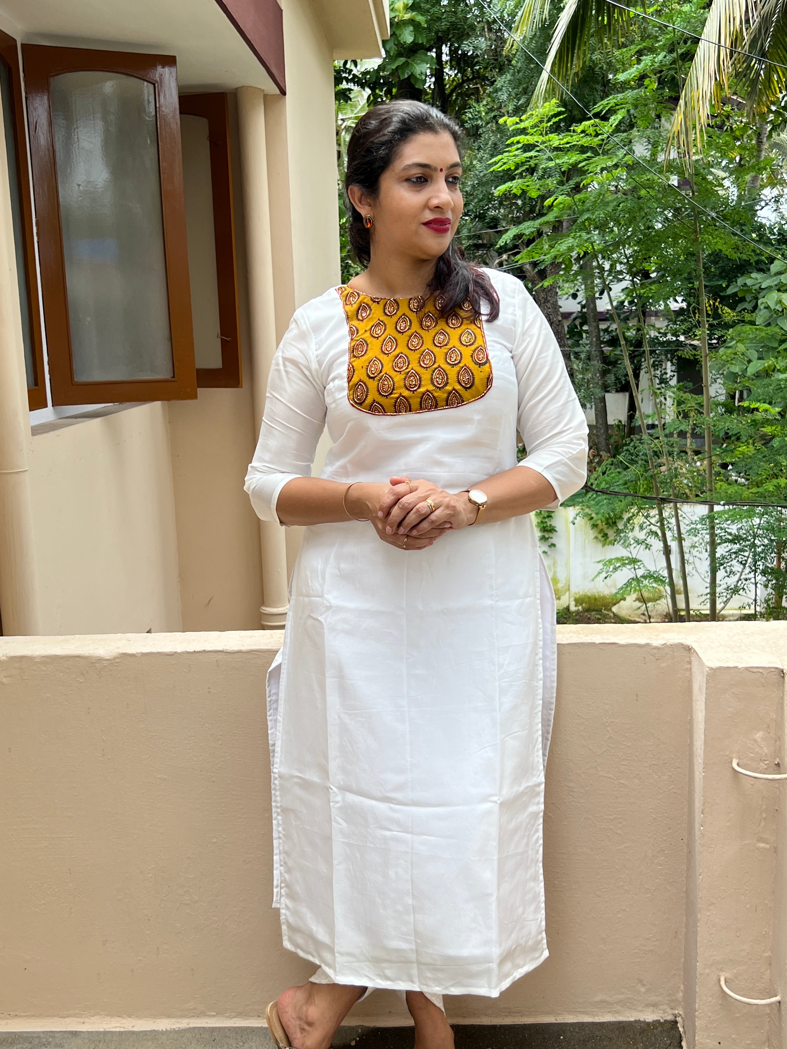 White shade uppada silk kurtha material with hand embroidered Ajrak material attached on yoke portion emphasises the small gopi & leaf patterns.