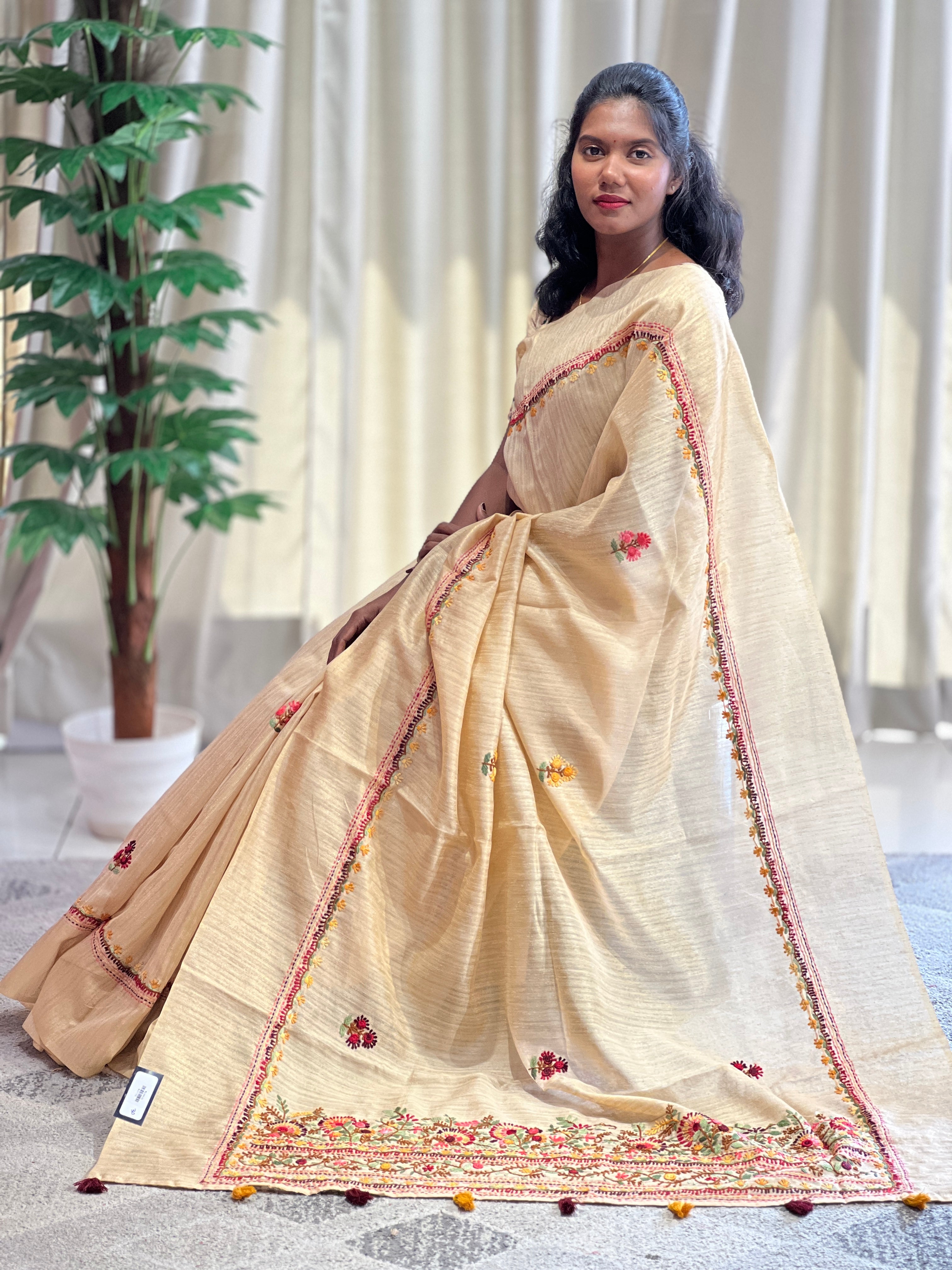 - Style: Hand Embroidery Pattern, Scattered Floral Embroidery Pattern, Border Detailing, Tassels Attaching, Embroidery Detailed Short Pallu