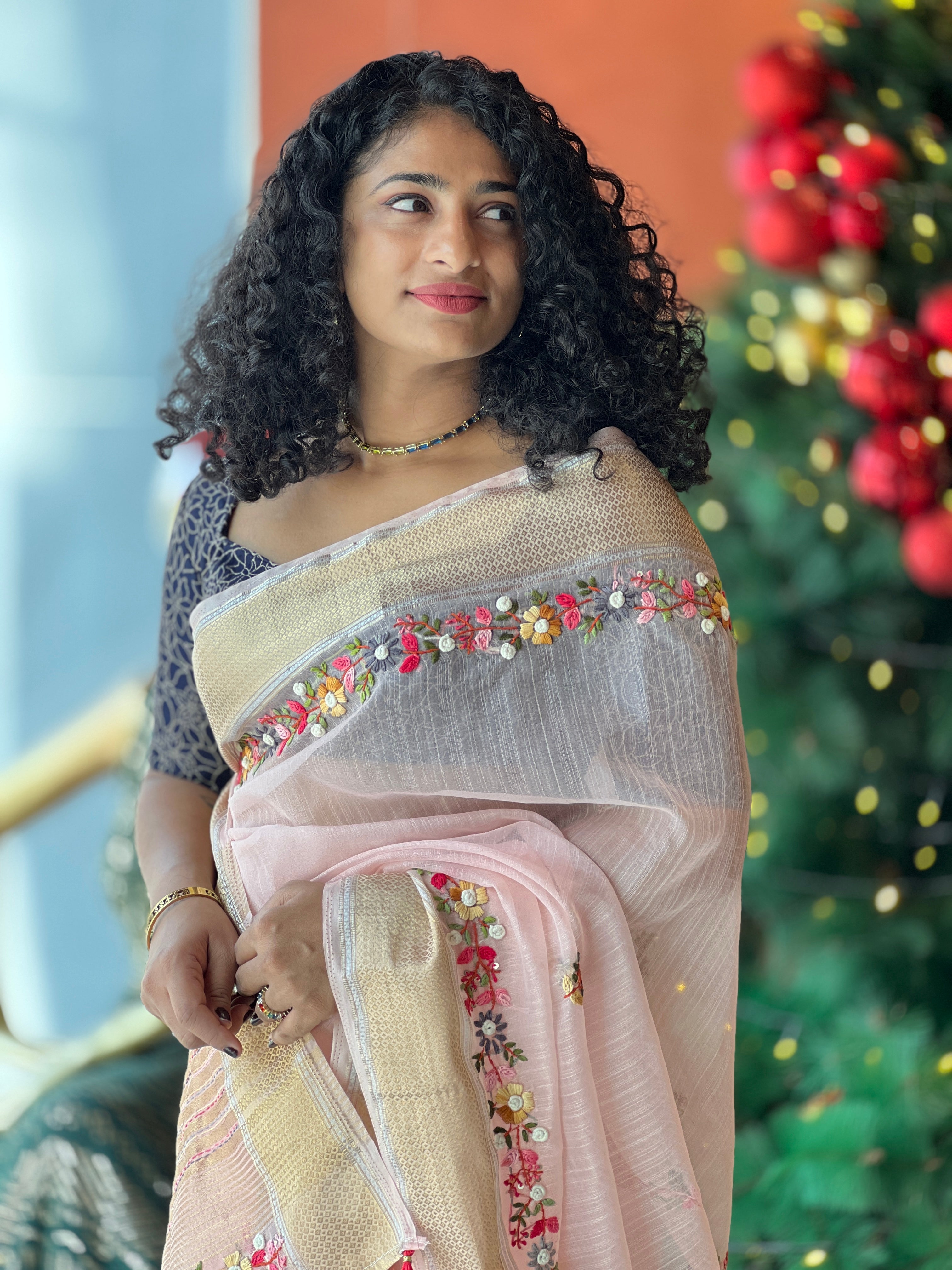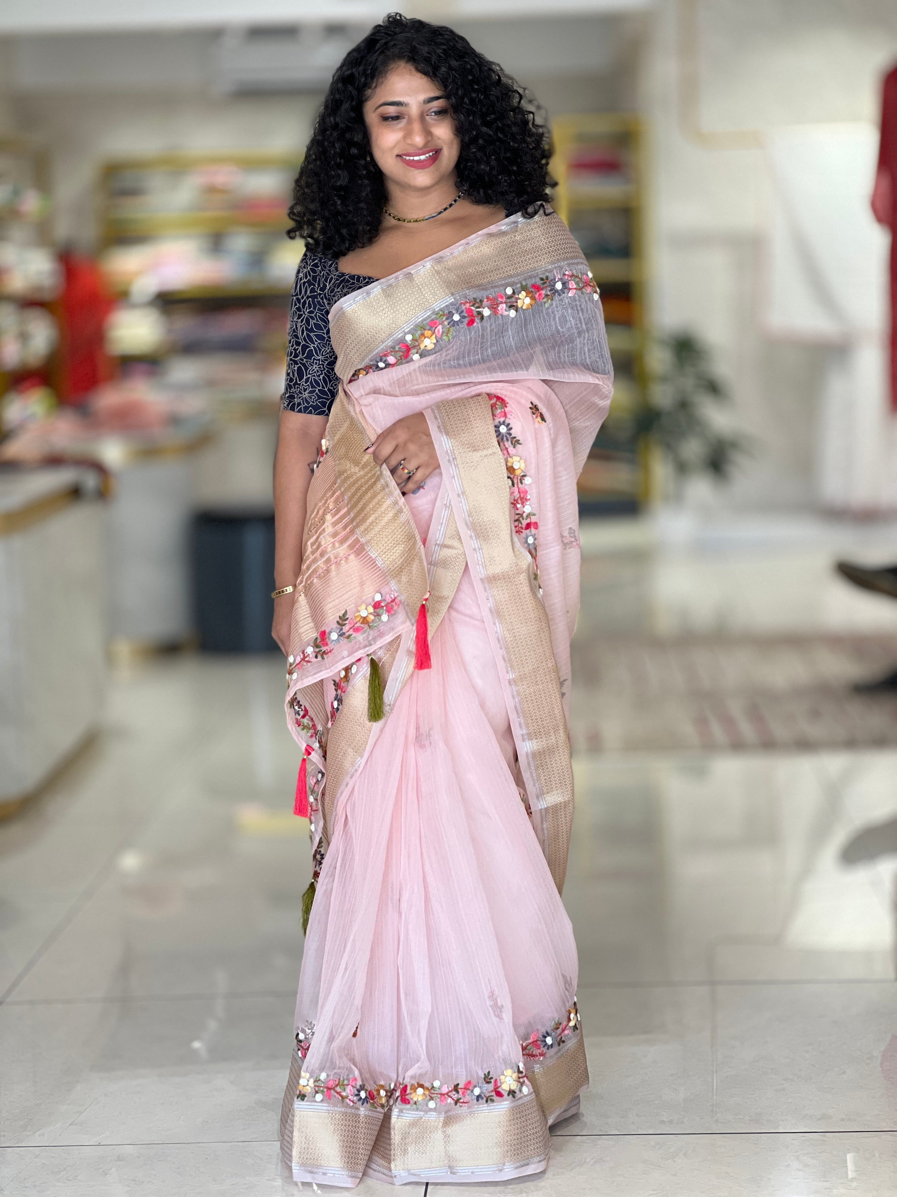 - Style: Floral Hand Embroidery Design, Golden Zari Woven Border ,Rich Pallu