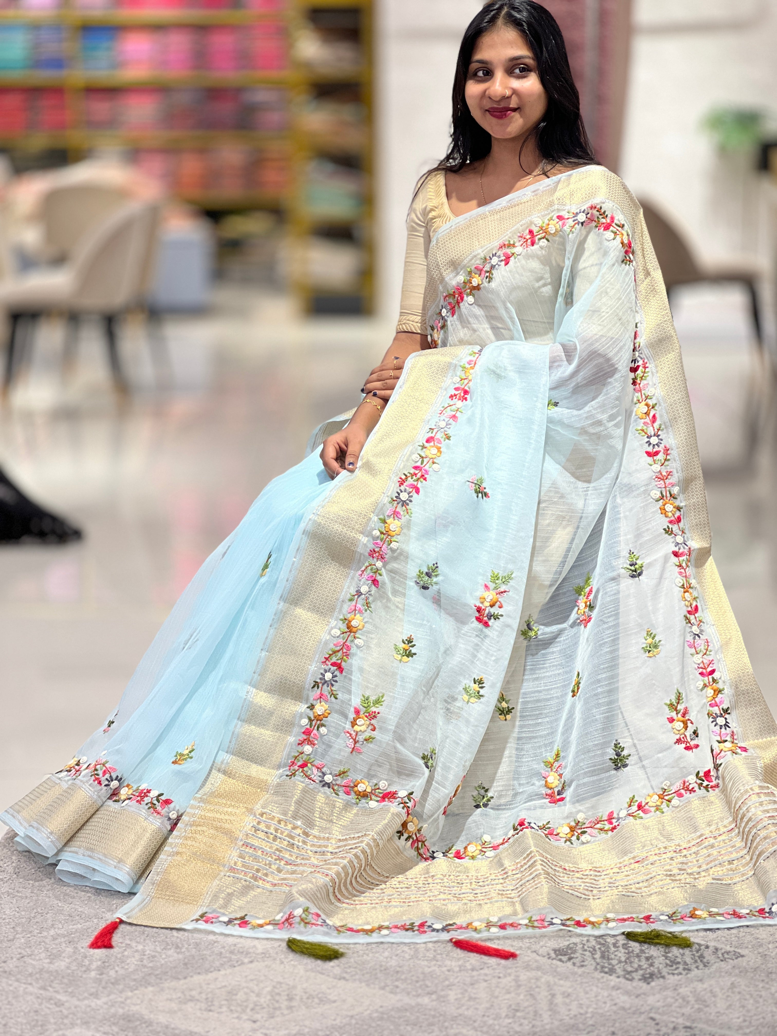 • Style: Floral Hand Embroidery Design, Golden Zari Woven Border ,Rich Pallu