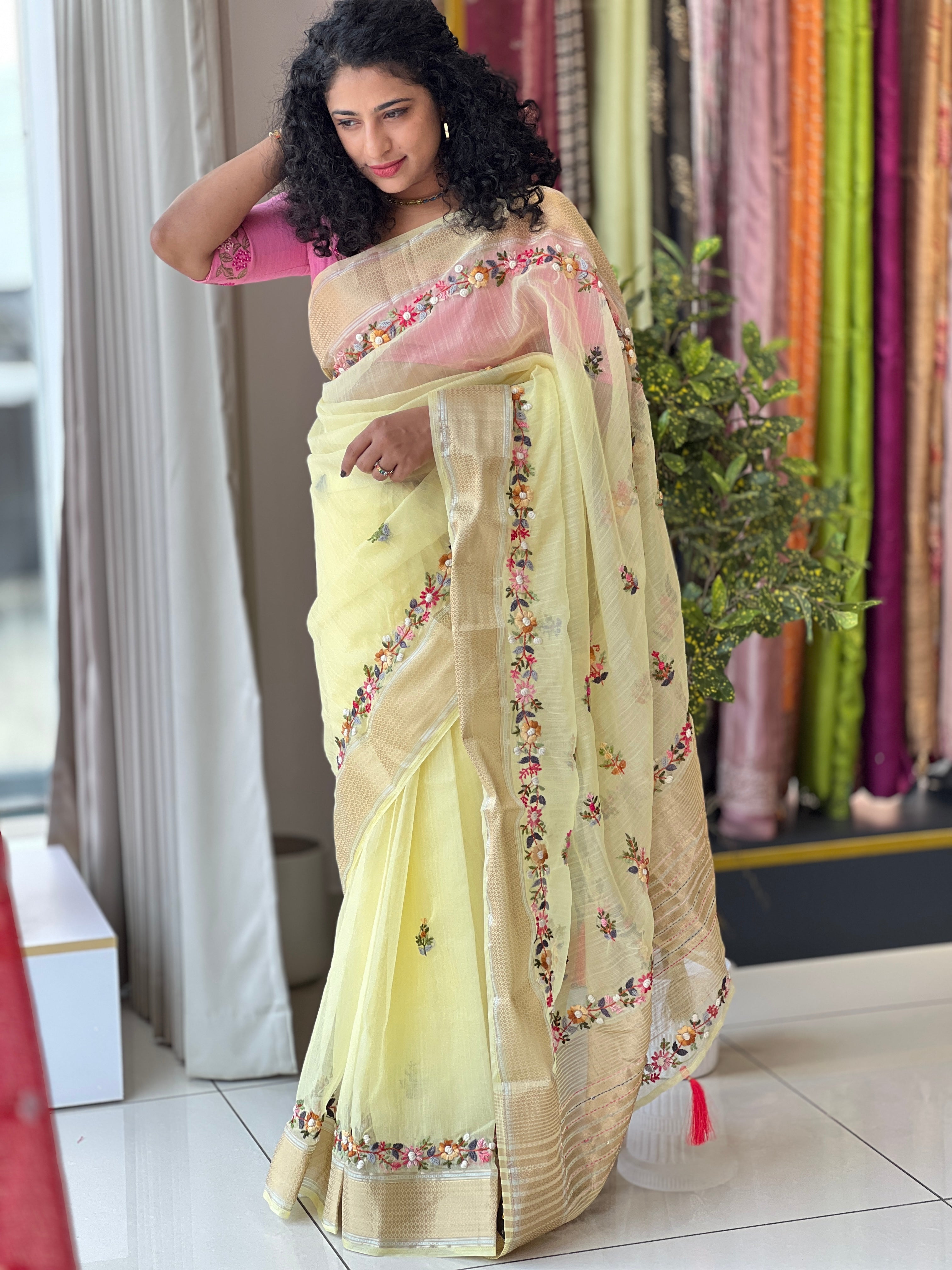 • Style: Floral Hand Embroidery Design, Golden Zari Woven Border ,Rich Pallu