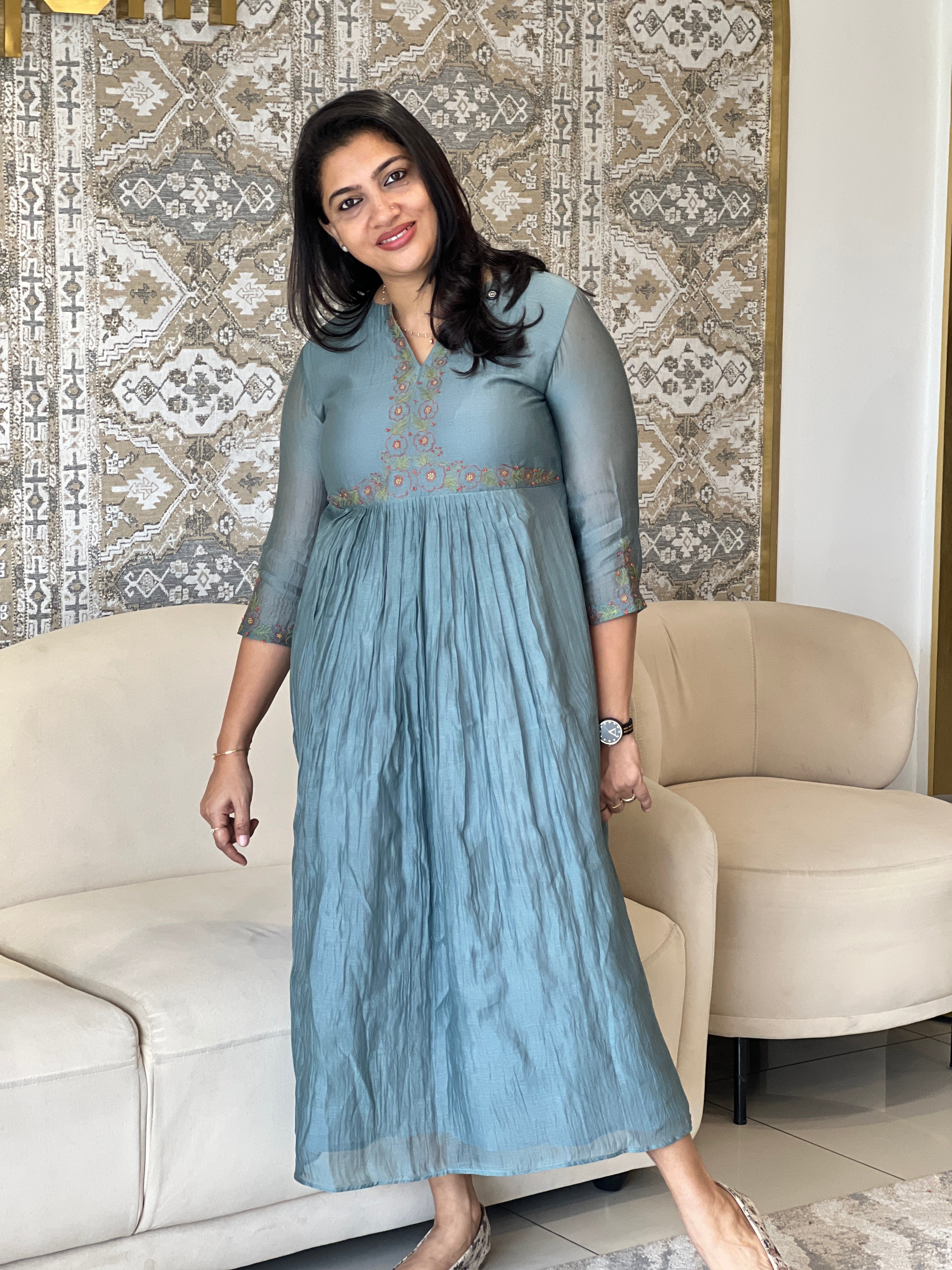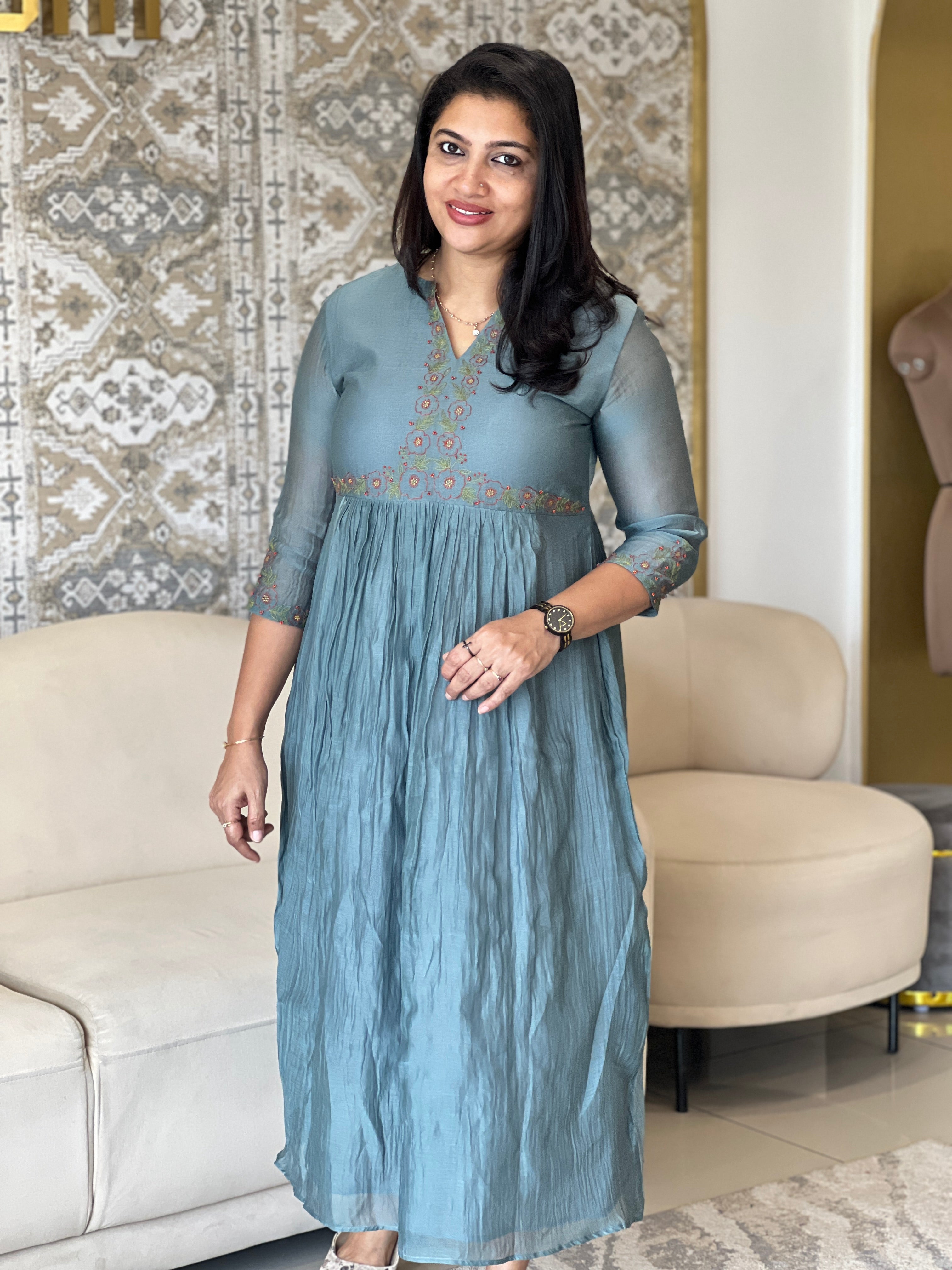 - Style - Hand Embroidery With Sugar Beads Detailed Yoke & Sleeves Portion, Gathering Detailing, With Lining, A-Line Pattern