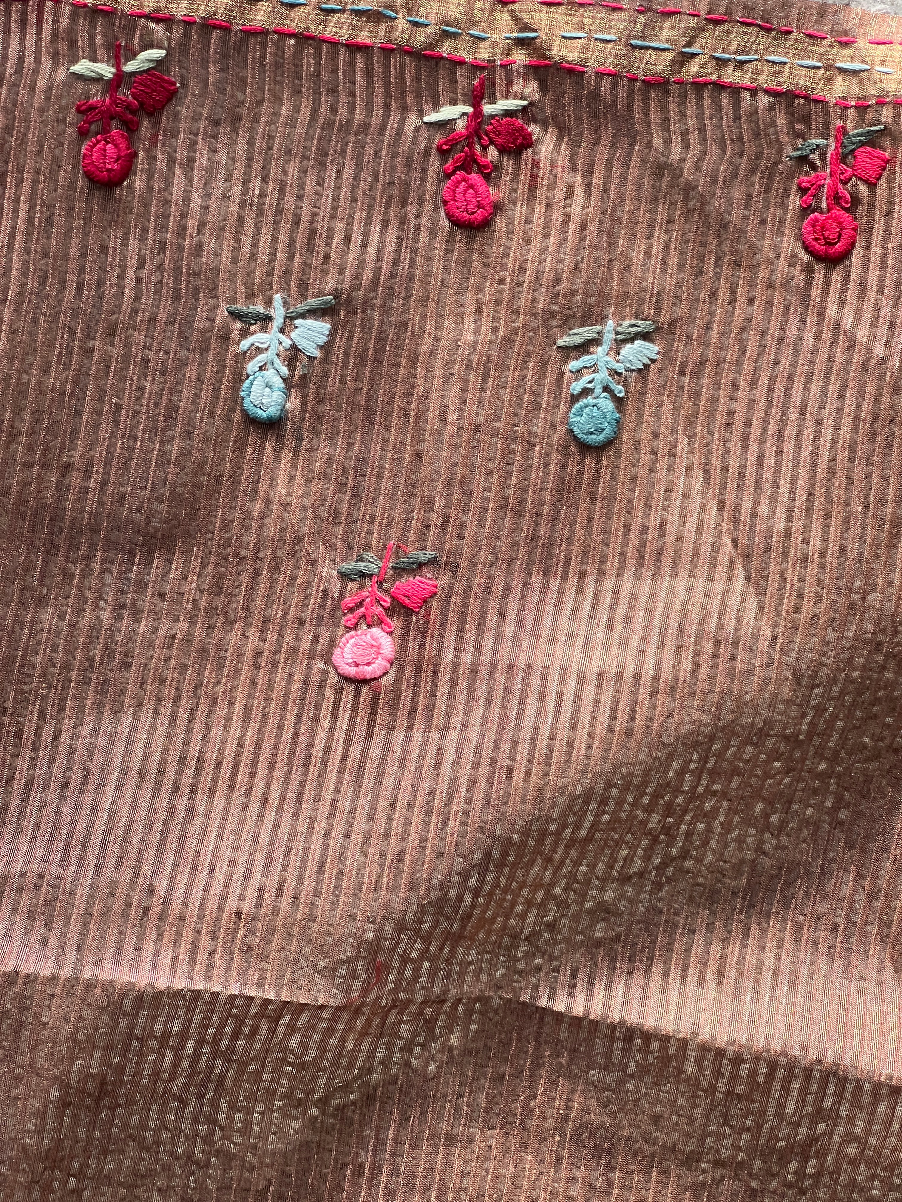 • Style: Hand Embroidery With Sequence Highlighted, Scattered Butta, Flat Facing Borders, Kantha & Embroidery Detailed Pallu, Tassels Attached