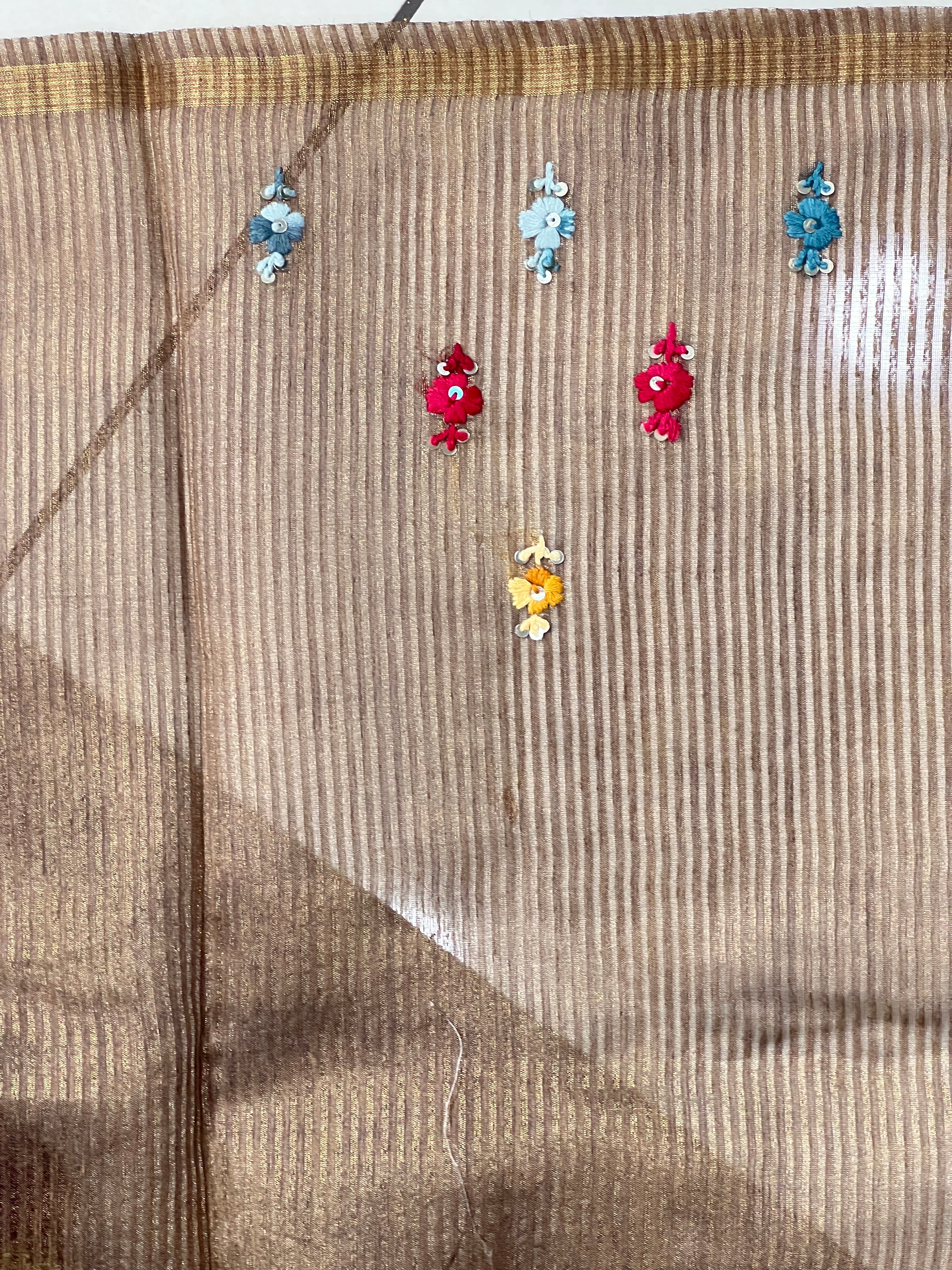 - Style: Hand Embroidery With Sequence Highlighted, Scattered Butta, Flat Facing Borders, Kantha & Embroidery Detailed Pallu, Tassels Attached
