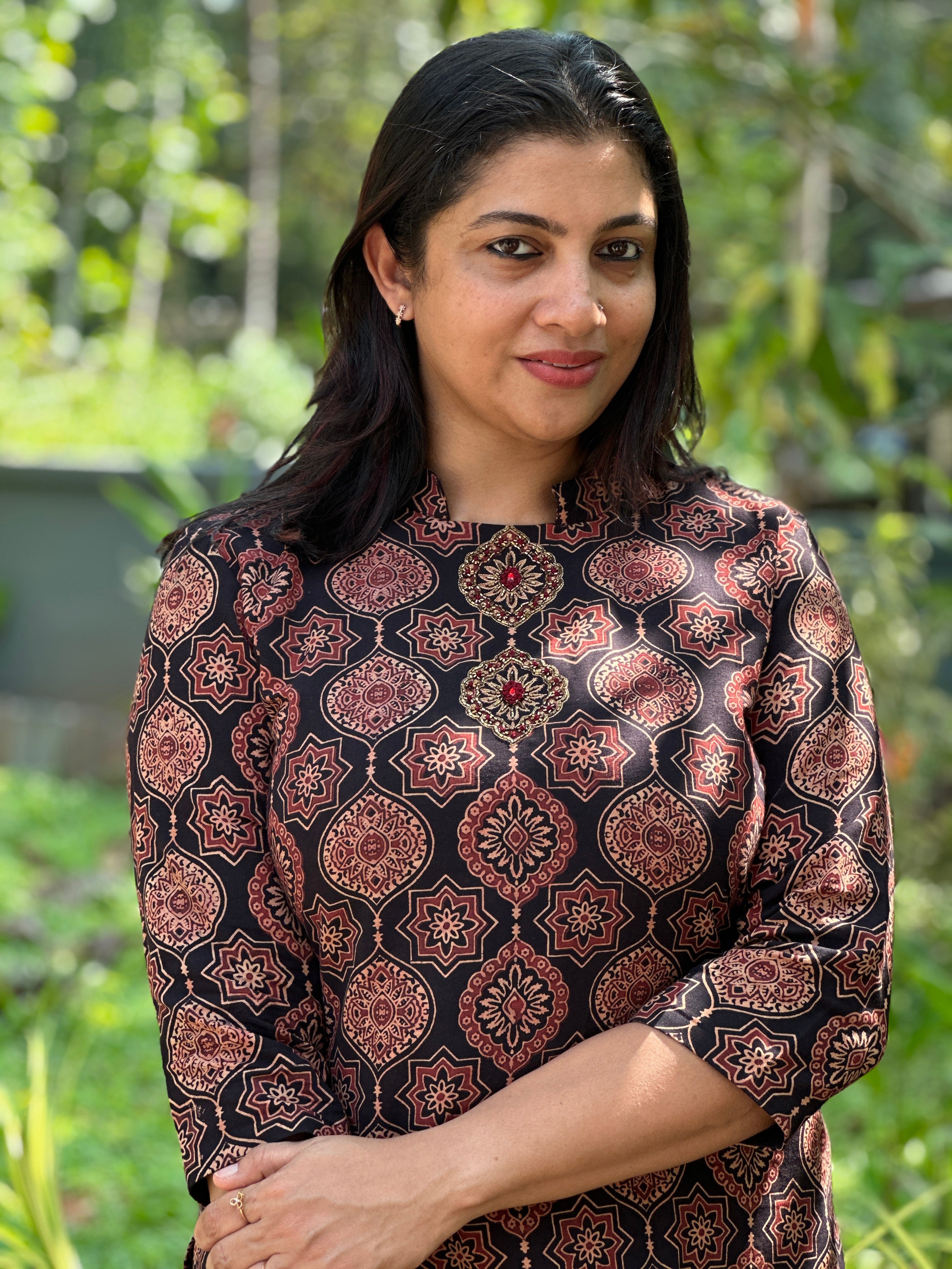 - Style- Ajrak Print Design, Hand Embroidery Yoke Design