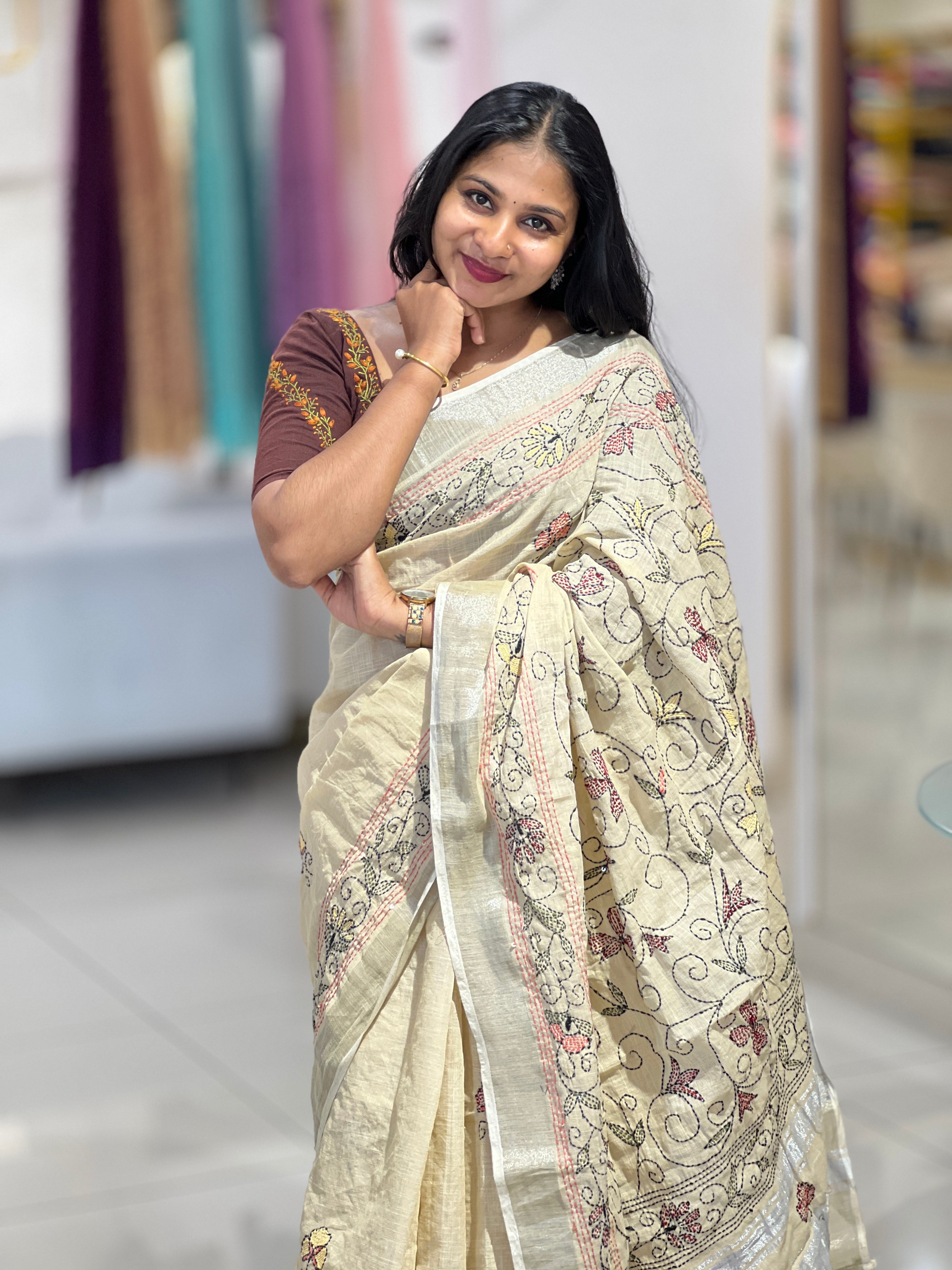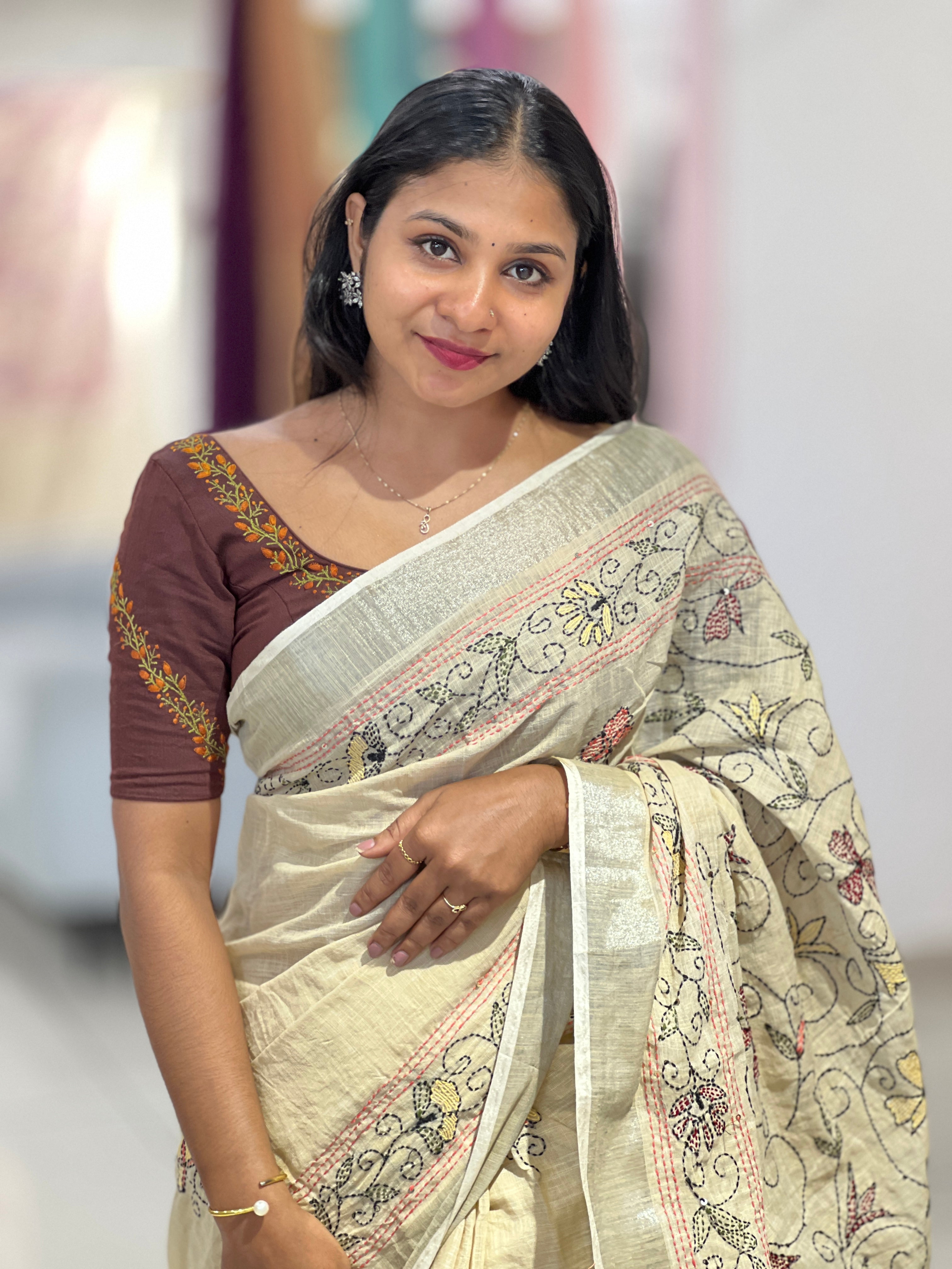 - Style: Hand Kantha Detailing, Sequence Highlighted, Scattered Floral Pattern, Zari Border Detailing, Tassels Attached