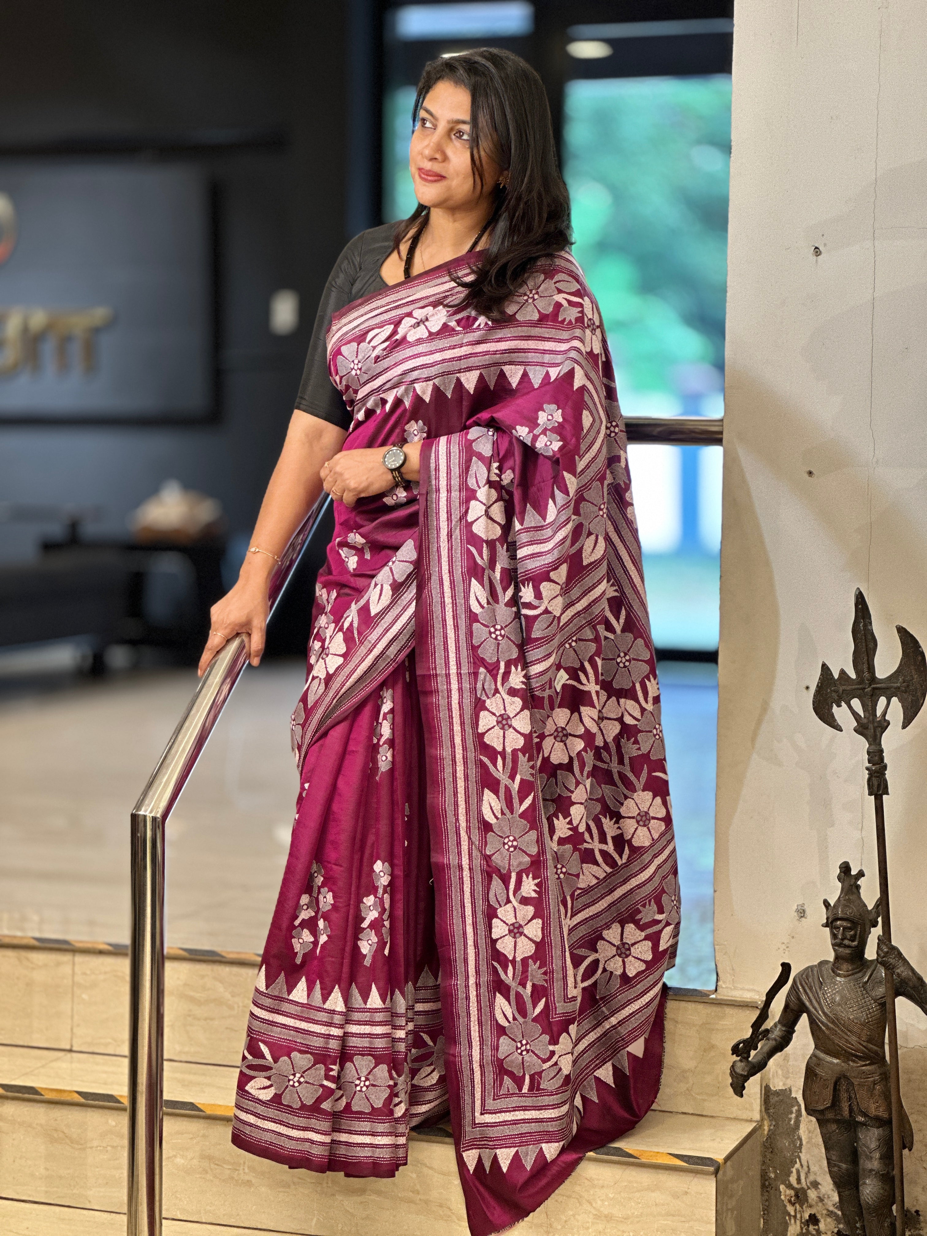 - Style: Hand Kantha Embroidery, Floral Pattern, Temple Border Detailing, Scattered Floral Motifs