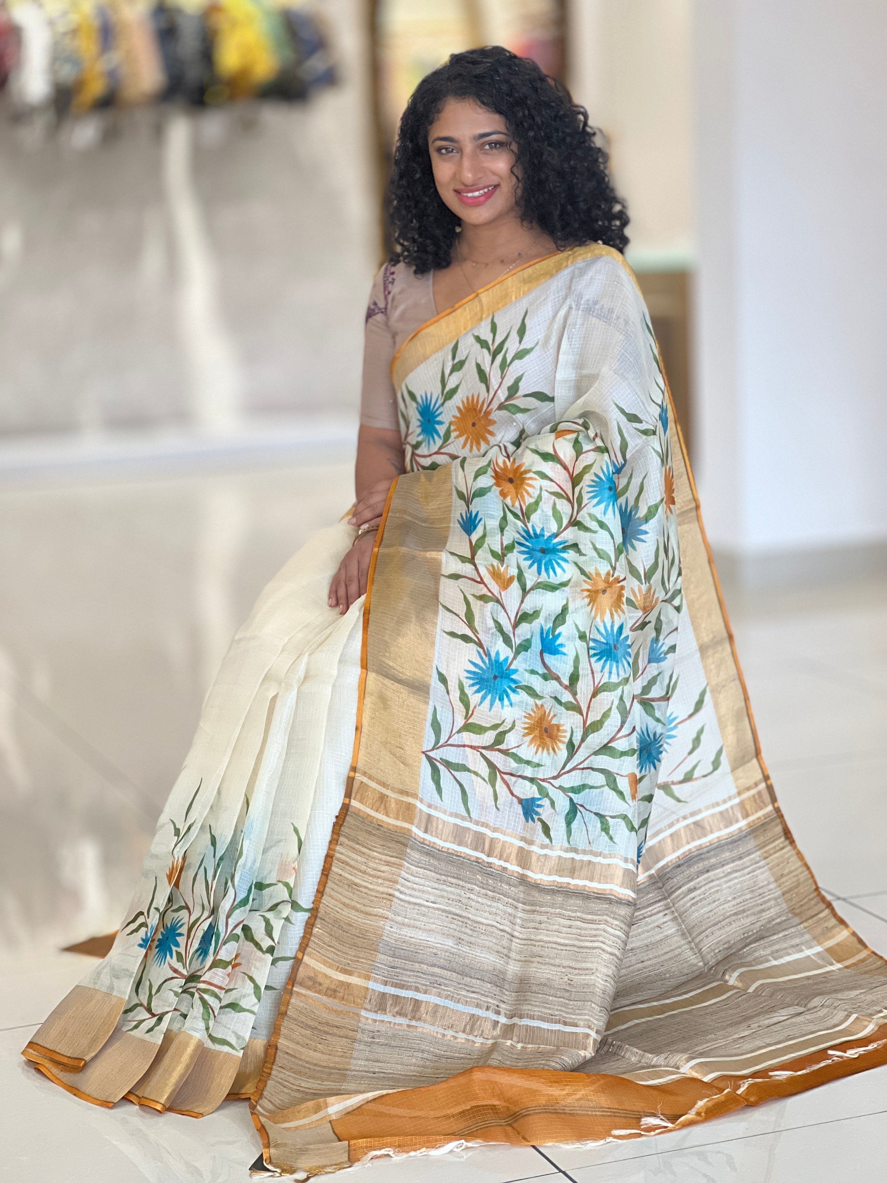 - Style: Hand Painted Pattern, Floral Design, Geecha pallu, Zari Border