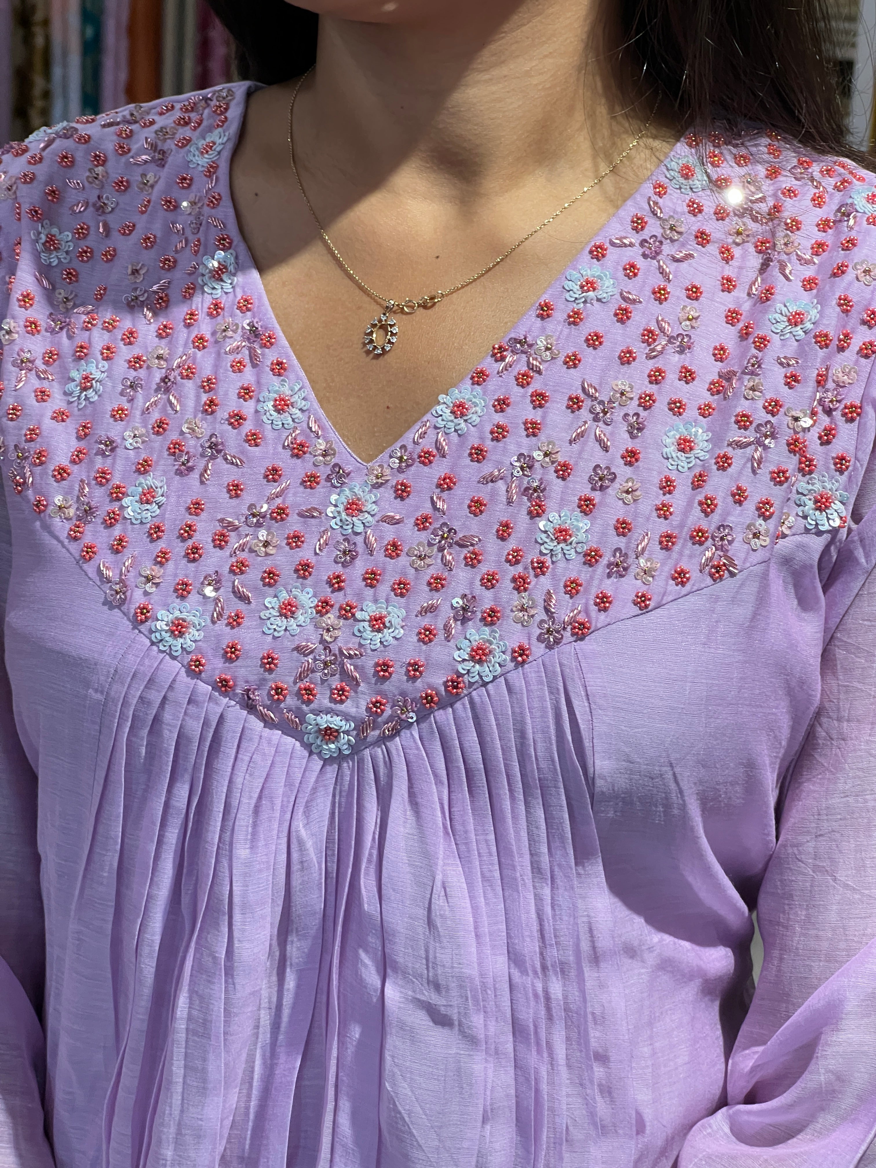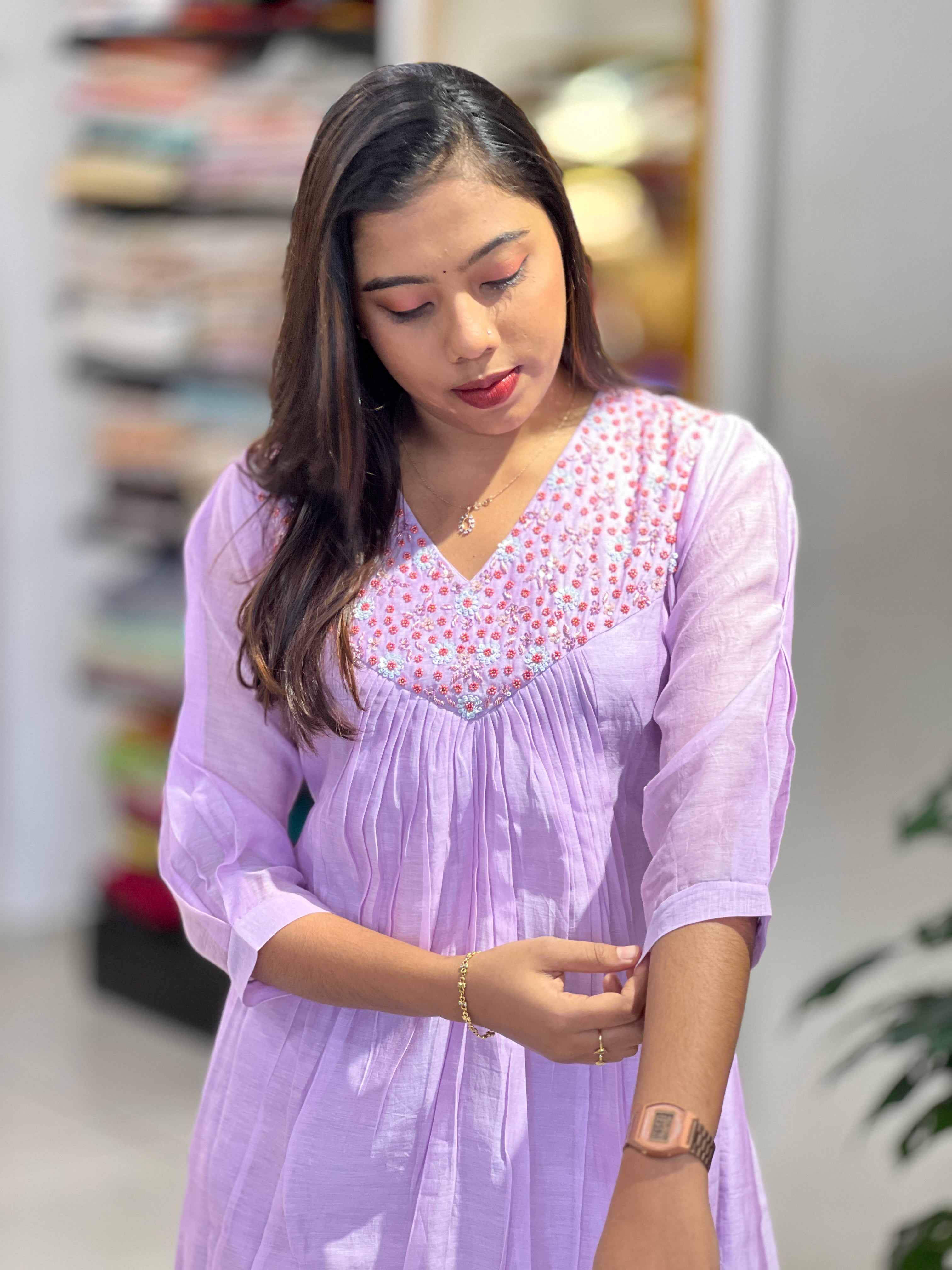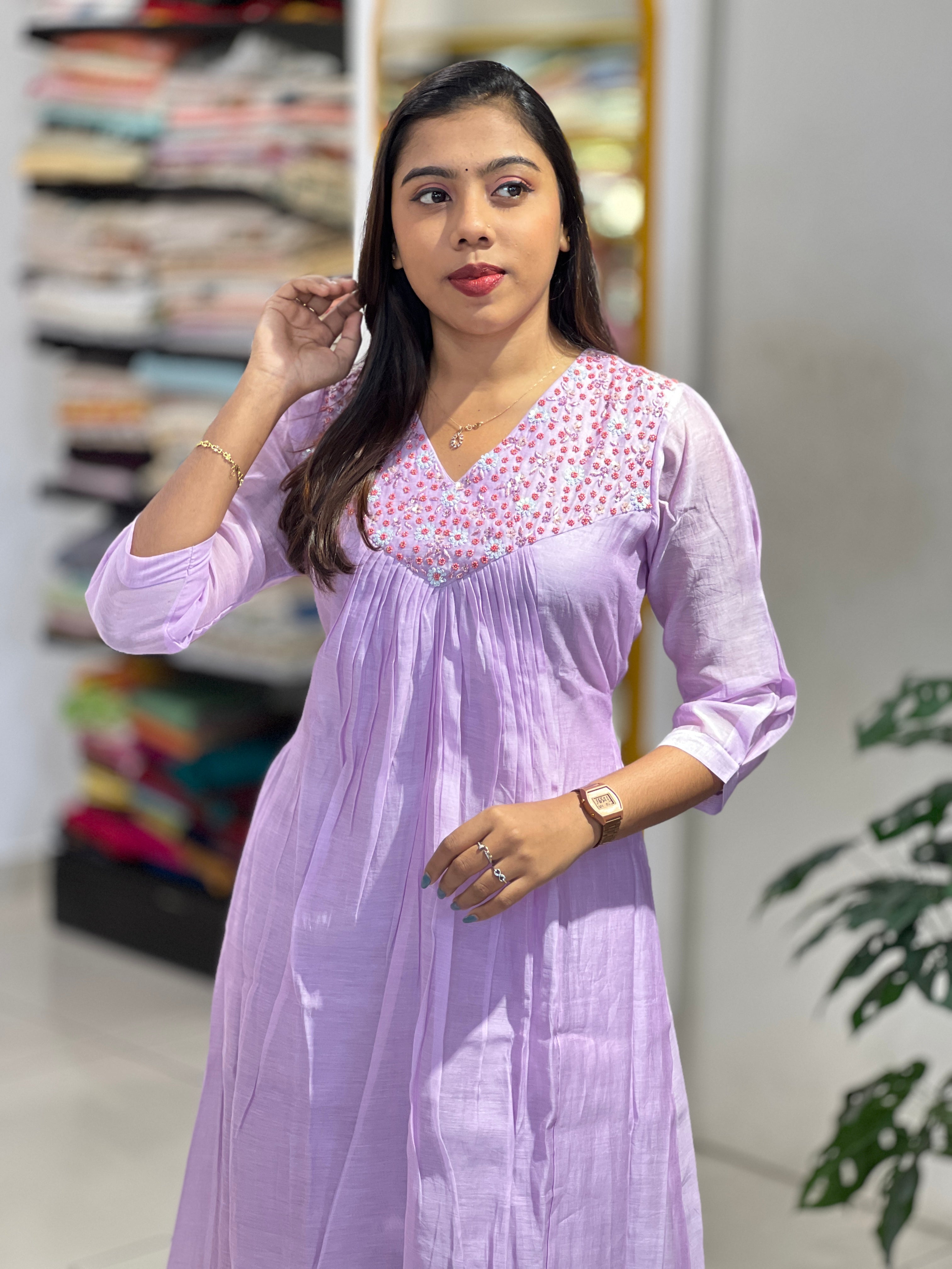 • Style: Hand Work Detailing, A-Line Pattern, Alia Cut, Cotton Lining ( Not On Sleeves), Gathers