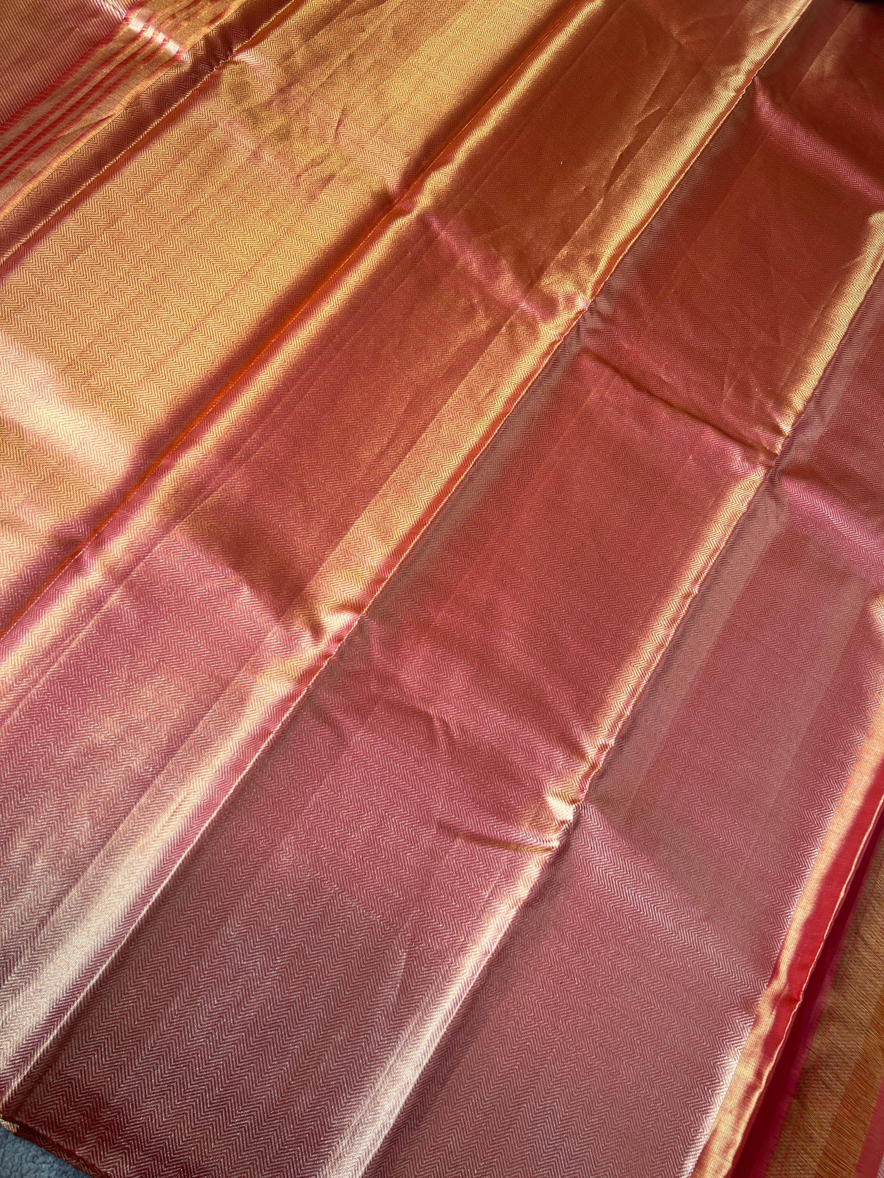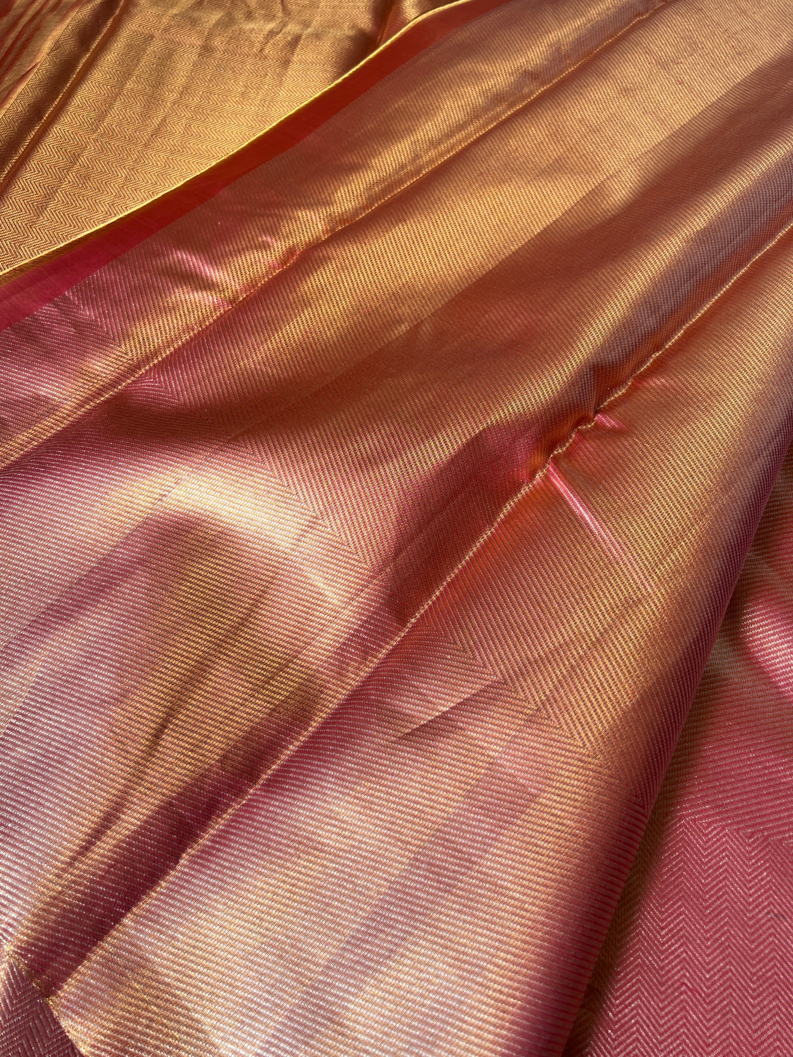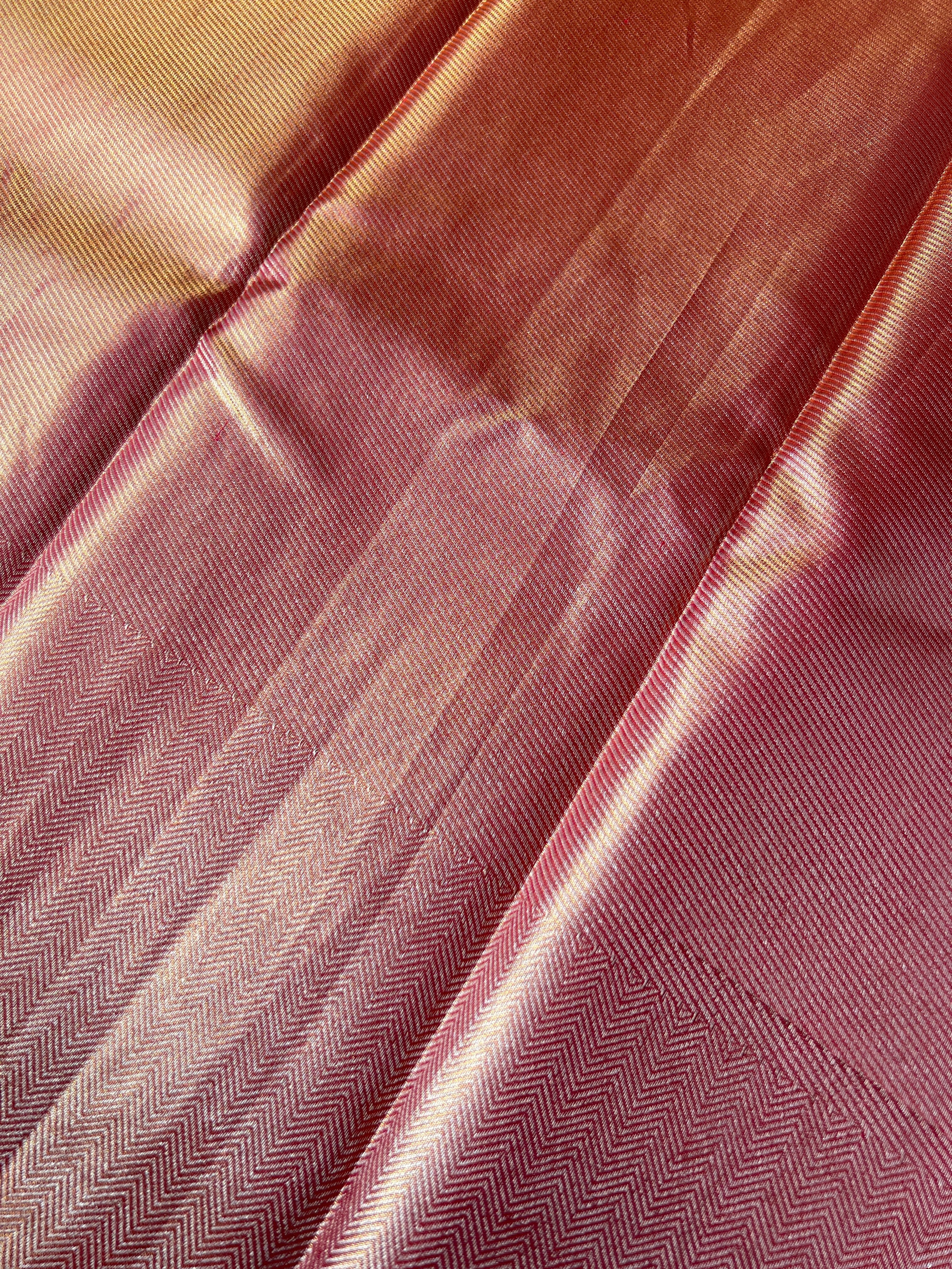- Style: Antique Golden Zari Woven, Tissue, Handloom, Diagonal Pattern, Zig Zag Patterned Borders, Zig Zag Patterned Pallu
