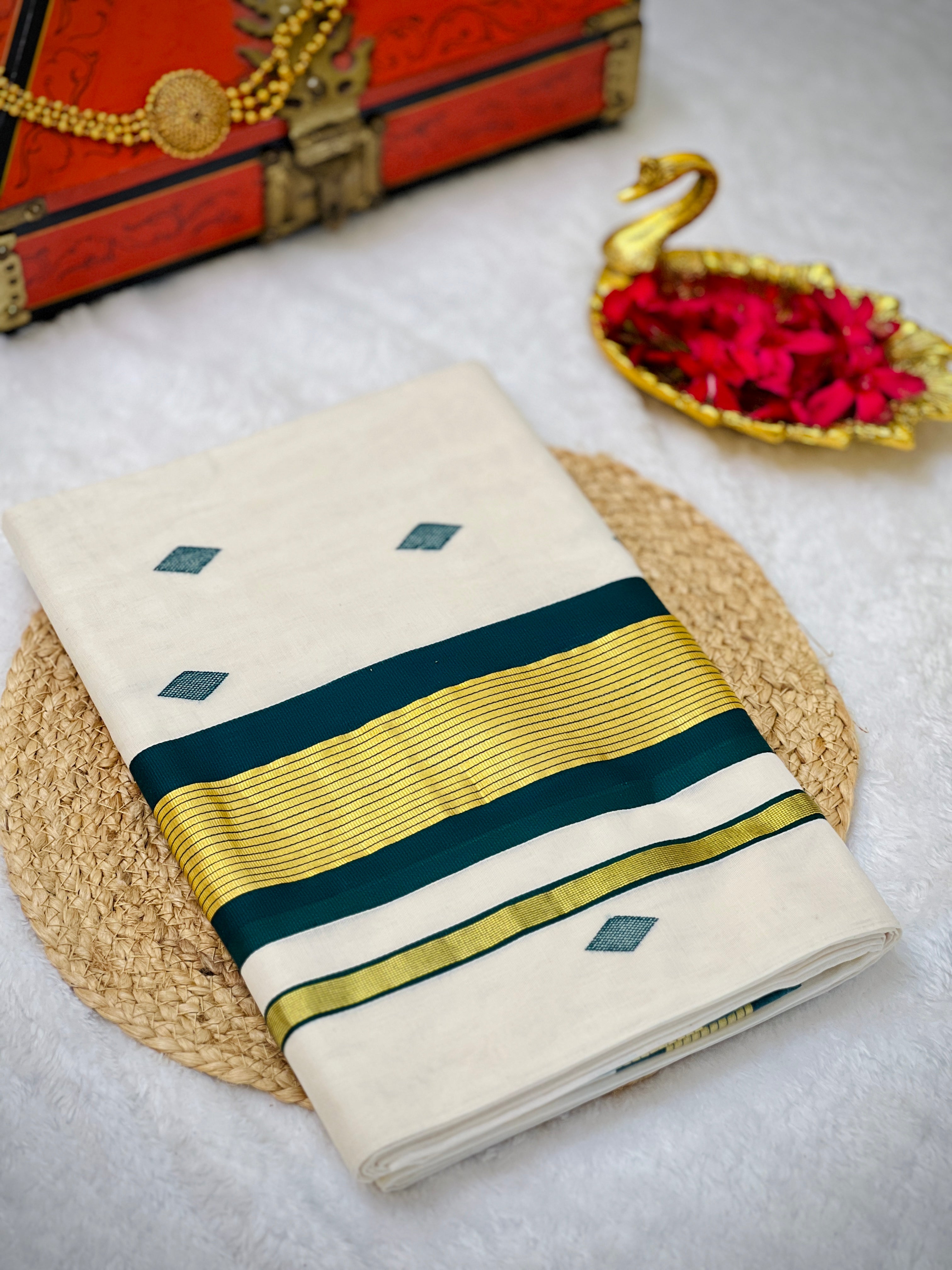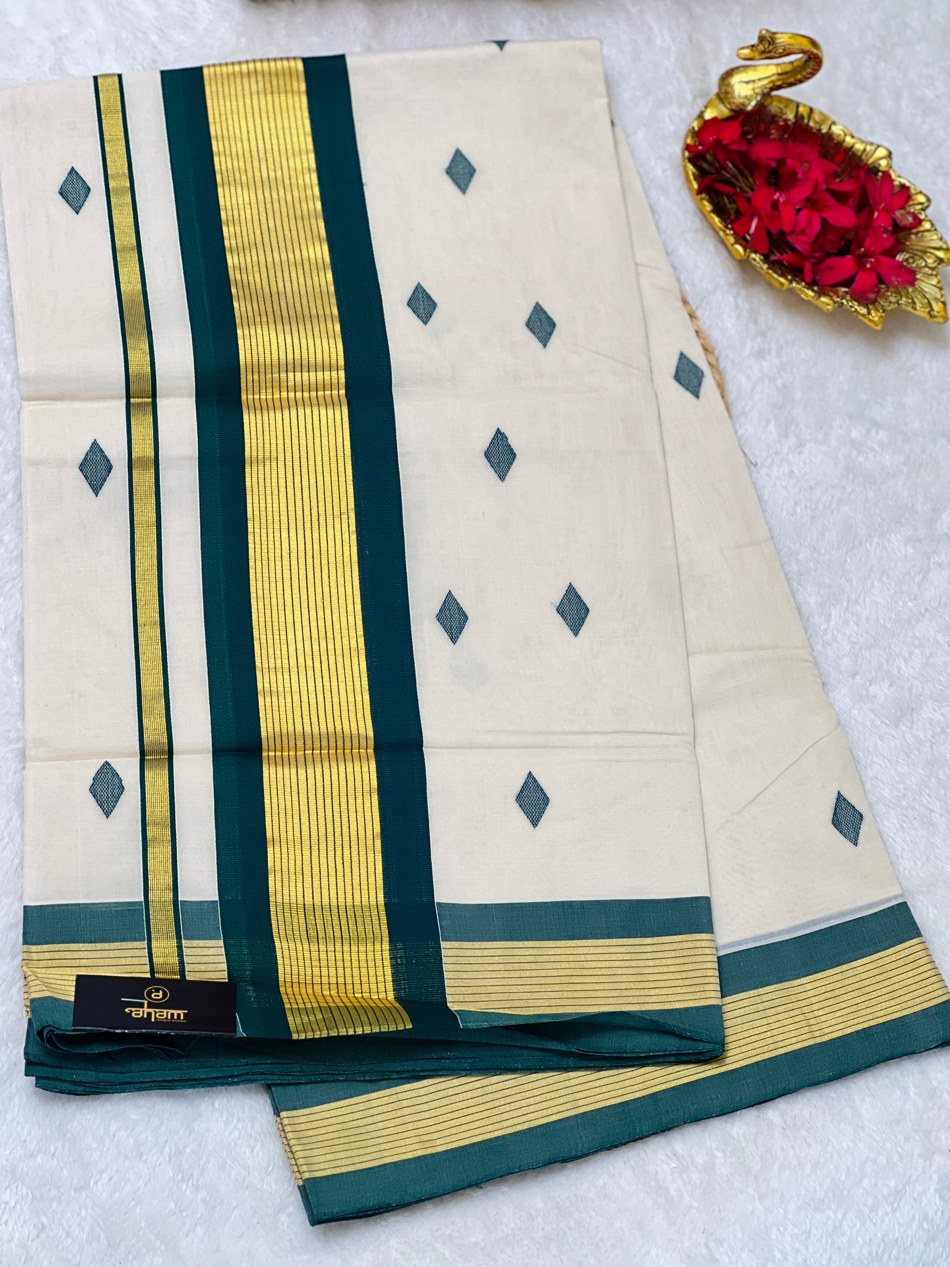 - Style: Golden Kasavu & Kara Detailing, Geometric Pattern