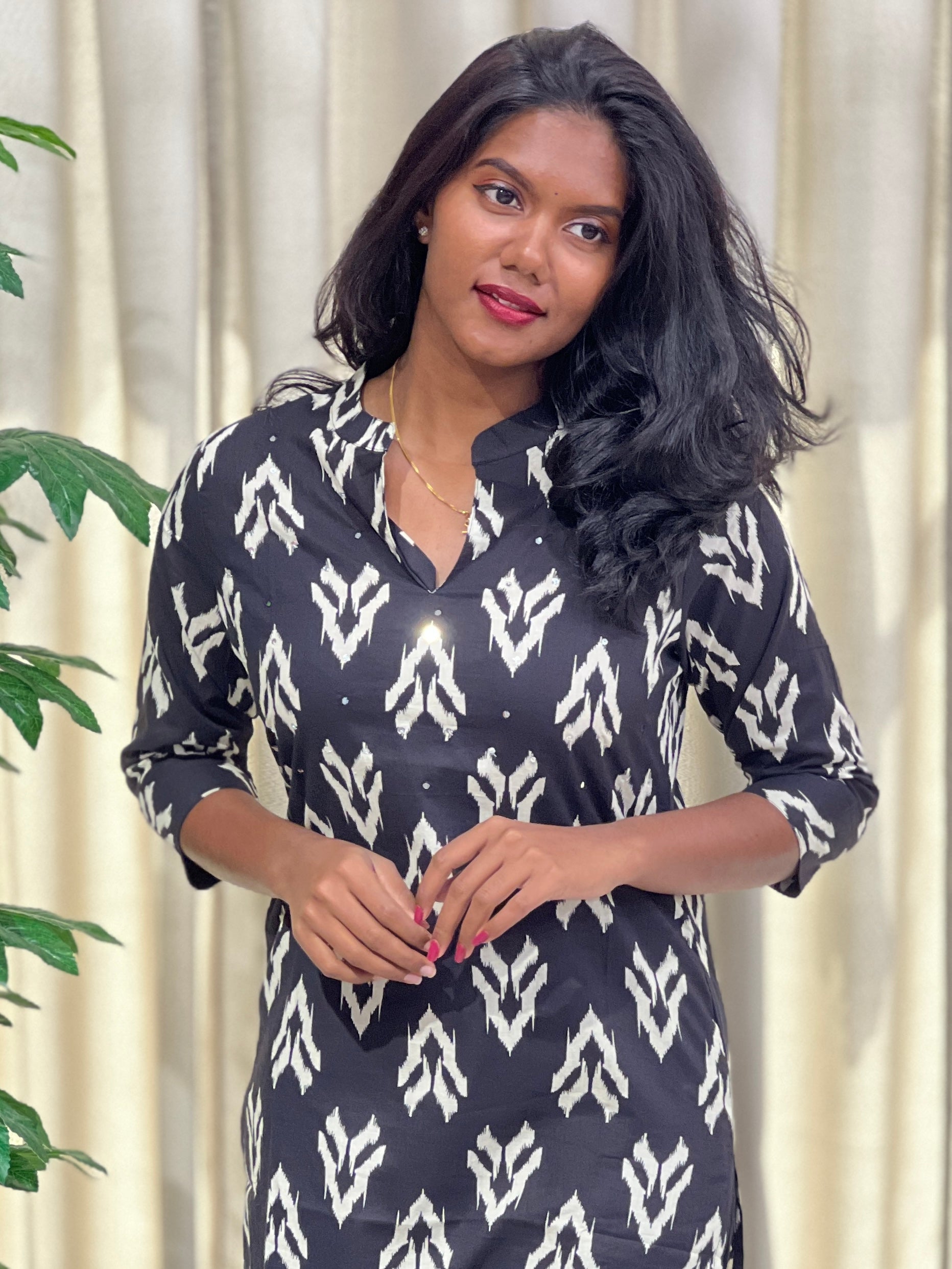 - Style: Ikat Inspired Print Detailed, Mirror Detailed Yoke Portion, Side Slit Pattern