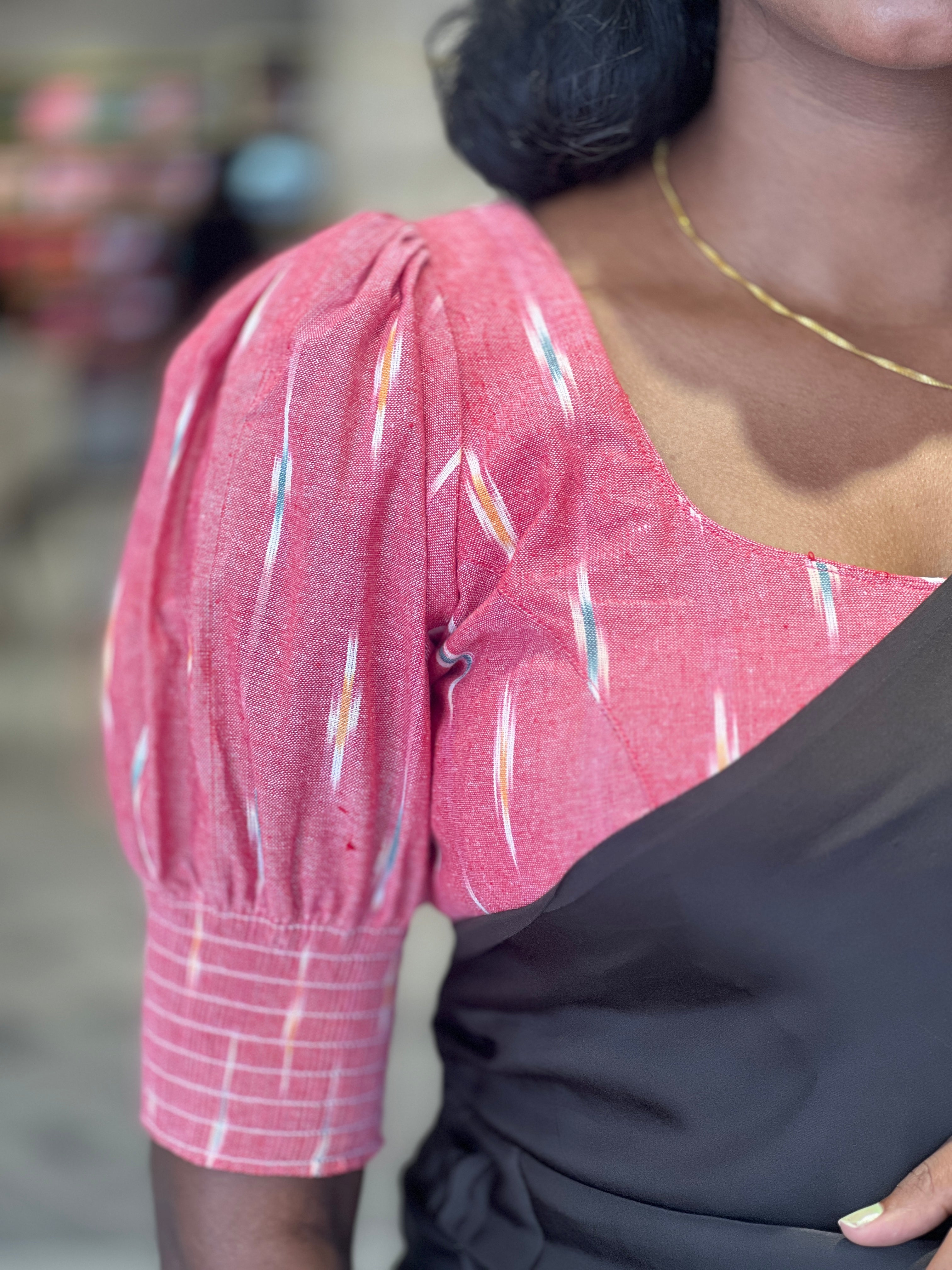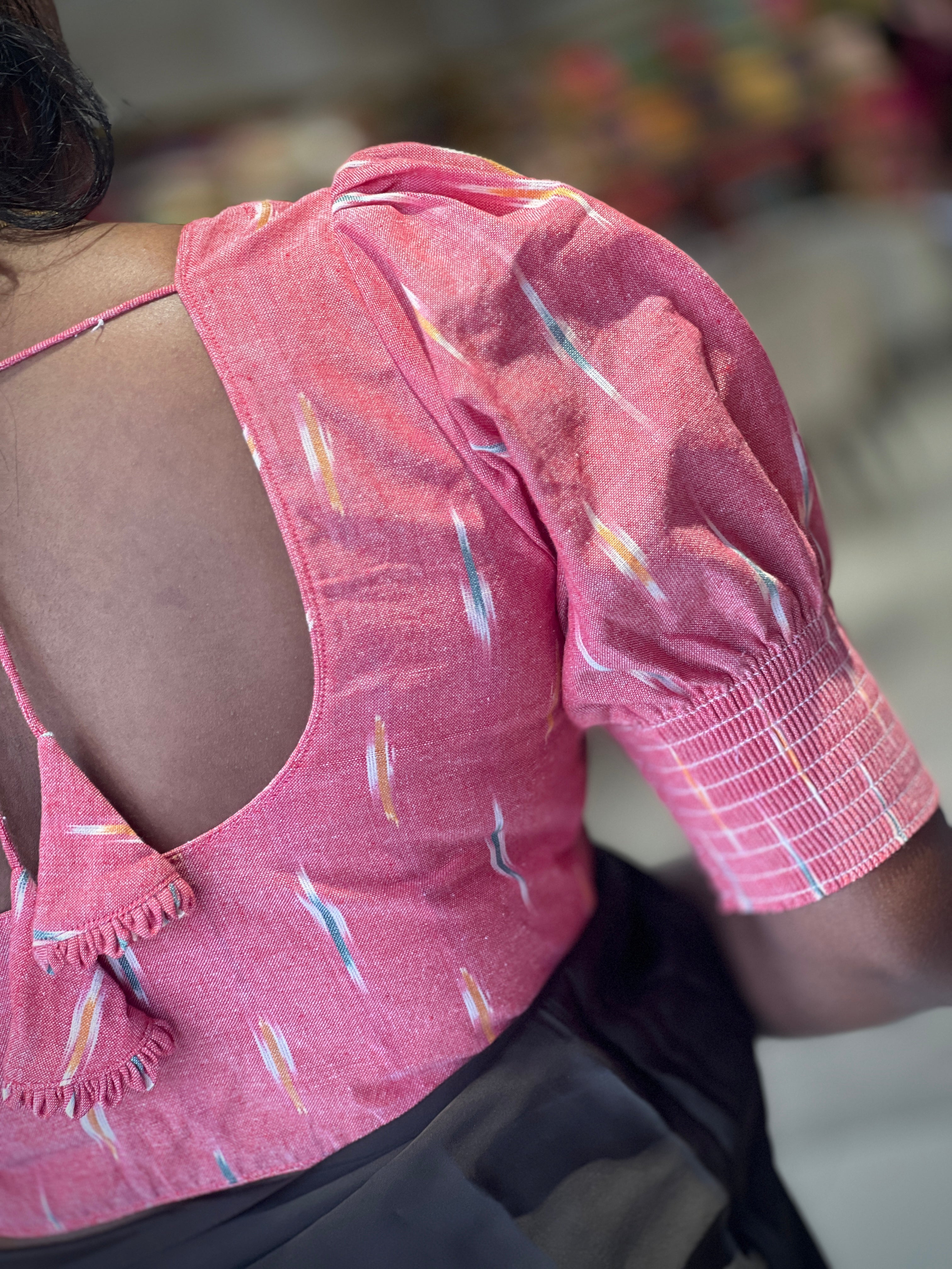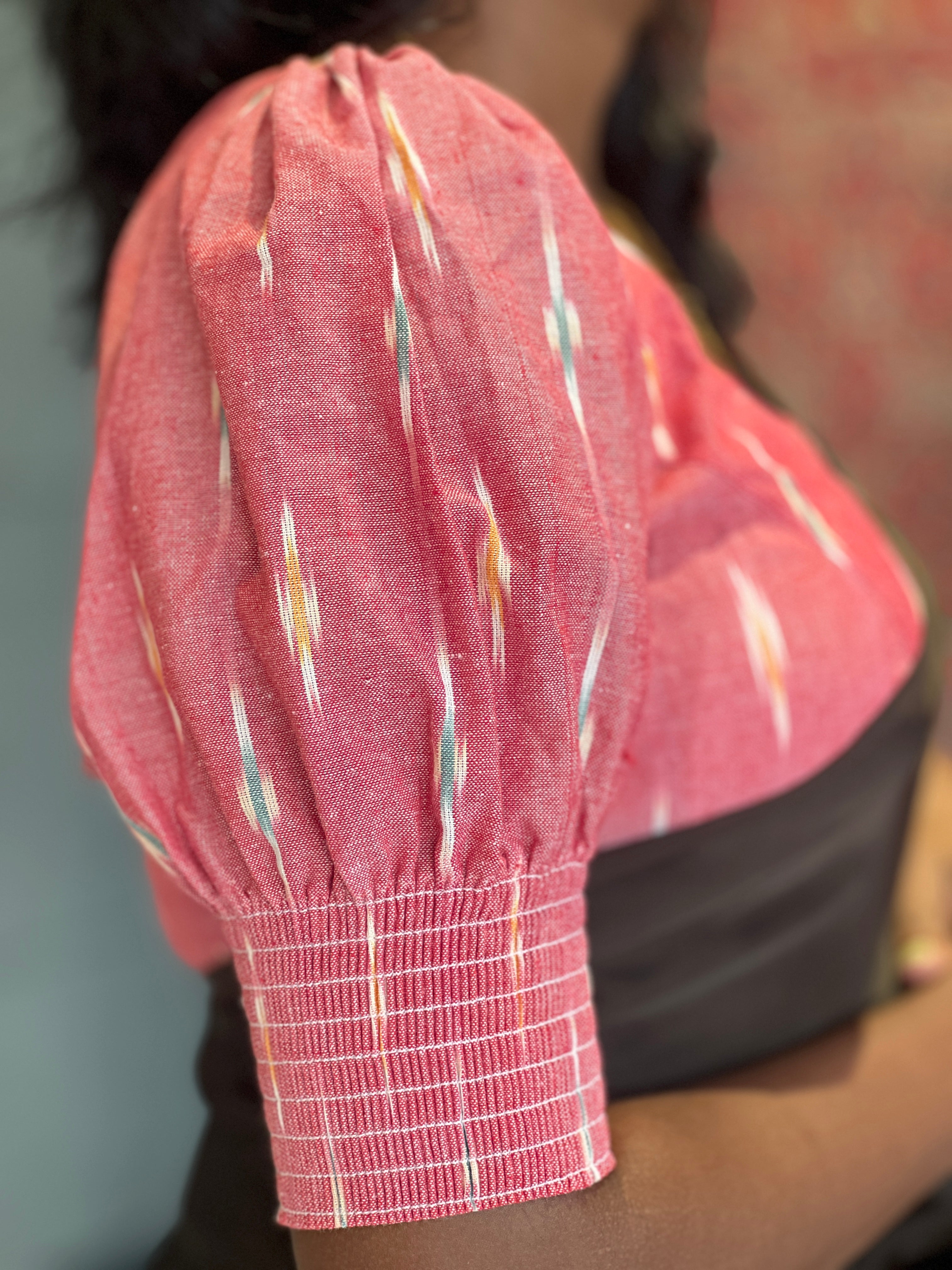 - Style: Ikat Weaving Pattern ,Princess Cut, Padded, Lining, Puff Sleeve With Elastic, Back Tie-Up Detailing
