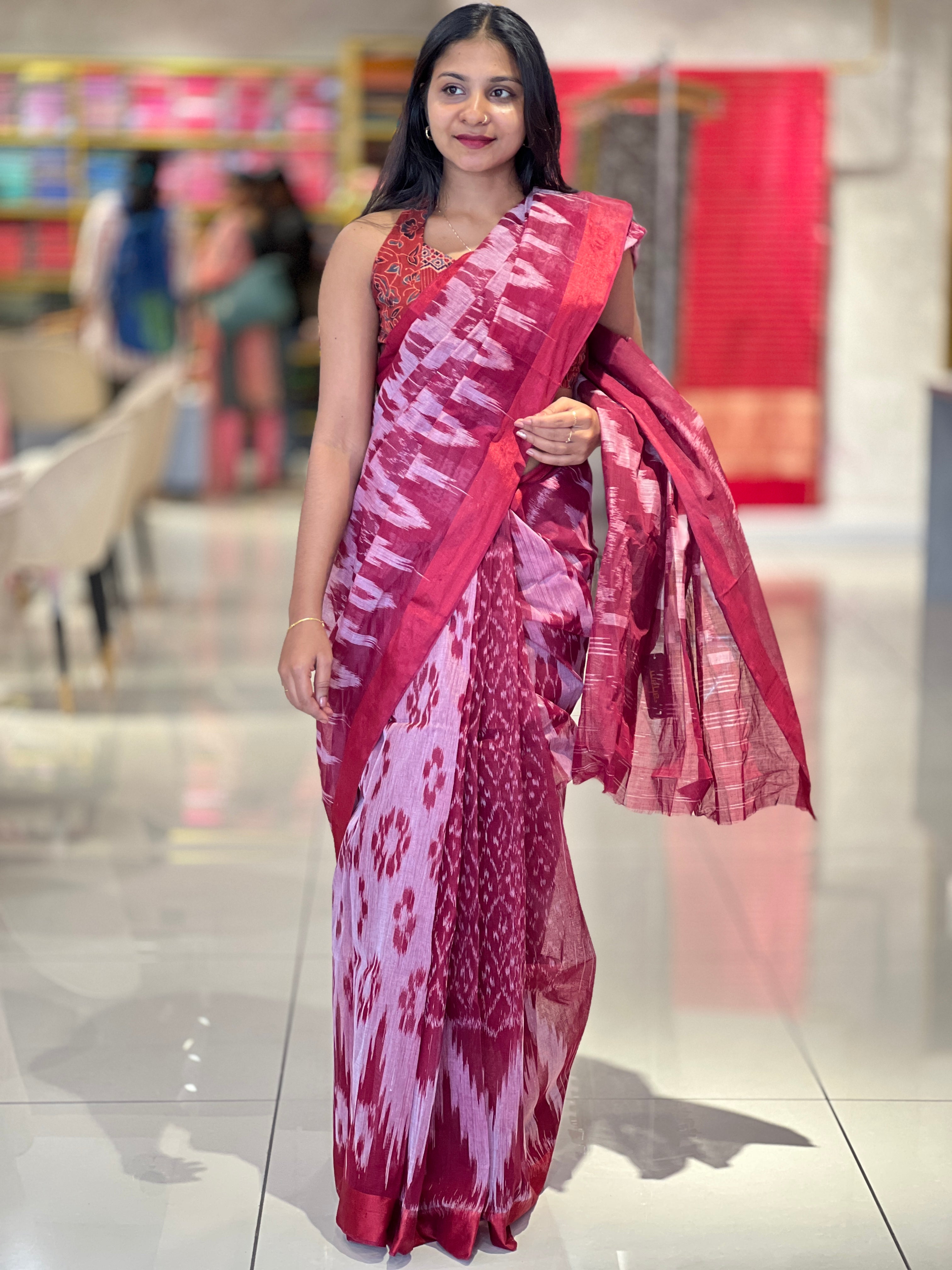 • Style: Ikat Weaving Pattern, Contrast Solid Borders, Geometric Patterned Pallu, Floral Pattern