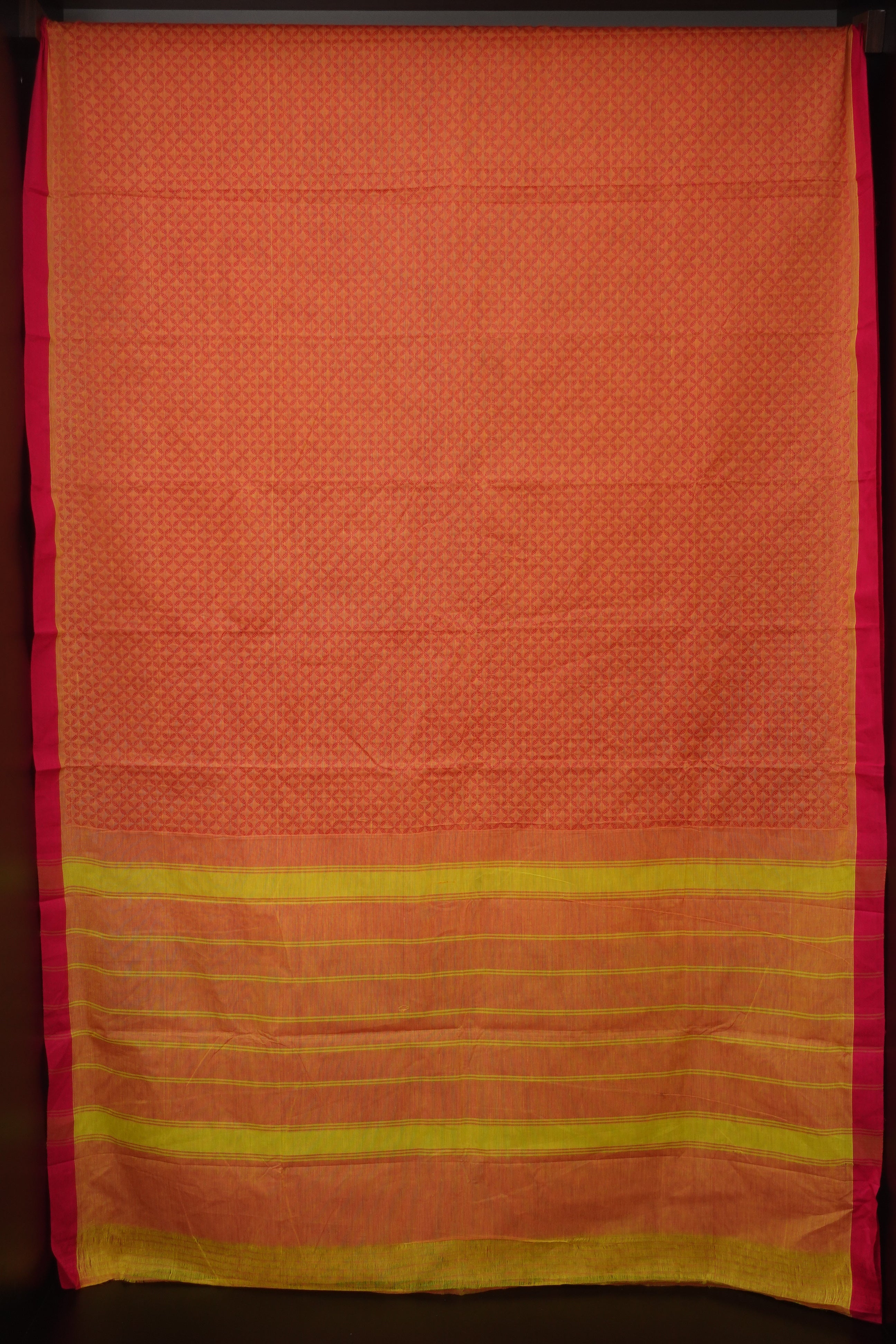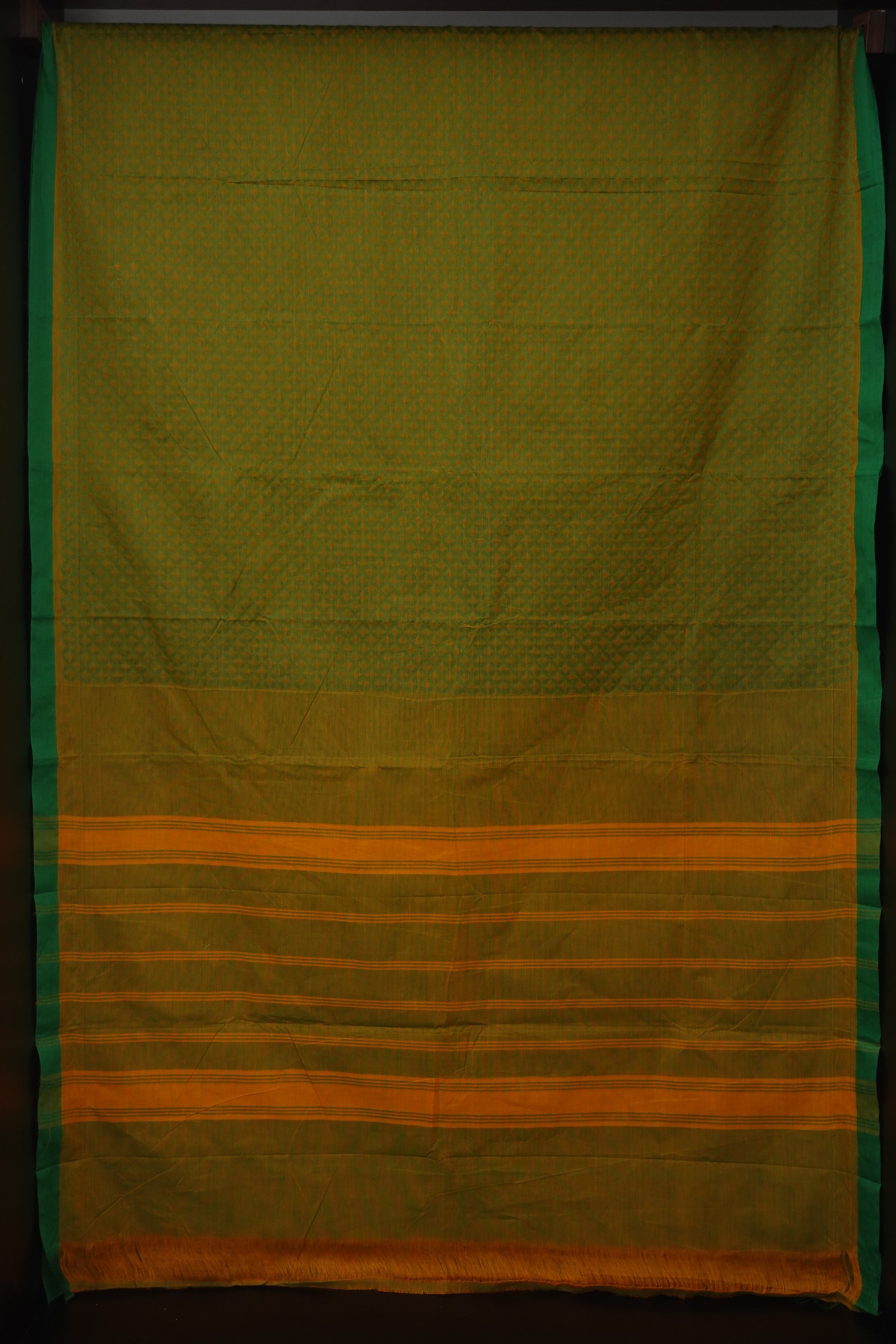 Jacquard weaved Chettinad cotton sarees with check weave patterns throughout the saree, contrast colour upper & lower border design pattern and simple line pattern weaved pallu portion. These sarees have no blouse pieces.