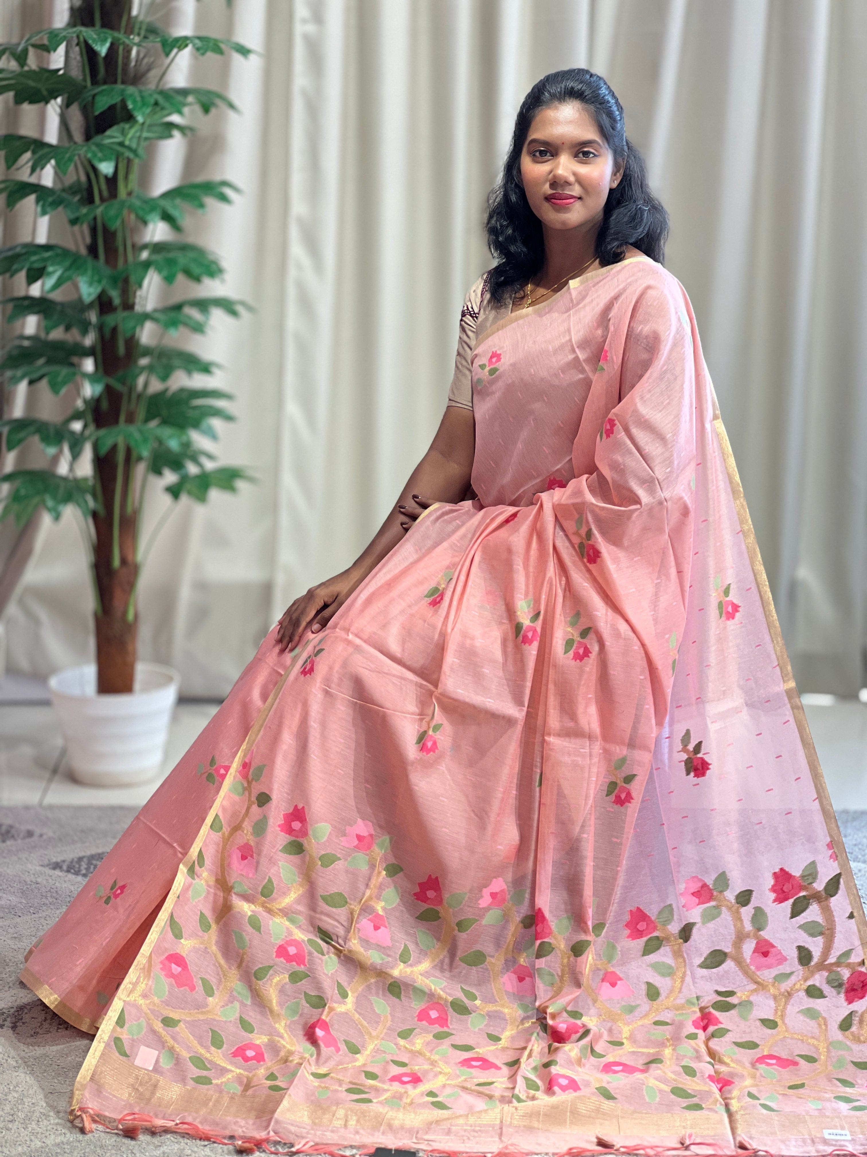 • Style: Scattered Floral Buta, Jamdani Weaving Pattern, Zari Borders, Tassels Detailing
