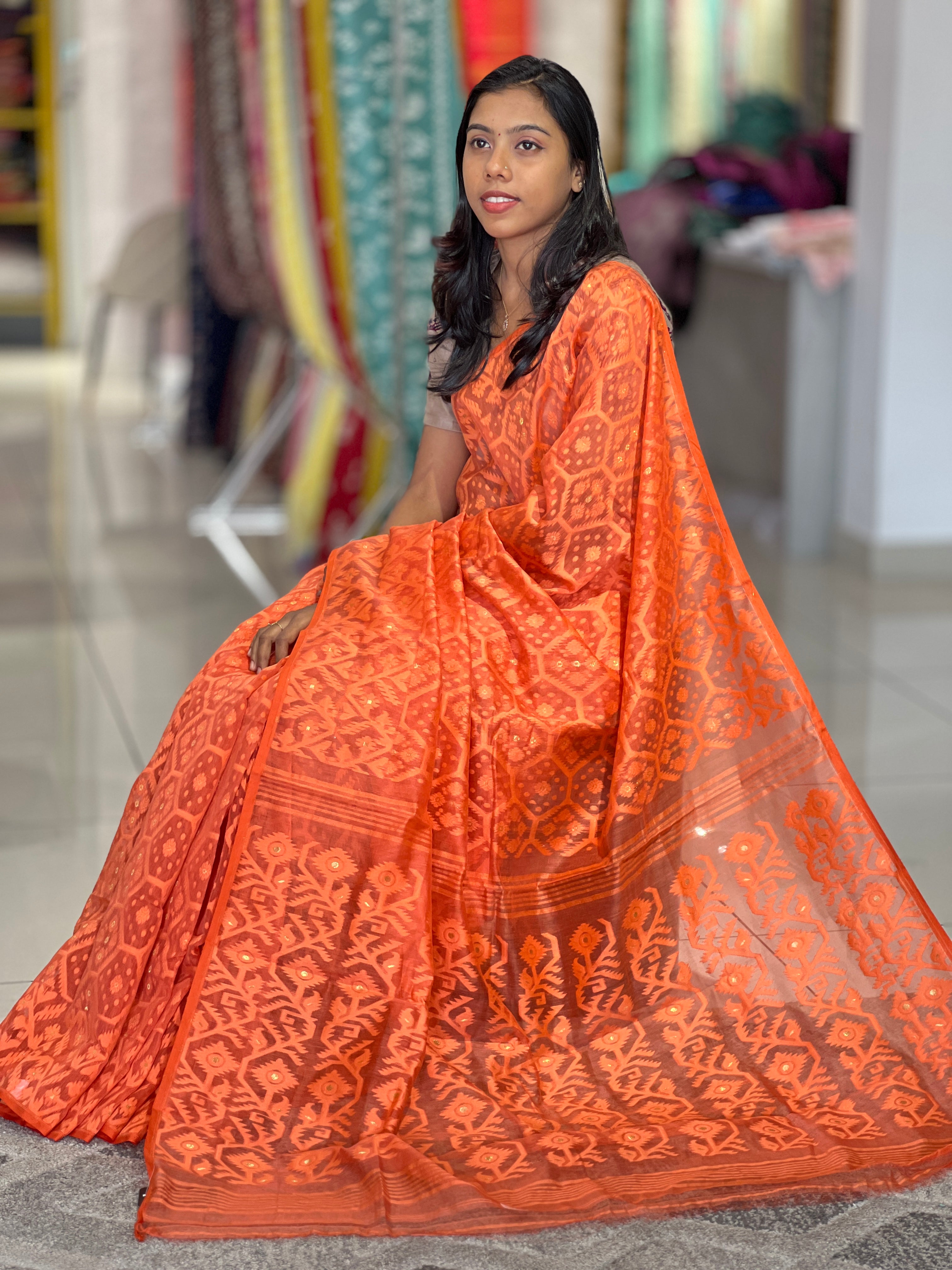 - Style: Jamdani Weaved, Honey Comb Pattern, With Golden Zari Highlight