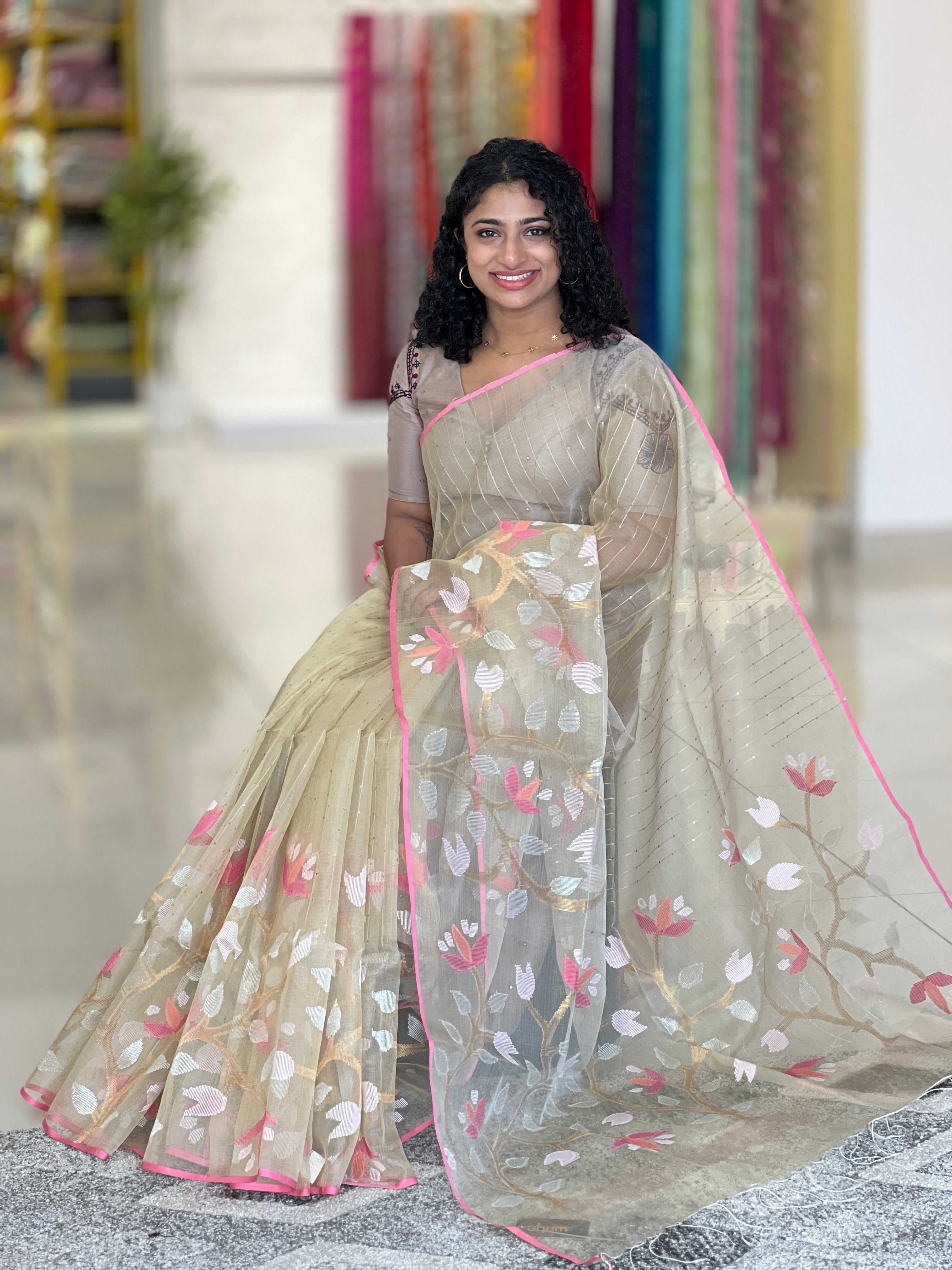 - Style: Jamdani Weaving Pattern, Hand Woven, Line Pattern With Sequence Weaving, Floral Jaal Designed Pallu & Border