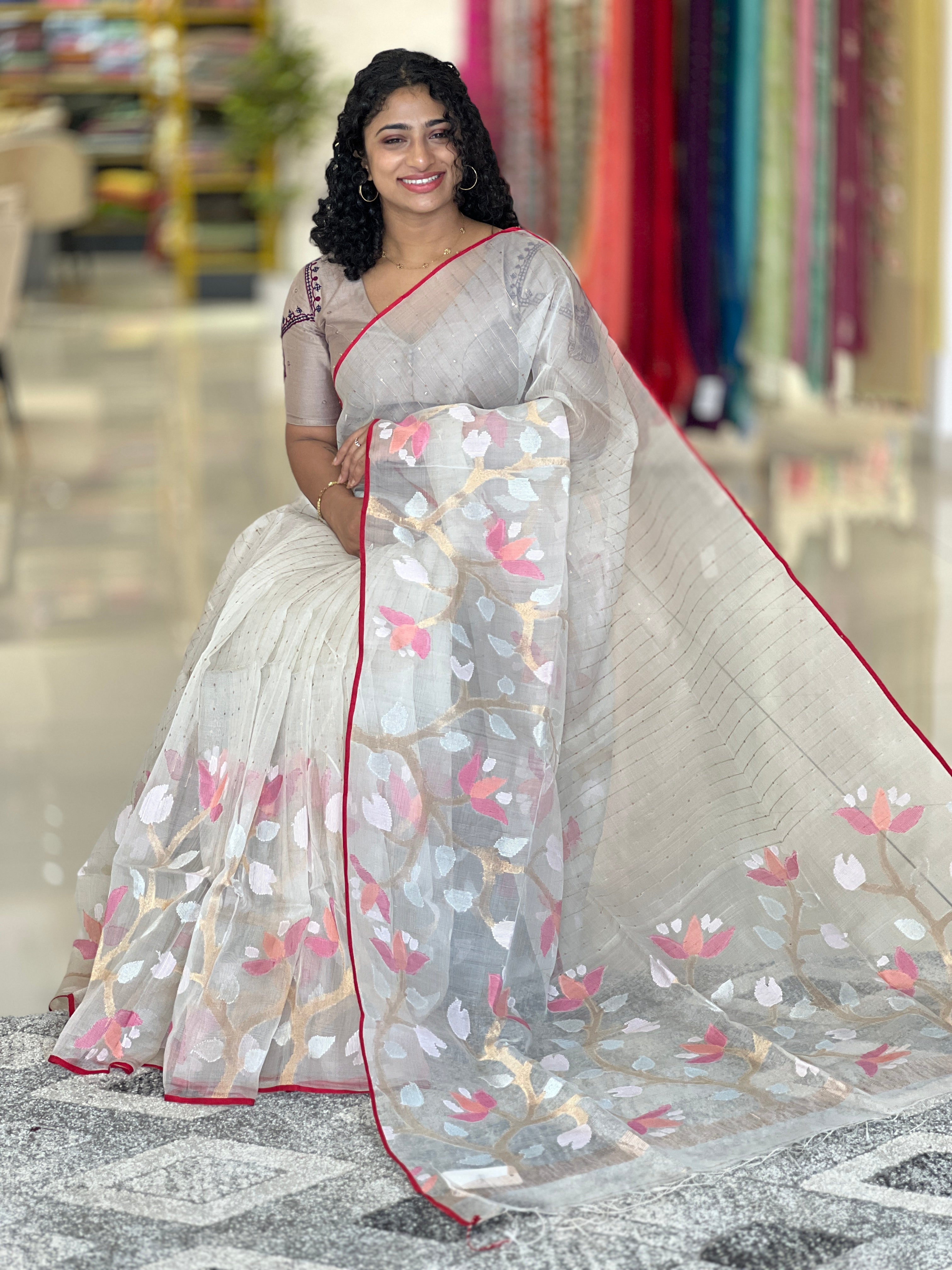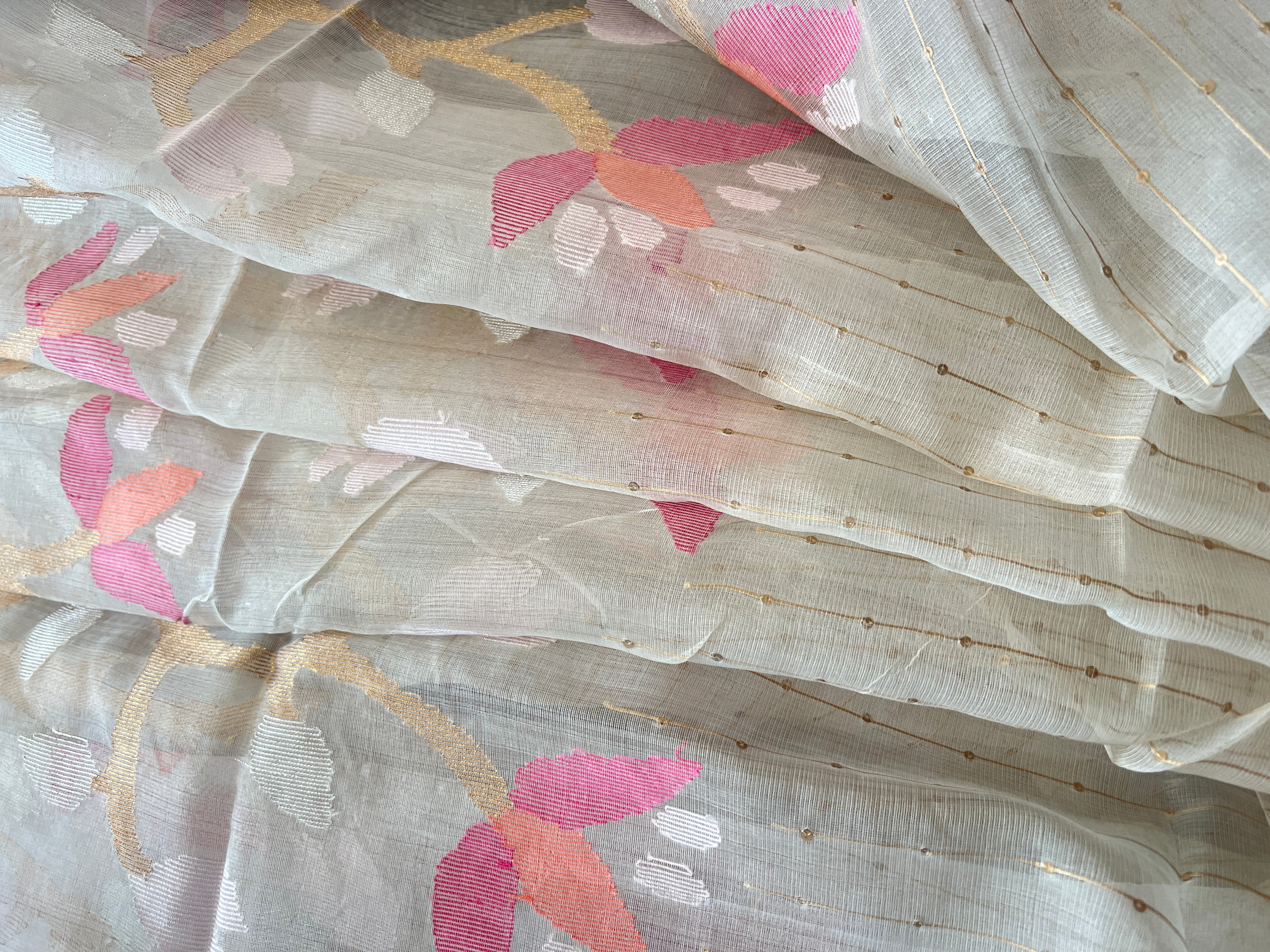 - Style: Jamdani Weaving Pattern, Hand Woven, Line Pattern With Sequence Weaving, Floral Jaal Designed Pallu & Border