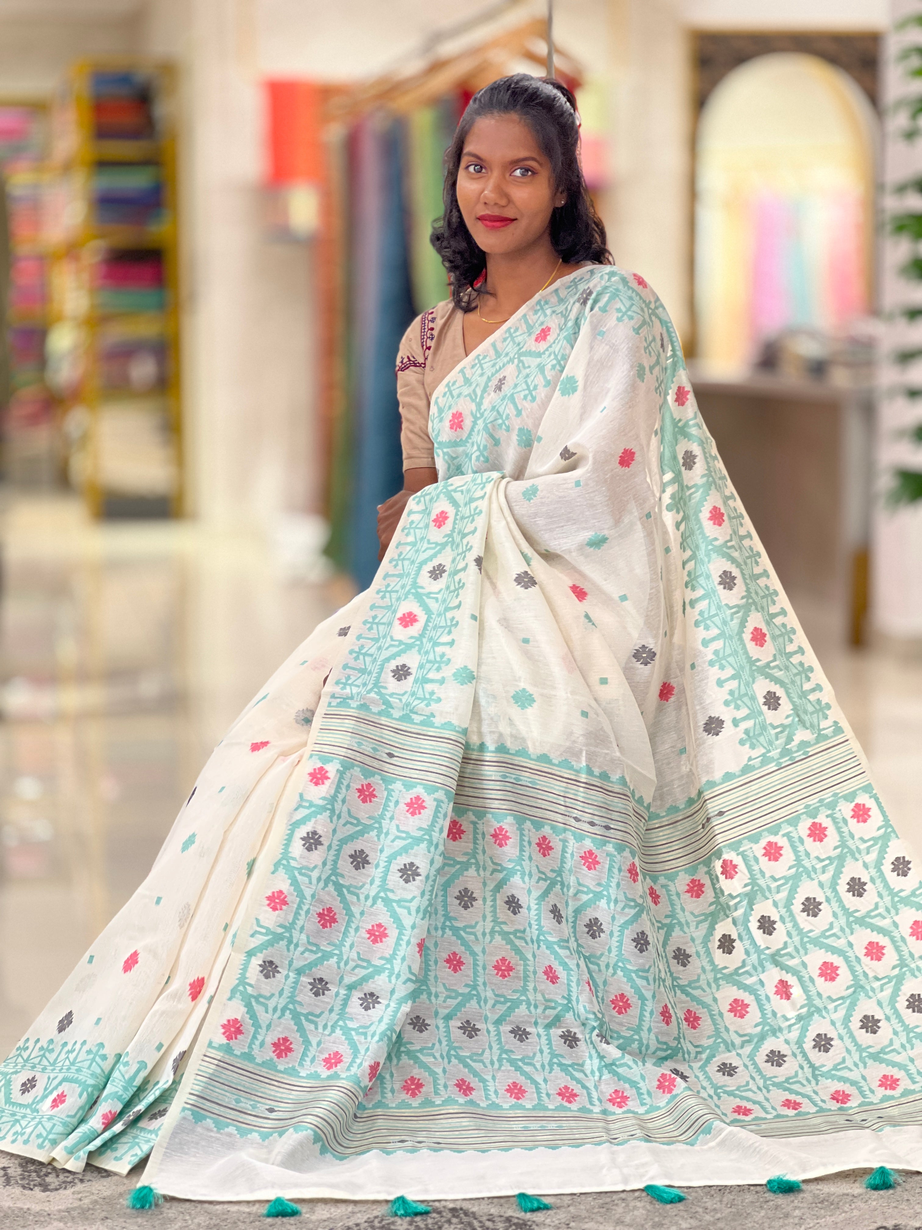 - Style: Jamdani Weaving Pattern, Multi-Color Thread Woven, Zari Highlight, Tassels Attached