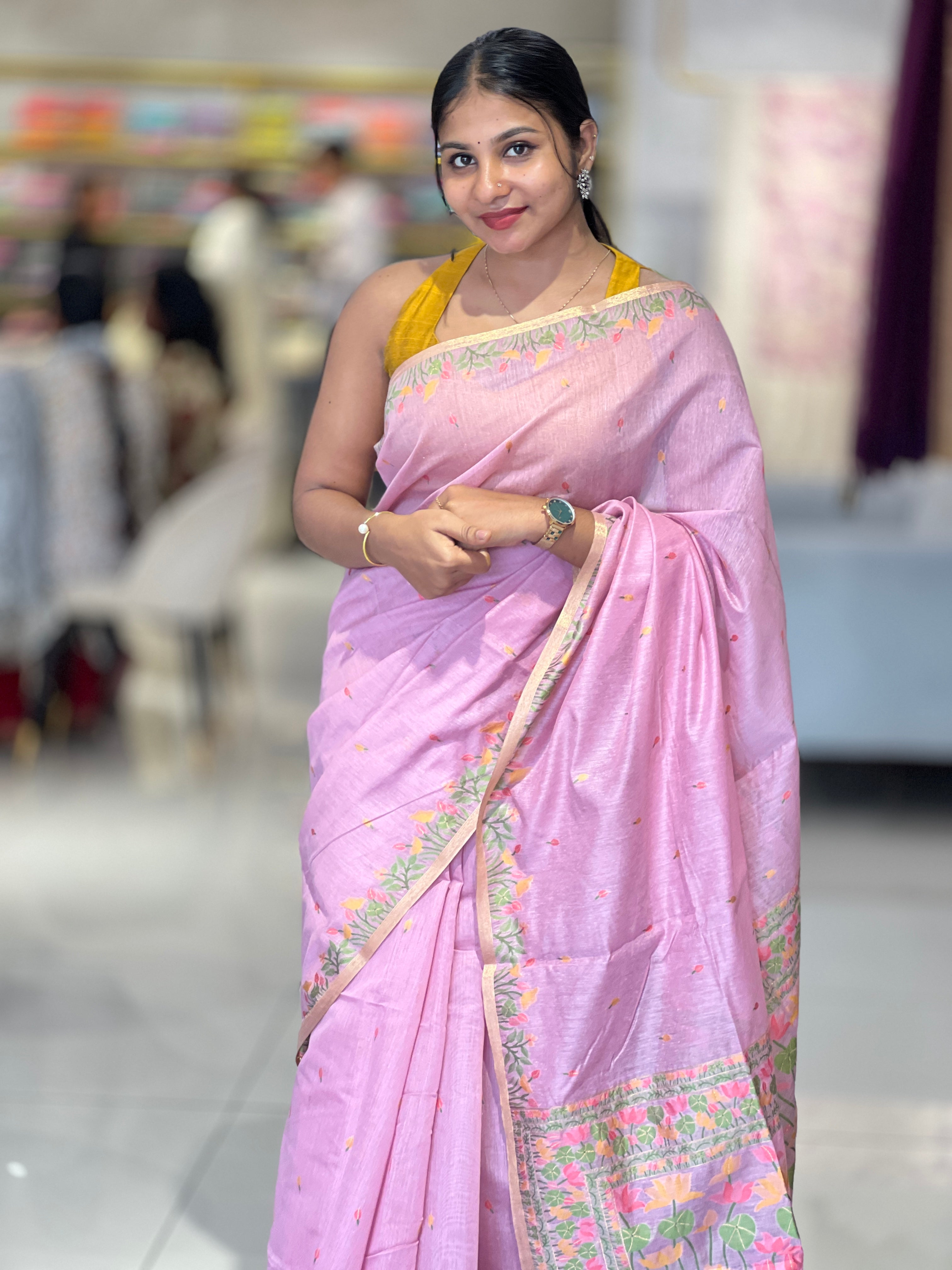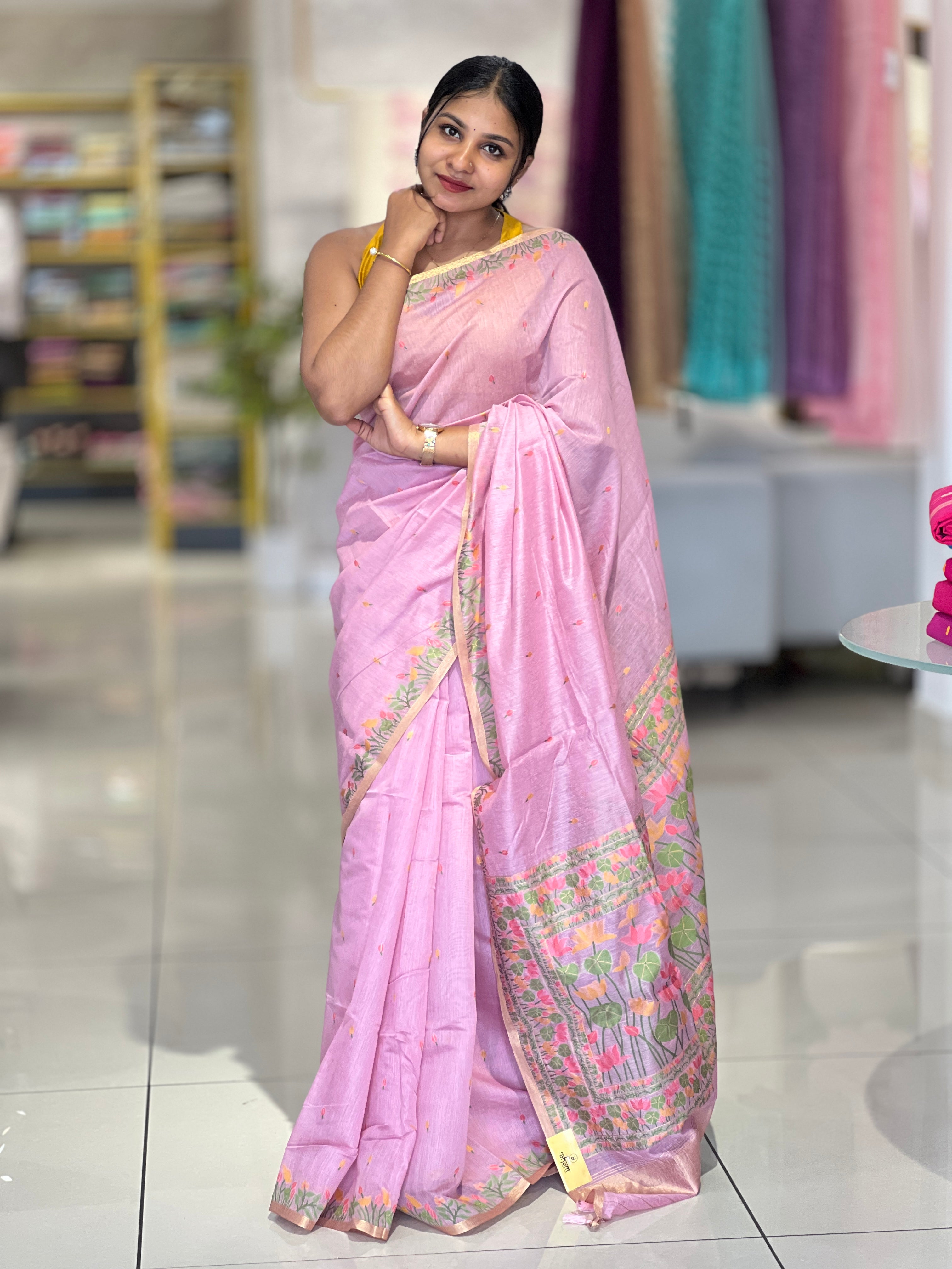 - Style: Jamdani Weaved,Scattered Motif, Lotus and Leaf Designed Pallu, Zari Border Detailing, Tassels Attached