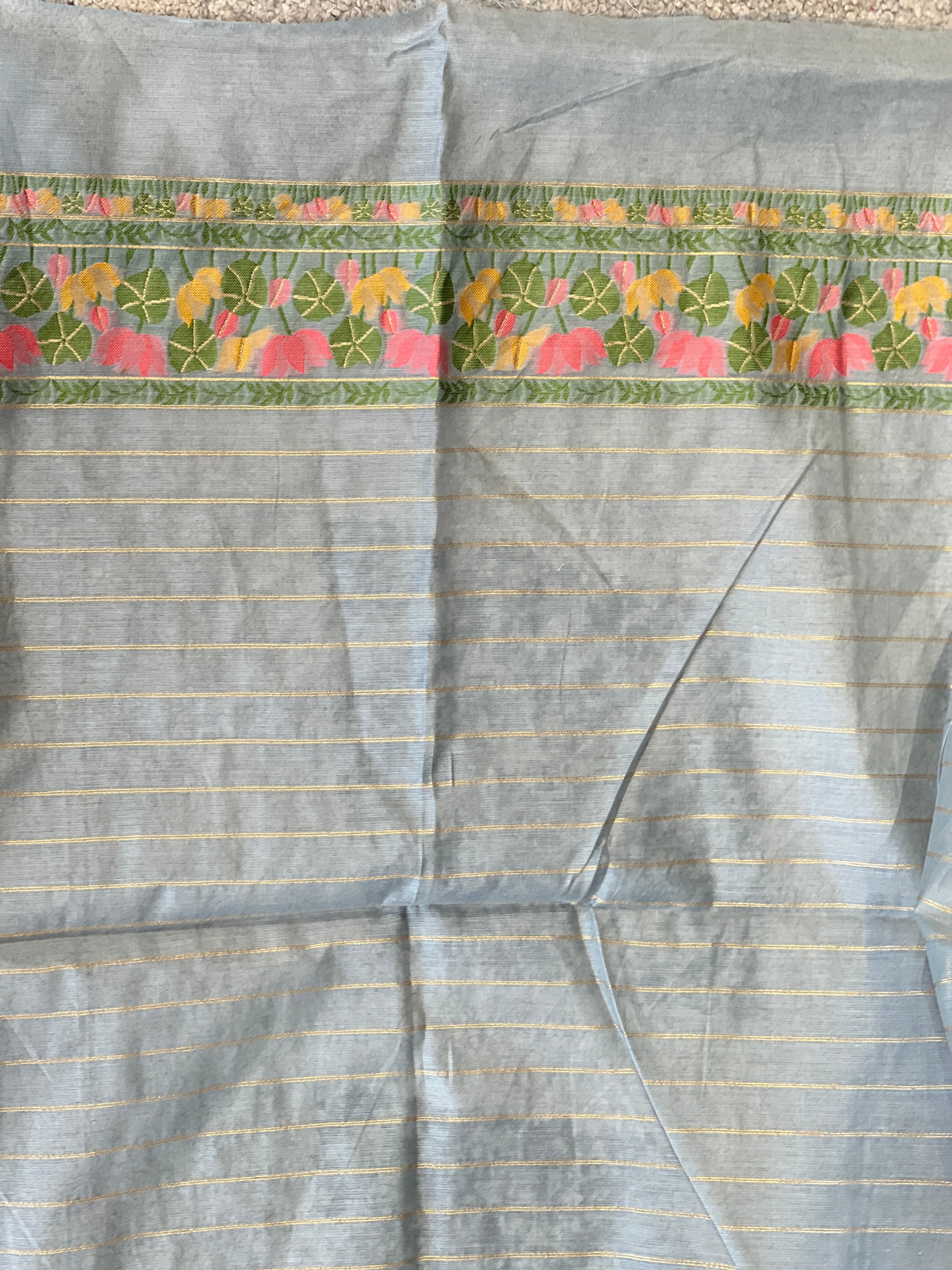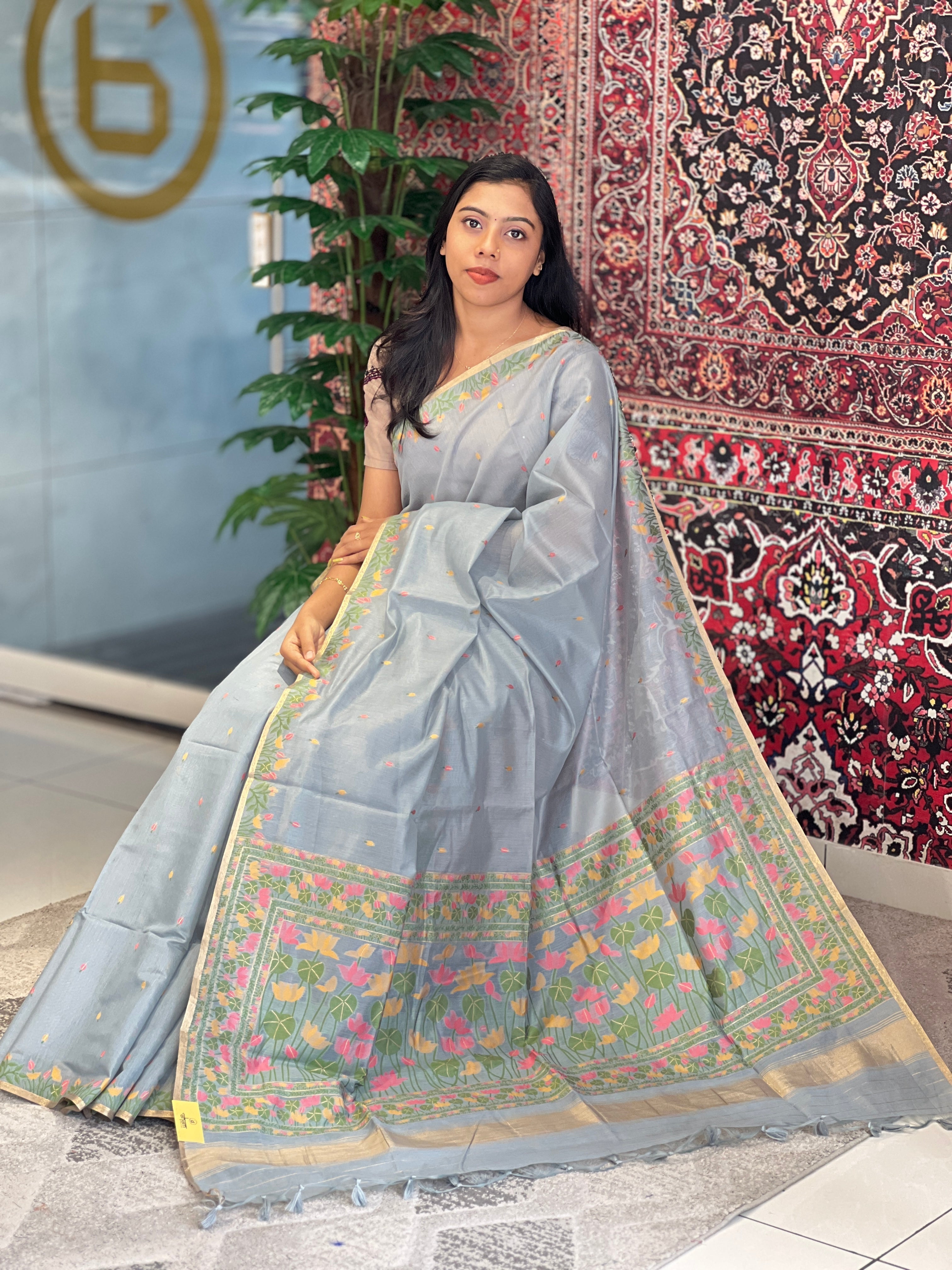 - Style: Jamdani Weaved, Scattered Motif, Lotus and Leaf Designed Pallu, Zari Border Detailing, Tassels Attached
