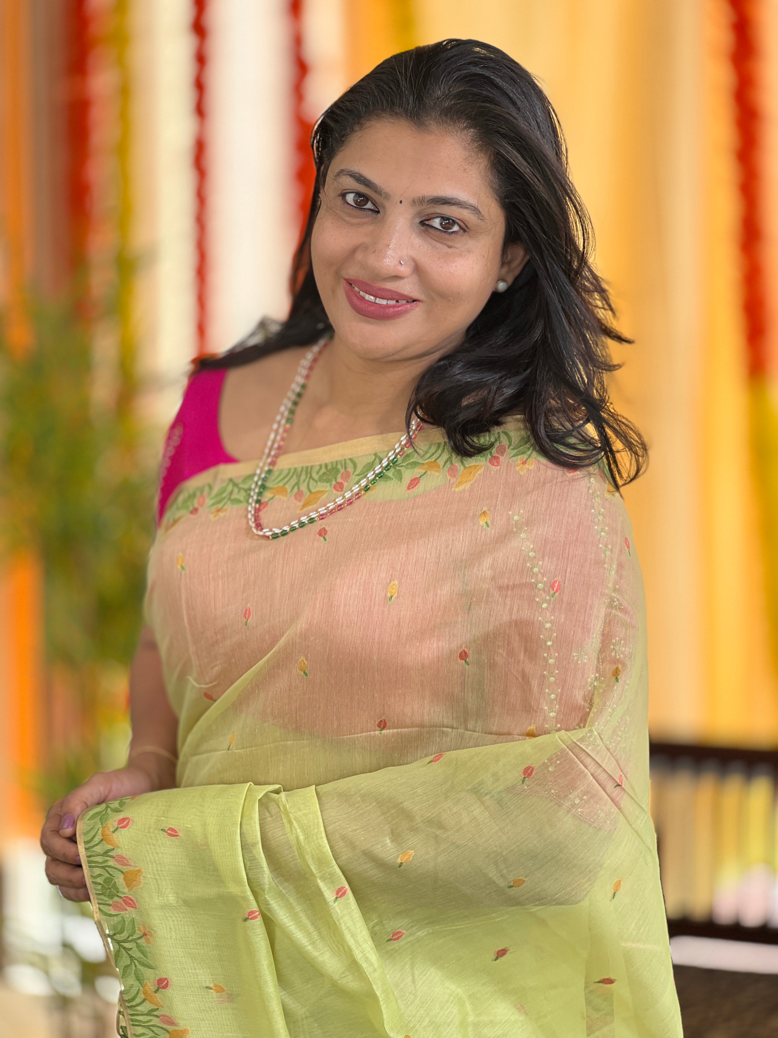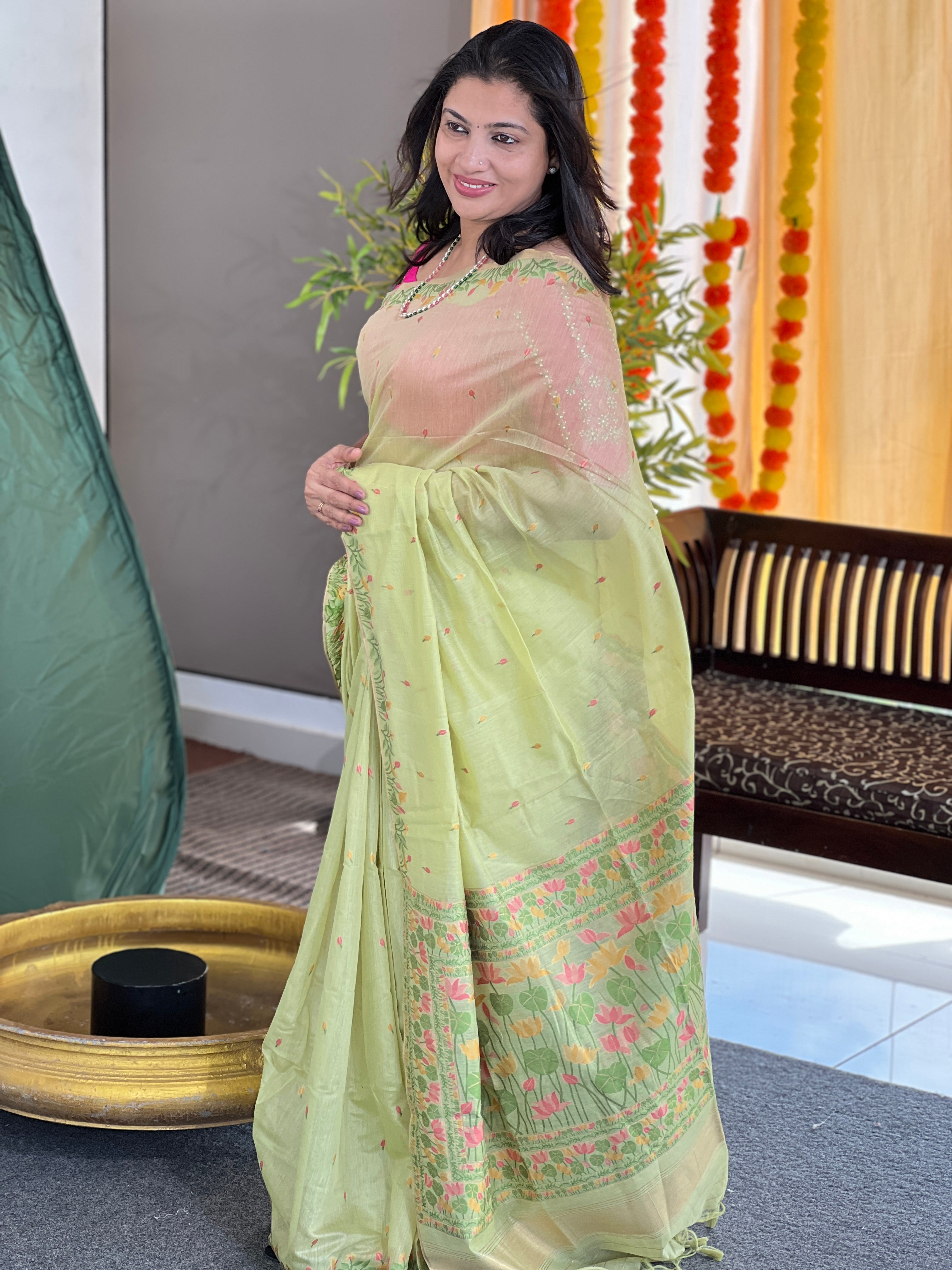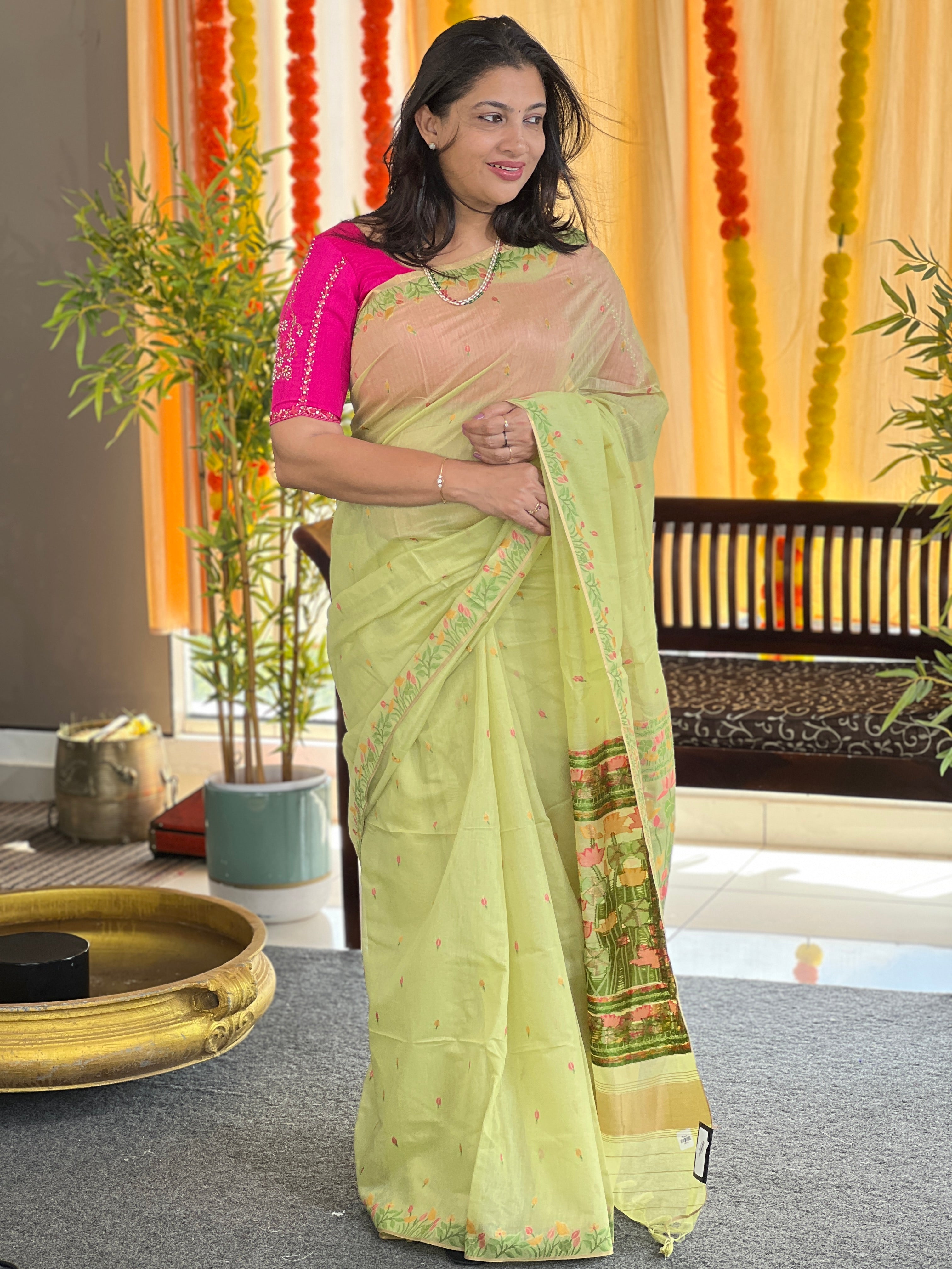 - Style: Jamdani Weaved,Scattered Motif, Lotus and Leaf Designed Pallu, Zari Border Detailing, Tassels Attached
