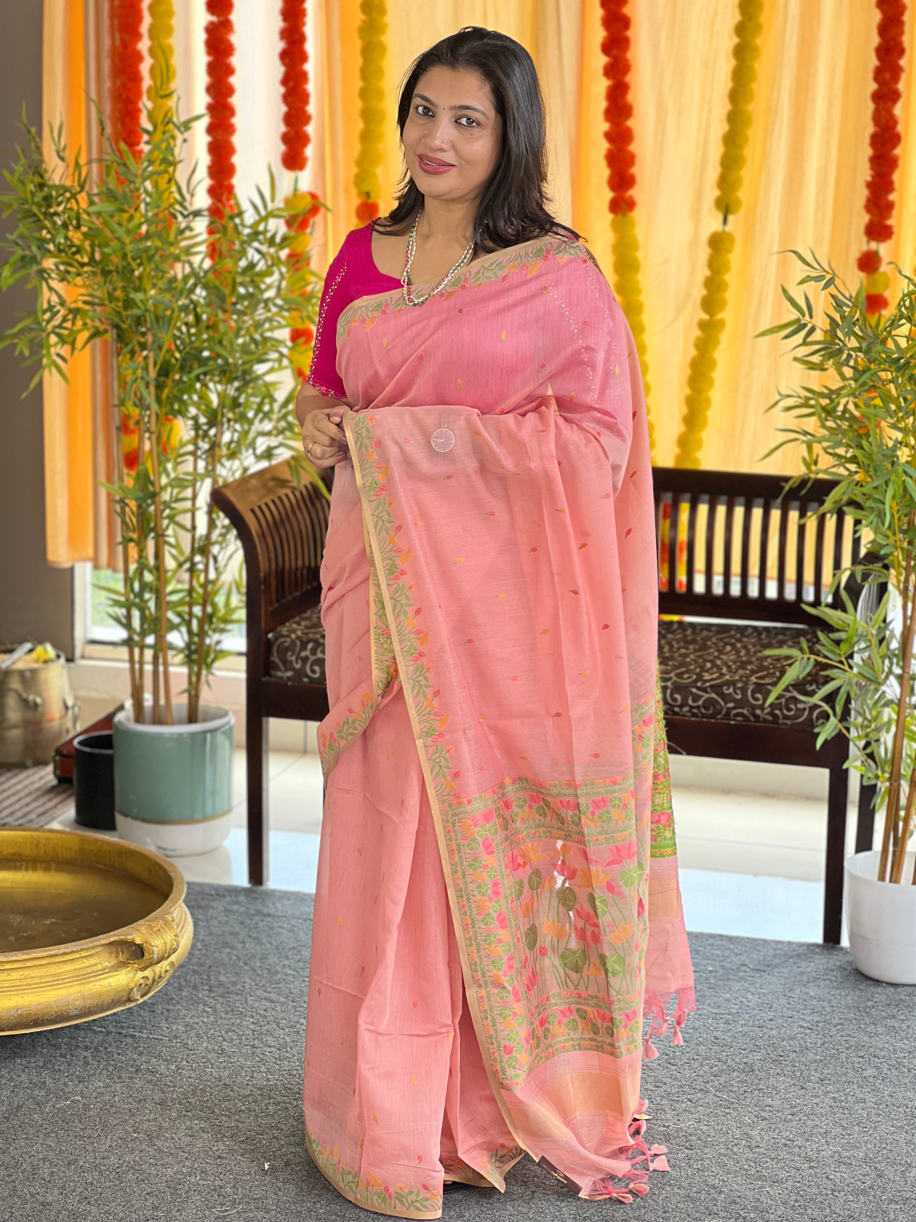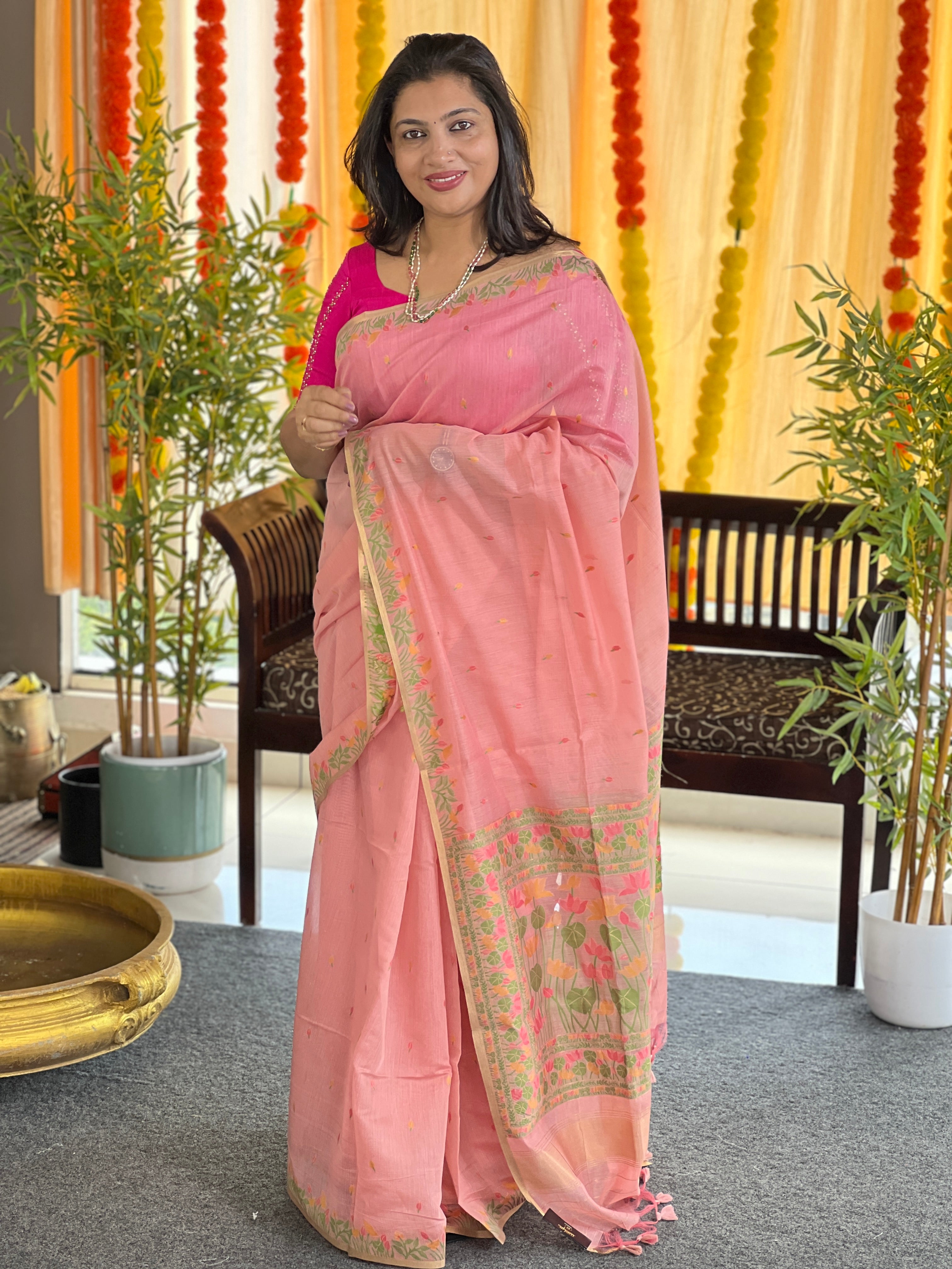 • Jamdani Weaved Lotus Detailed Bagalpuri Linen Saree | SSN210
