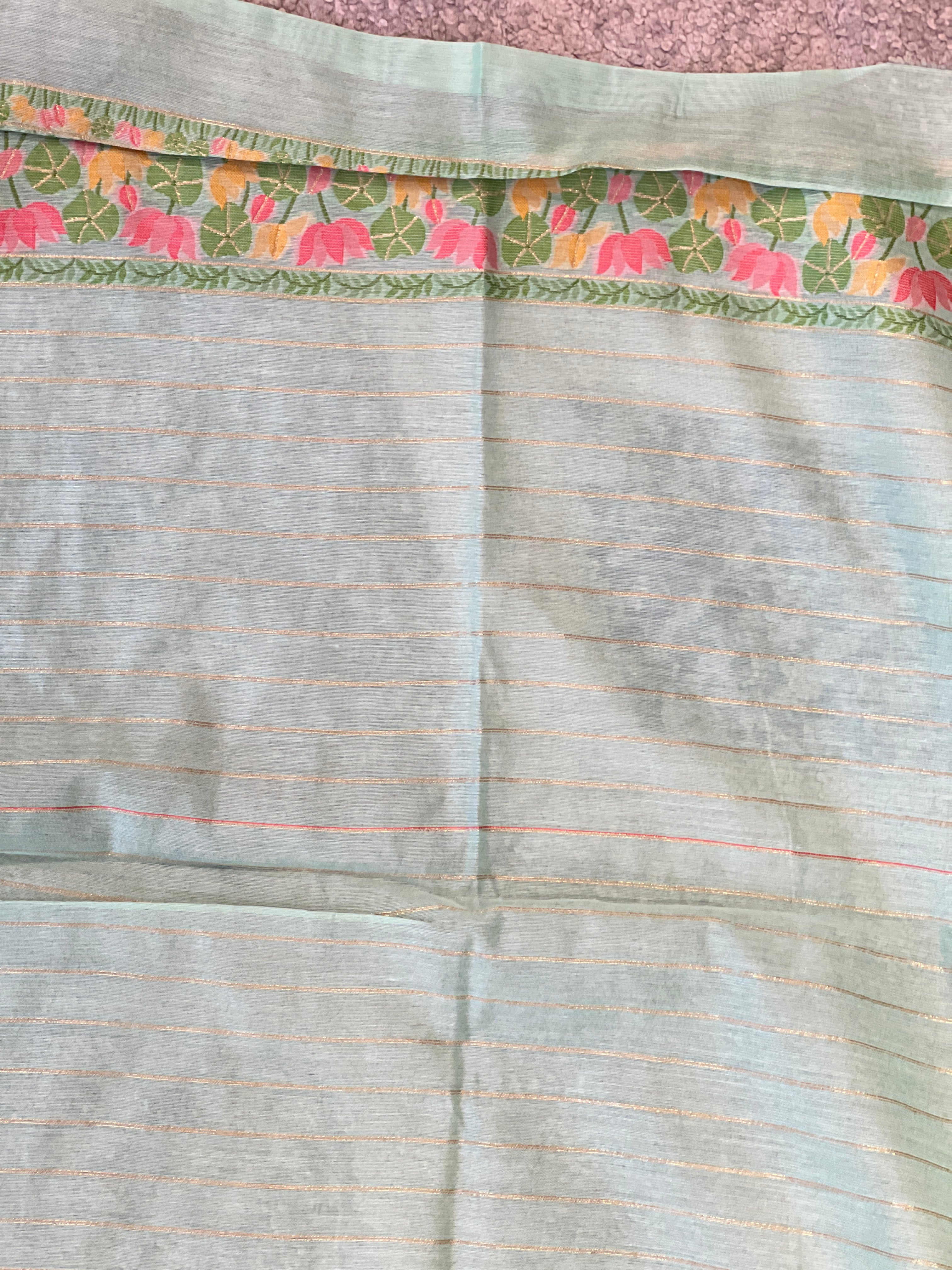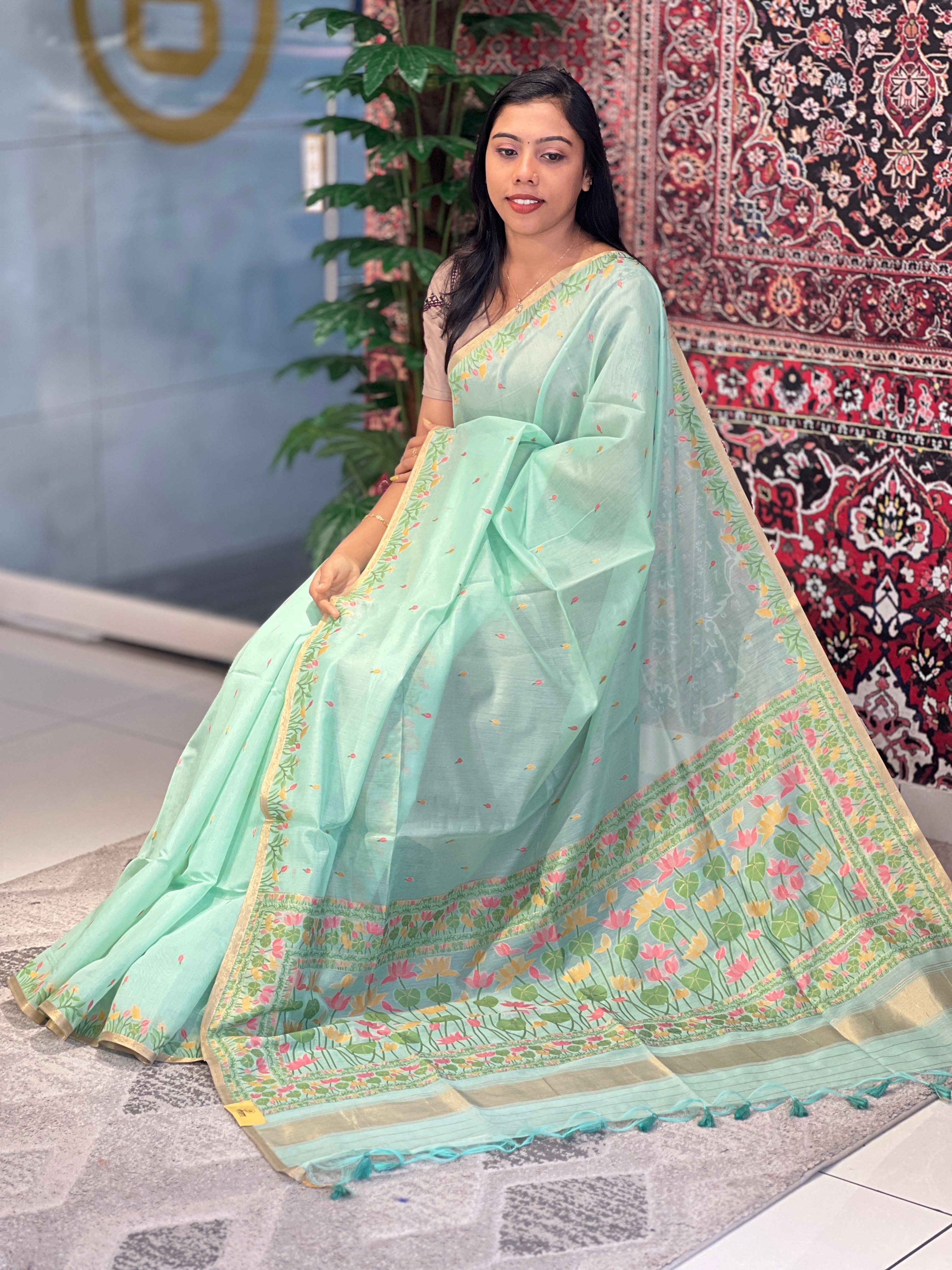 - Style: Jamdani Weaved,Scattered Motif, Lotus and Leaf Designed Pallu, Zari Border Detailing, Tassels Attached
