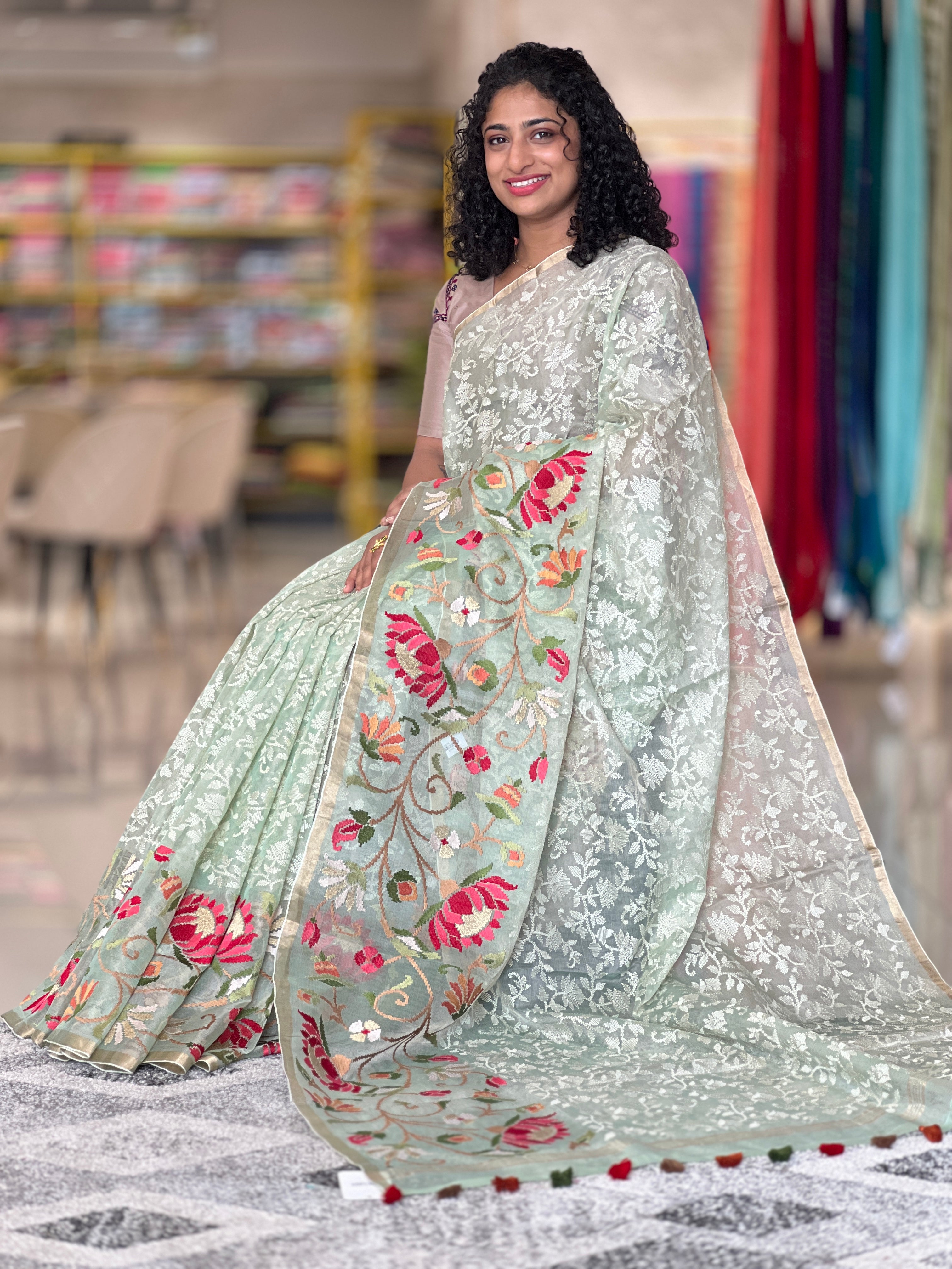 • Jamdani Weaving Floral Embroidery Kora Organza Saree | RGD285