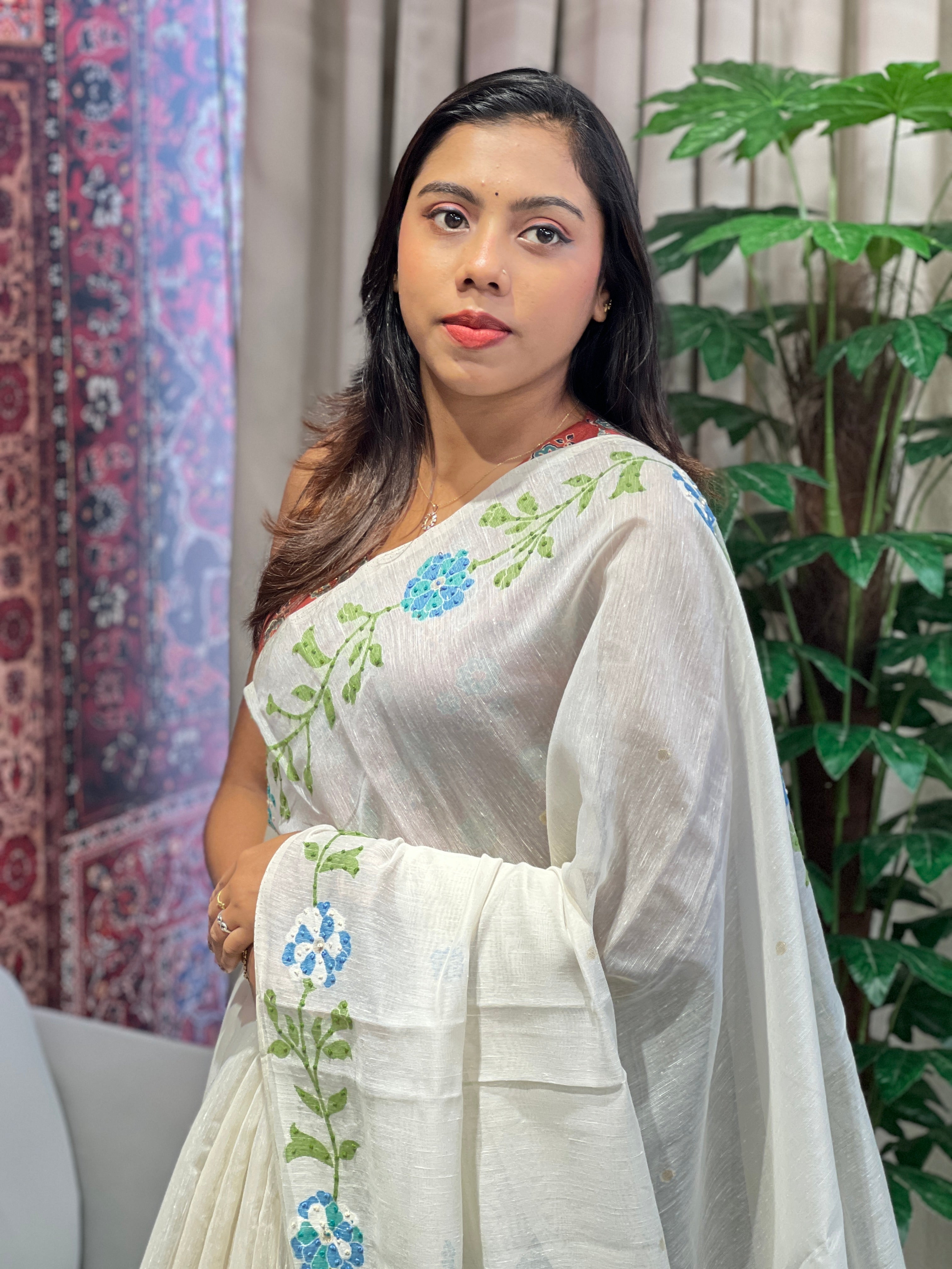 - Style: Jamdani Woven With Hand Embroidery With Sequins Highlight, Floral pattern, Zari Detailed Pallu, Tassels Detailing