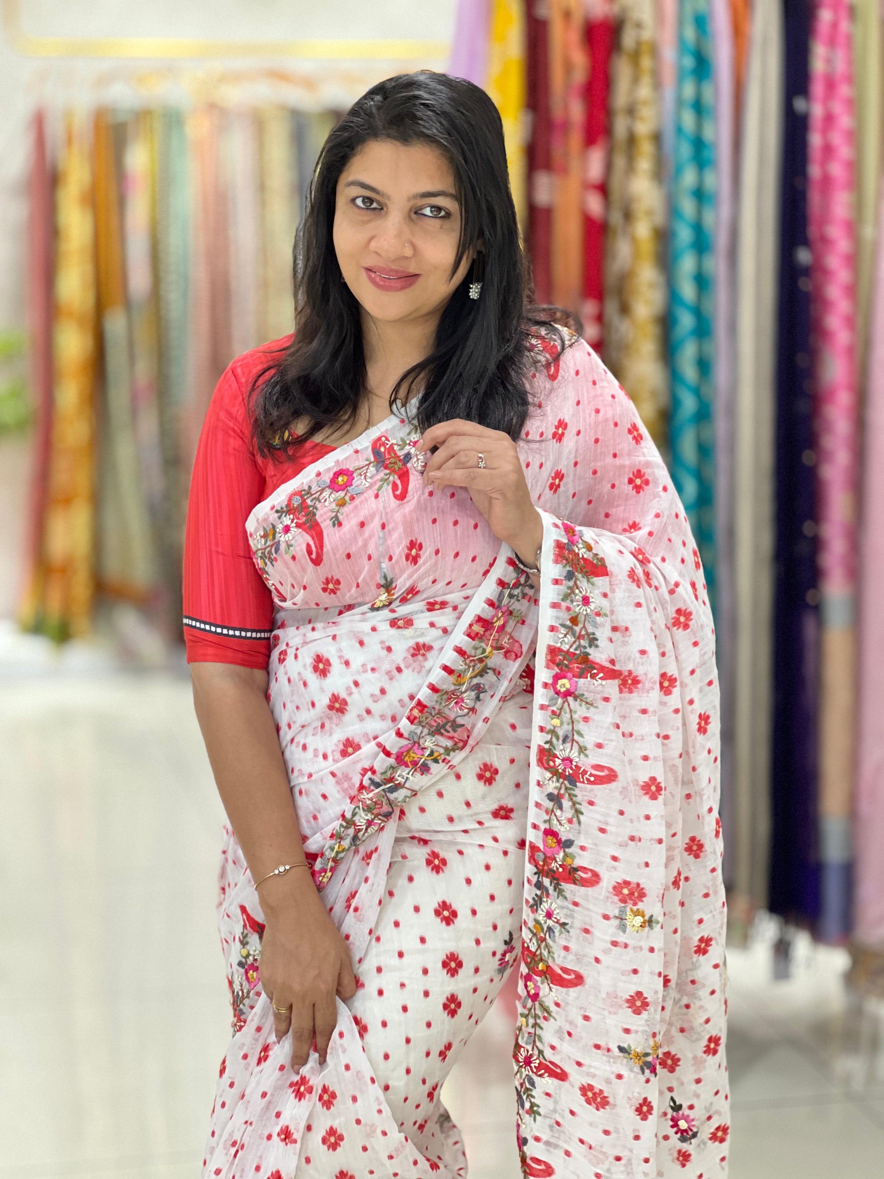 - Style: Jamdani Woven, Traditional Kolkata Hand Embroidery Detailing