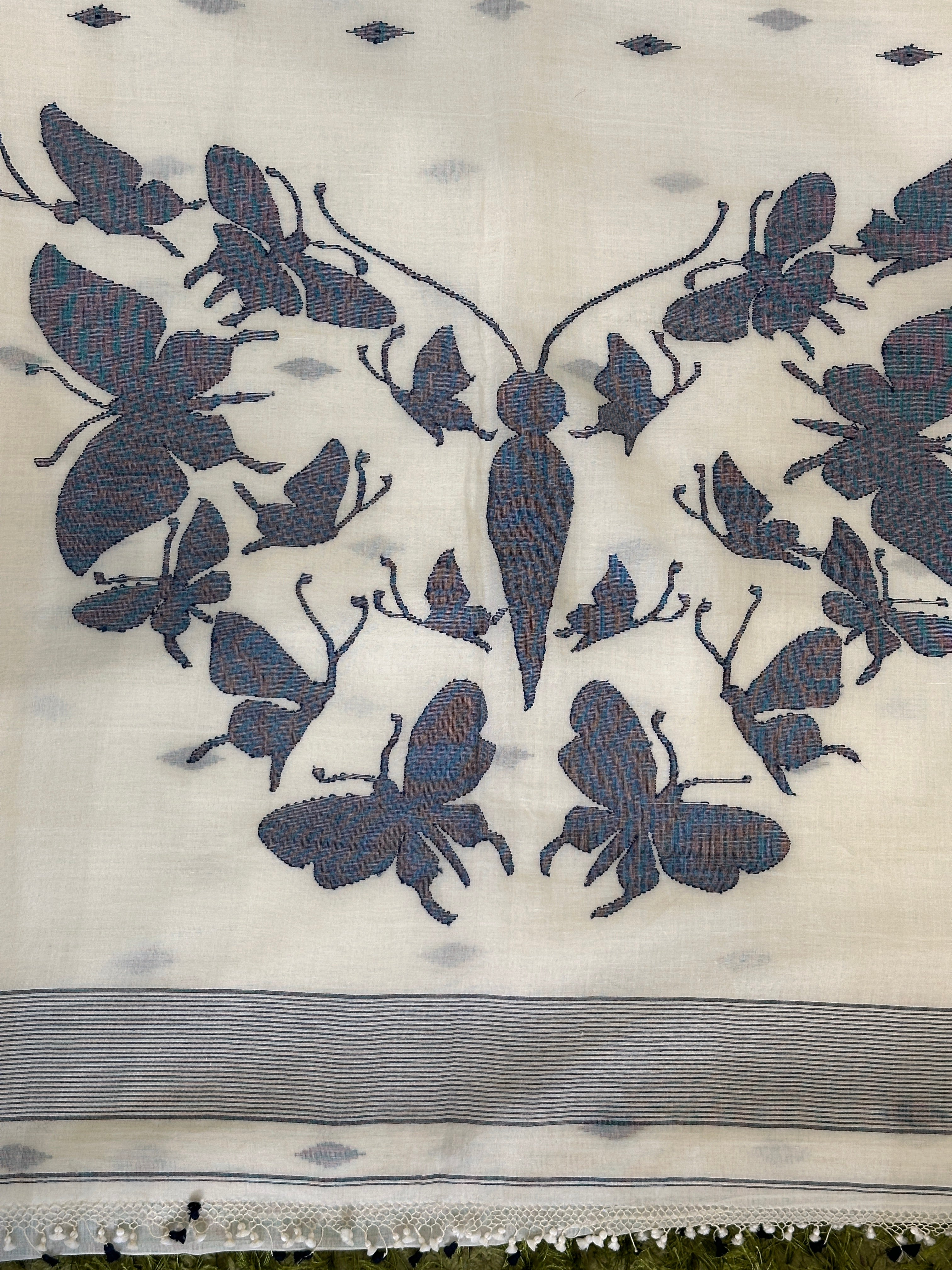 - Style: Traditional Handloom, Jamdani Woven, Scattered Butta, Butterfly Pattern, Tassels Detailing